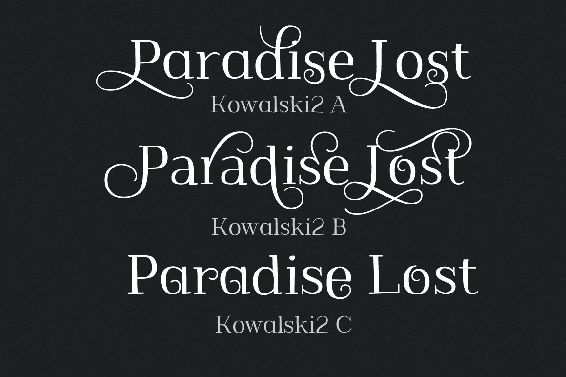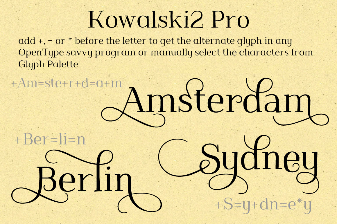 Kowalski2 is a decorative, serif, hand-drawn font. It can be used for invitations, greeting cards, posters, advertising, weddings, books, menus etc. The inspiration came from the beautiful font Desire designed by Charles Borges de Oliveira. Kowalski2 Pro is the most complete style, it contains all the alternates and ligatures. To get the alternate glyph just add “+”, “=” or “*” before the letter in any OpenType savvy application or manually select the characters from Glyph Palette. Kowalski2 Basic has the basic character set with 345 glyphs and no alternates. Kowalski2 A, Kowalski2 B and Kowalski2 C have less glyphs than the Pro one, they only contain some selected alternates and ligatures. Language support includes Western, Central and Eastern European character sets, as well as Baltic and Turkish languages.