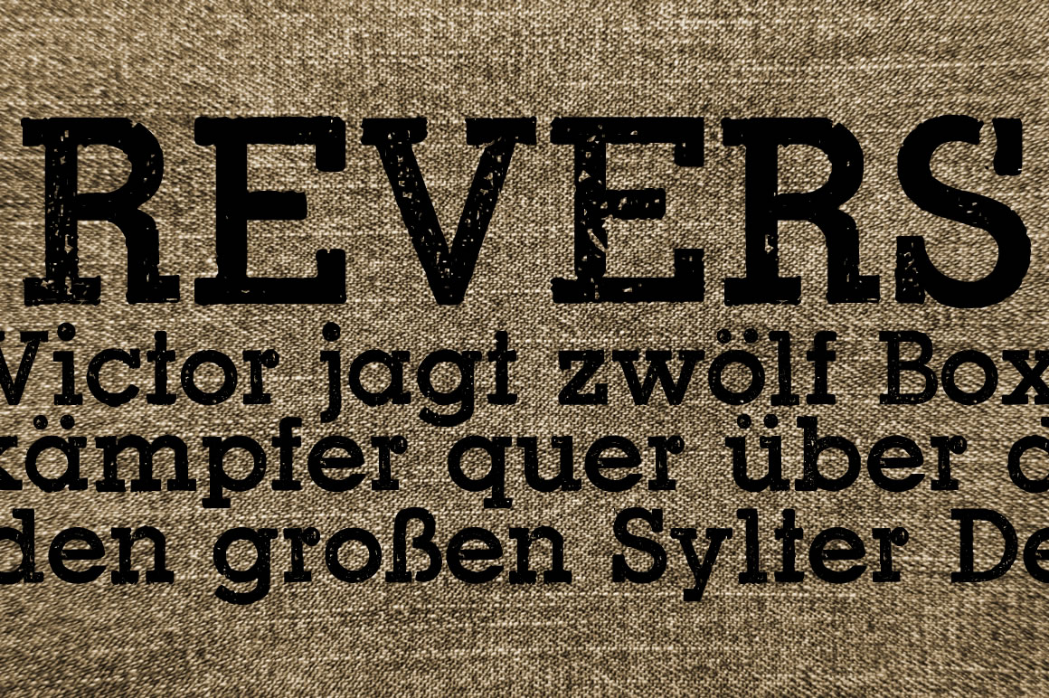Revers is a rough, grunge slab serif based on newspaper headlines from the 1950s. Language support includes Western, Central and Eastern European character sets, as well as Baltic and Turkish languages.
