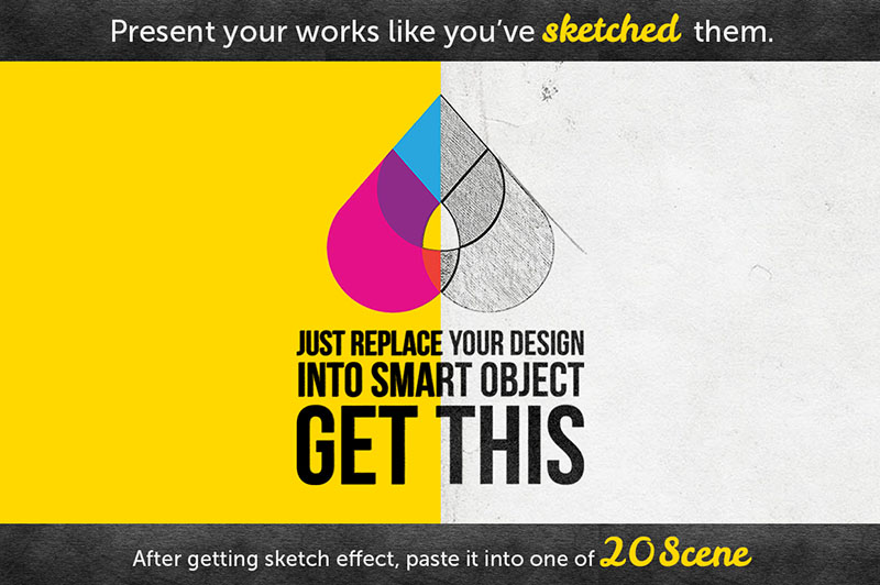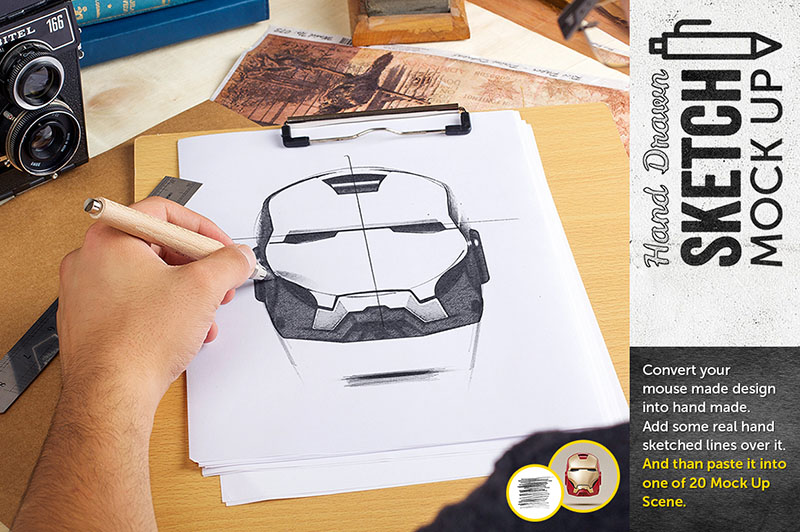This item includes; 20 Mock Up Scenes, Hand Drawn Effect Generator and Scanned Real Hand Sketched Lines. Now you can present your mouse made designs like it “sketched”. As you can see in preview image, you can convert any design into hand sketched style and drag&drop real scanned hand sketched lines into it. And than paste it into one of 20 Mock Up Scenes. When you look at mock up scenes you can see there are many variations. While hand drawing, while hand holding sketchbook, simple compositions, art equipments compositions etc. also there are paper type variations and different paper dimensions. White papers, kraft papers, black papers etc… Small sketch book, big watercolor paper, A4 standard paper etc…
