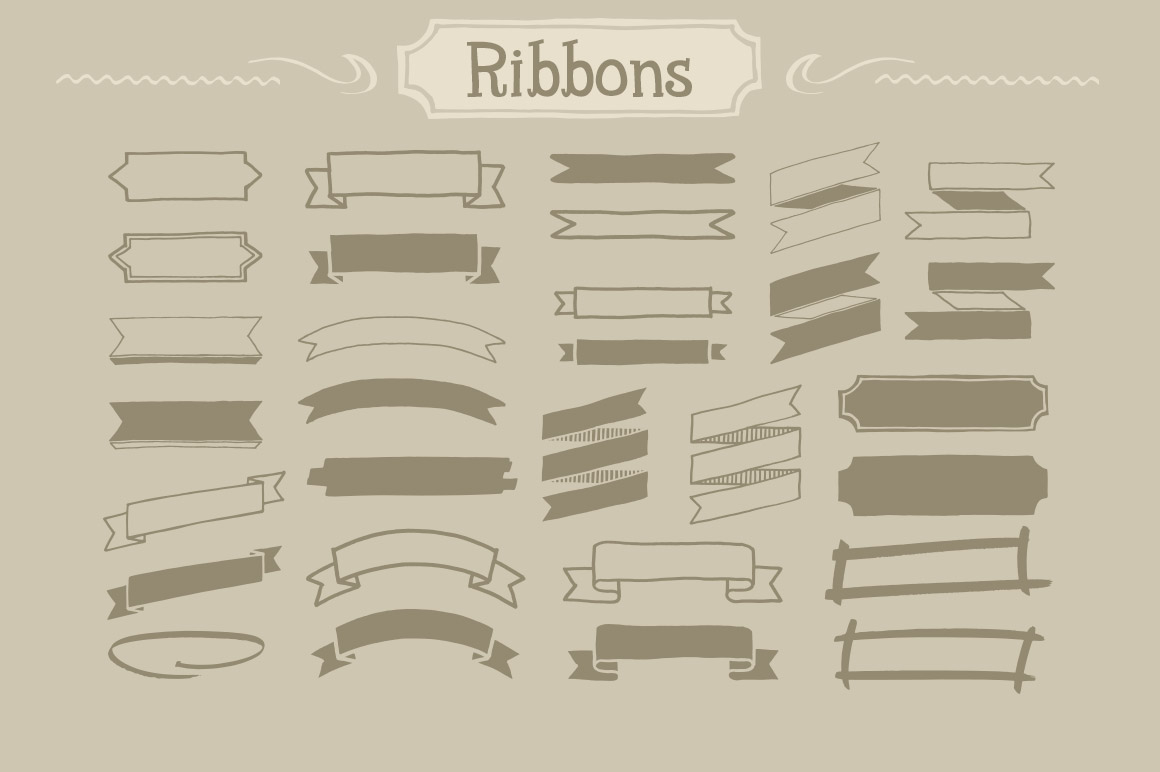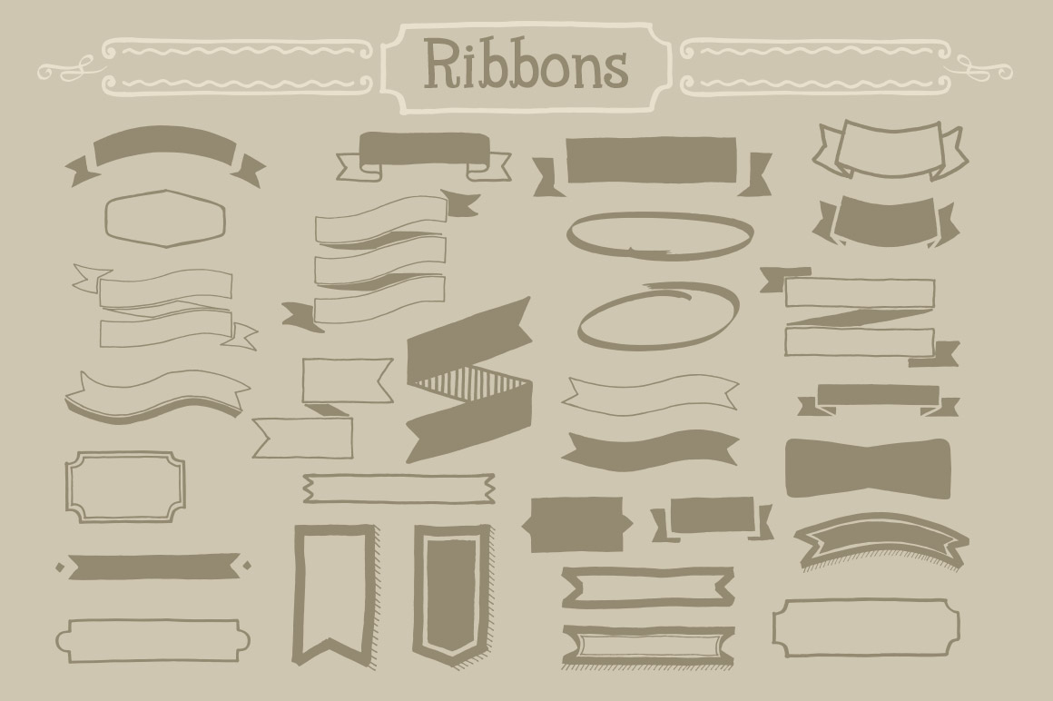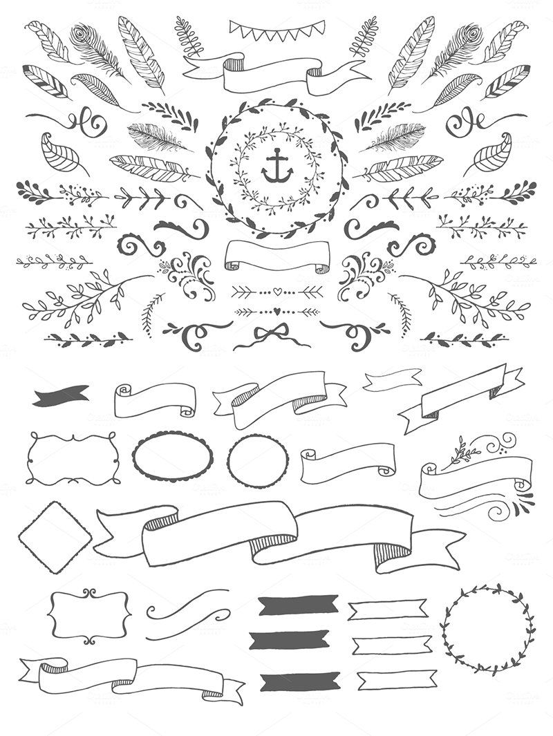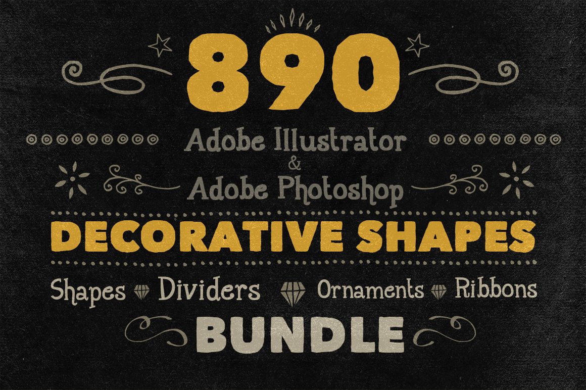 890 handwritten decorative vector shapes in Adobe Illustrator and Adobe Photoshop (resizable shapes). Shapes like ribbons, dividers, ornaments and corners.