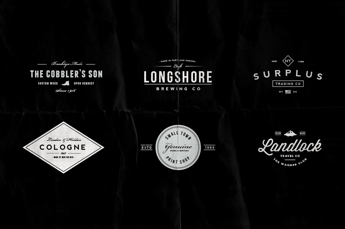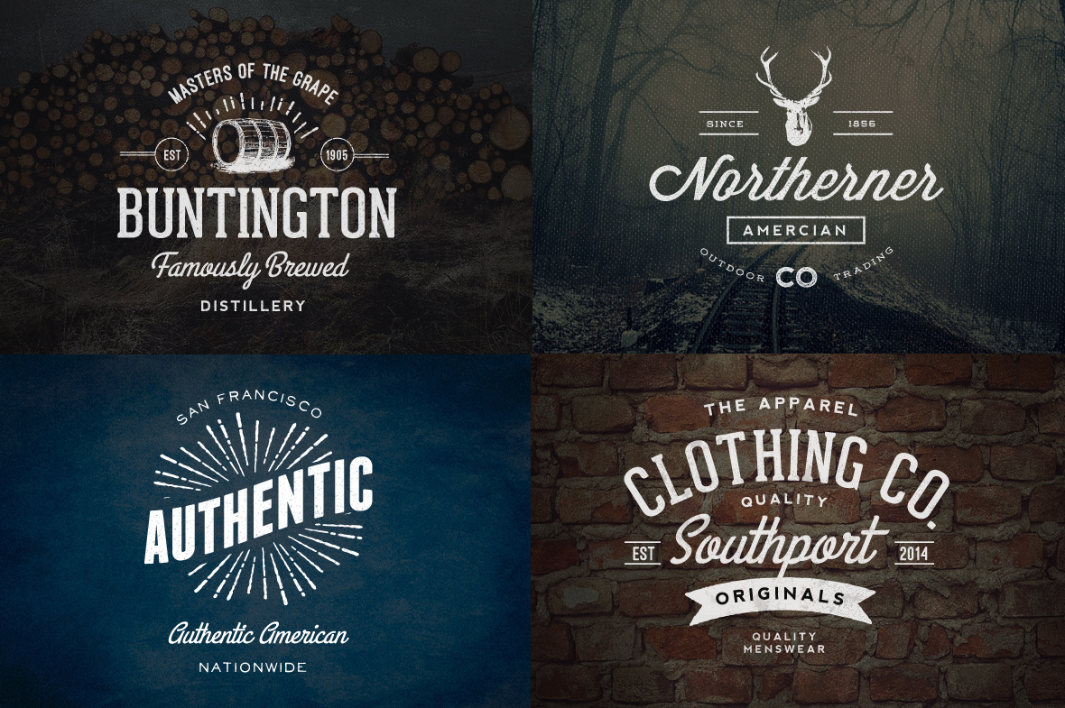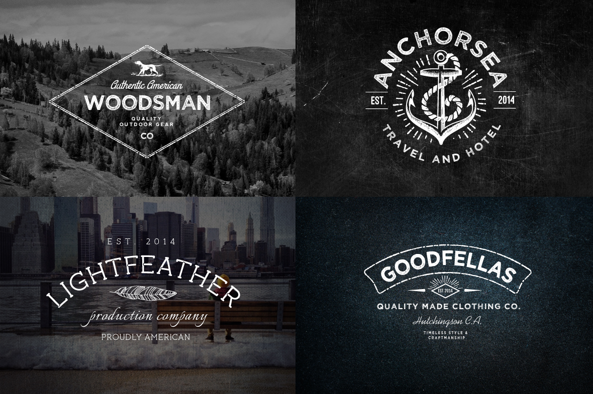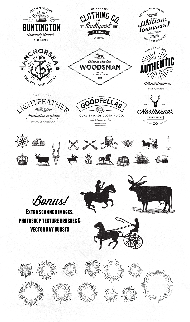 This pack includes 9 carefully crafted vintage style Logo Templates for you to use and modify as your own. Bonus material includes various vintage images to customised your logos with if you wish, vector ray bursts and texturising photoshop brushes to add some wear and tear 🙂