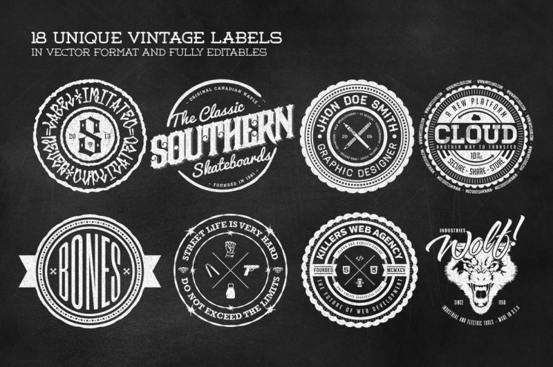 16 simple retro/vintage badge templates for Adobe Photoshop or Elements.