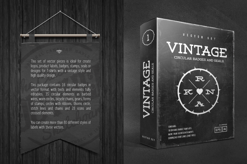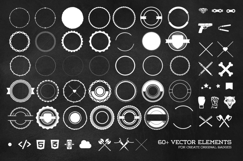 This set of vector pieces ( 16 badges pre-designed fully editables, 35 Circular elements and 28 icons ) is ideal for create logos, product labels, badges, stamps, seals or t-shirt designs. with a vintage style and high quiality design.