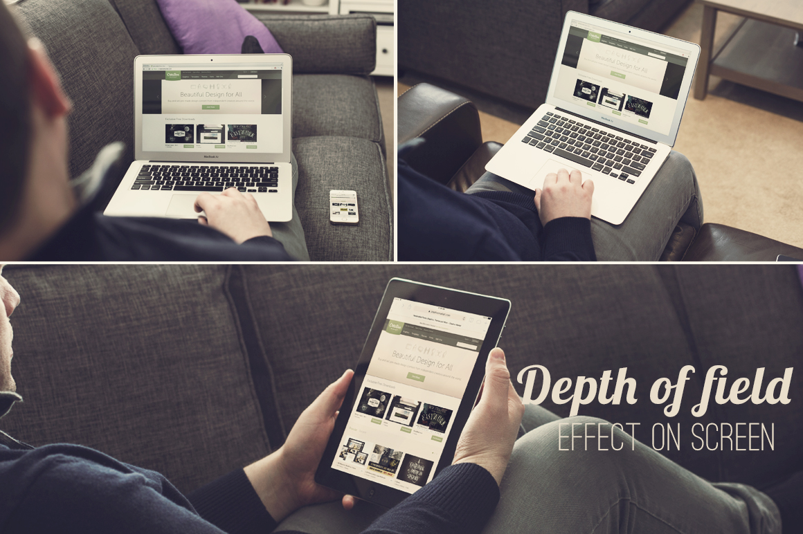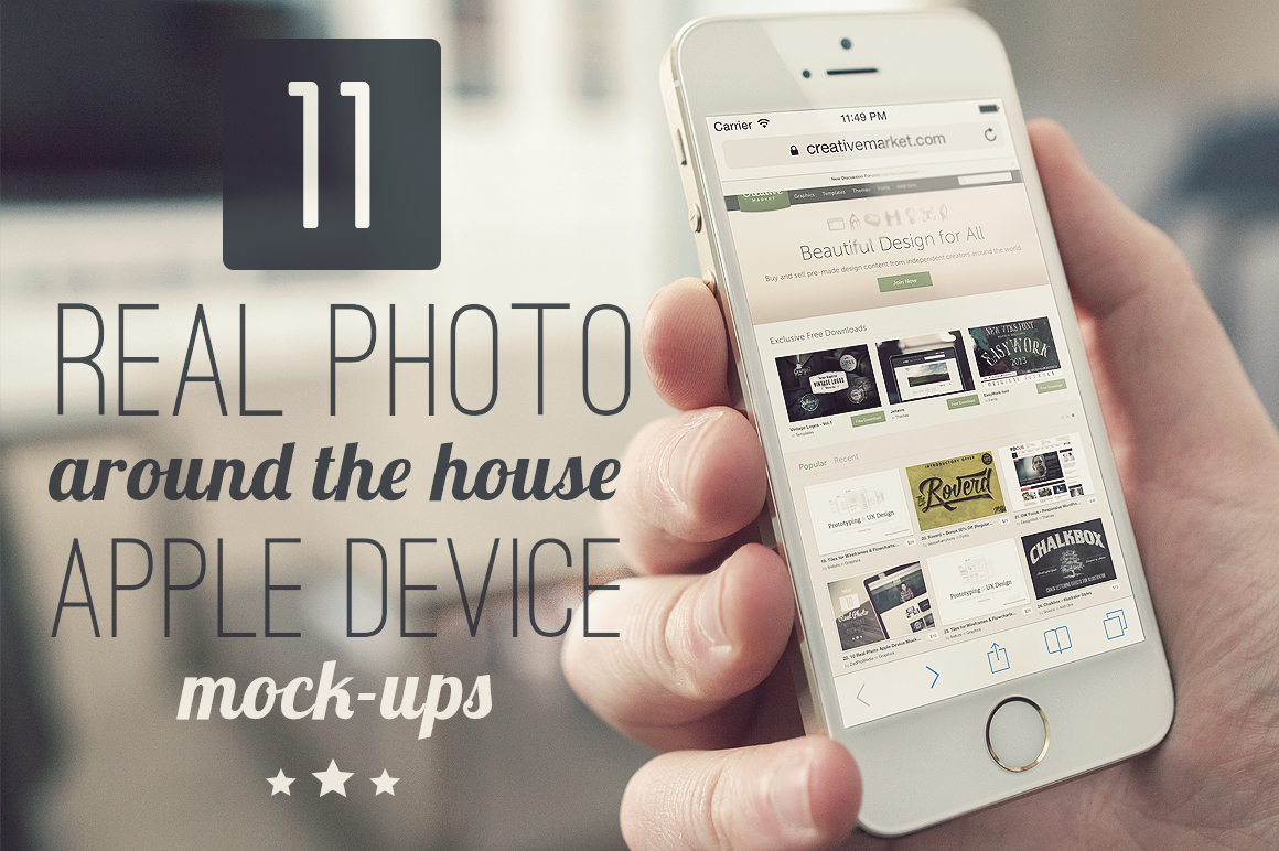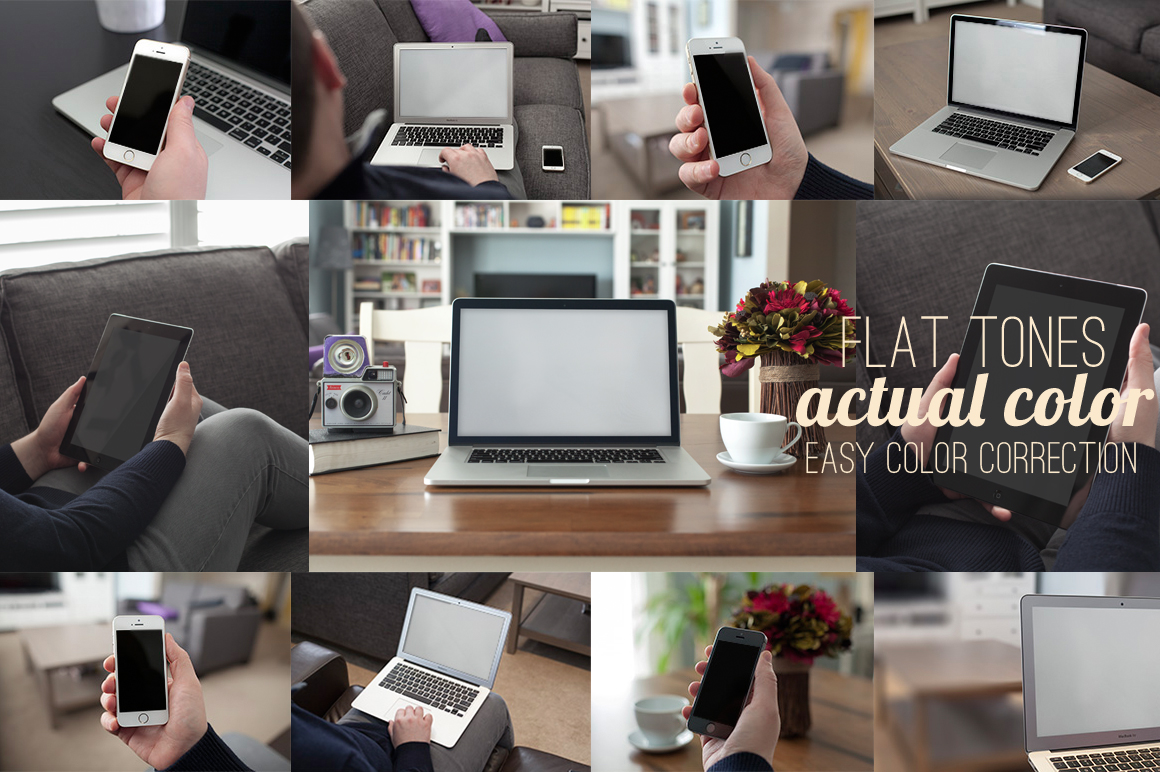11 Around the house Apple device Mock-ups.Super clean and sharp images with replaceable Smart Object screens. Perfect for advertising a Web Theme or App! Real easy to edit. Just drop in your screen shot, color correct to your liking and you’re good to go! Devices: iPhone 5s, Macbook Pro Retina, iPad Retina, Macbook Air.