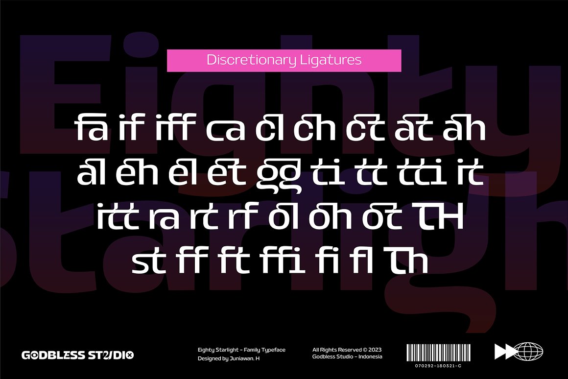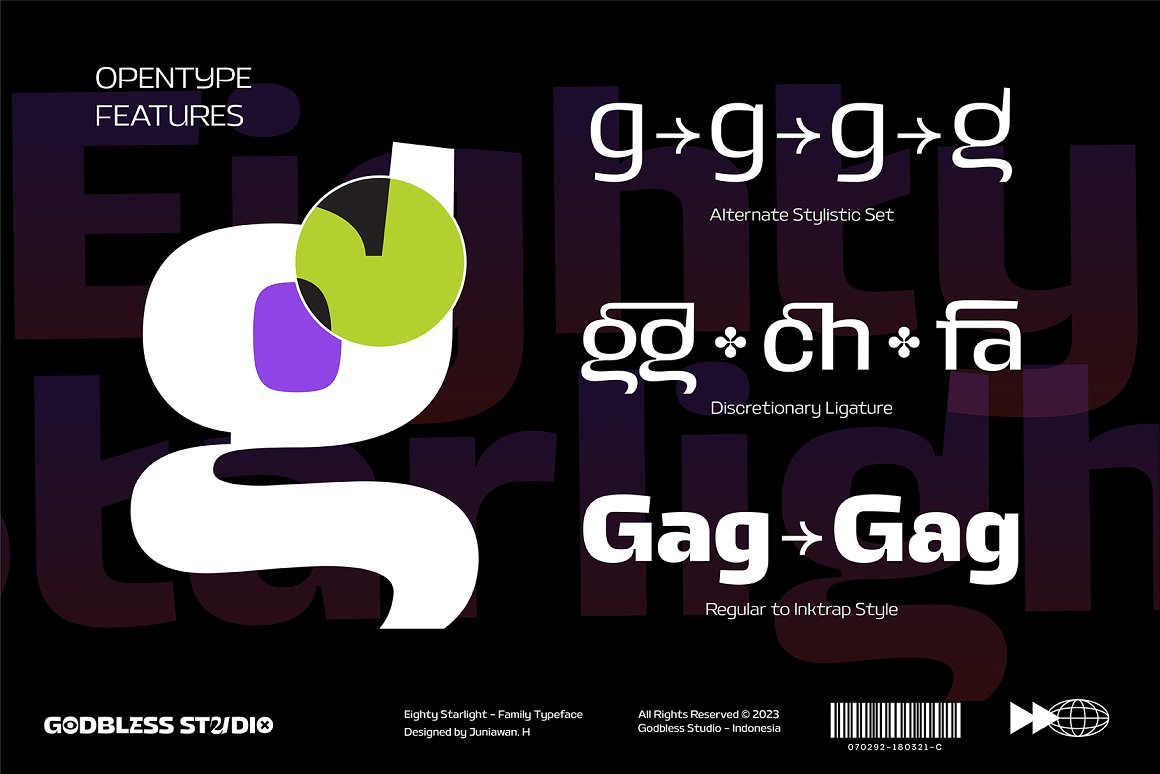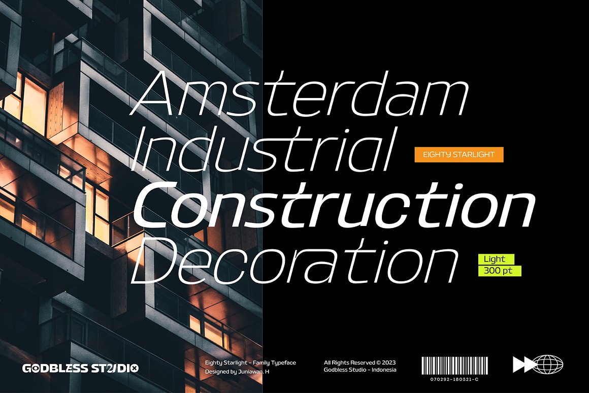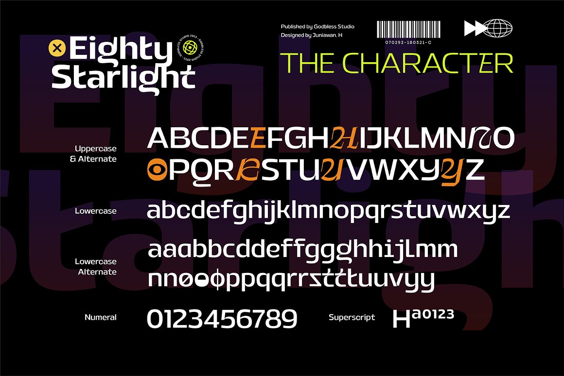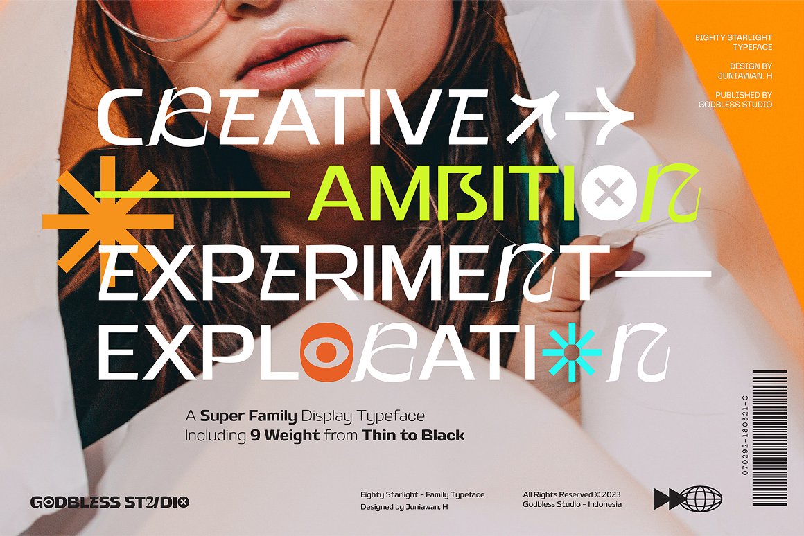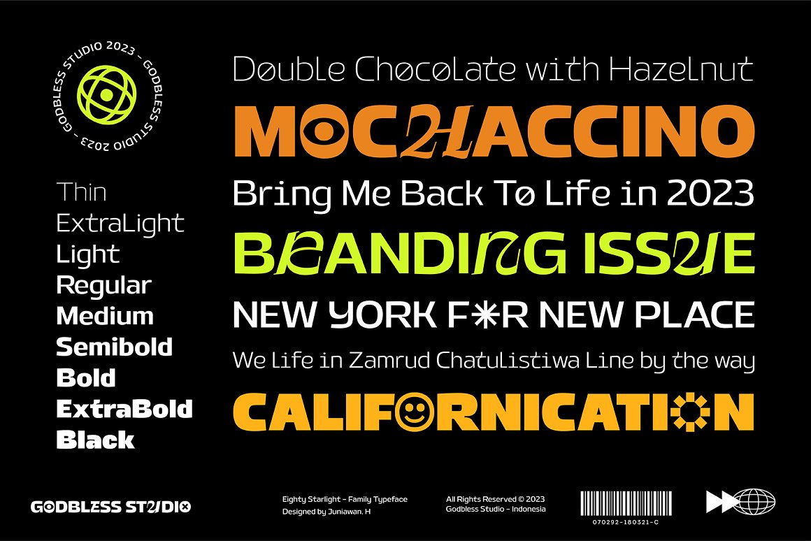 Sneak a peak Eighty Starlight, a font with a futuristic and experimental concept created with a strong and charismatic character. following the current trend design style. Eighty Starlight is made experimentally following a futuristic style recipe with alternate characters made with inktrap and display that makes this font more stylish and varied. Eighty Starlight is a variable font that has 18 Font, 9 weights with 2 Variable from thin to black & Italic. also includes alternates that are more varied with variables. Eighty Starlight is a versatile font system, designed primarily for display uses with a need of visual impact.