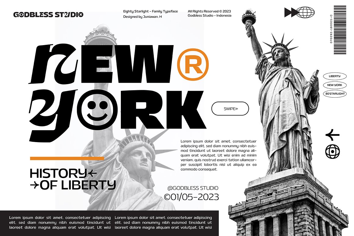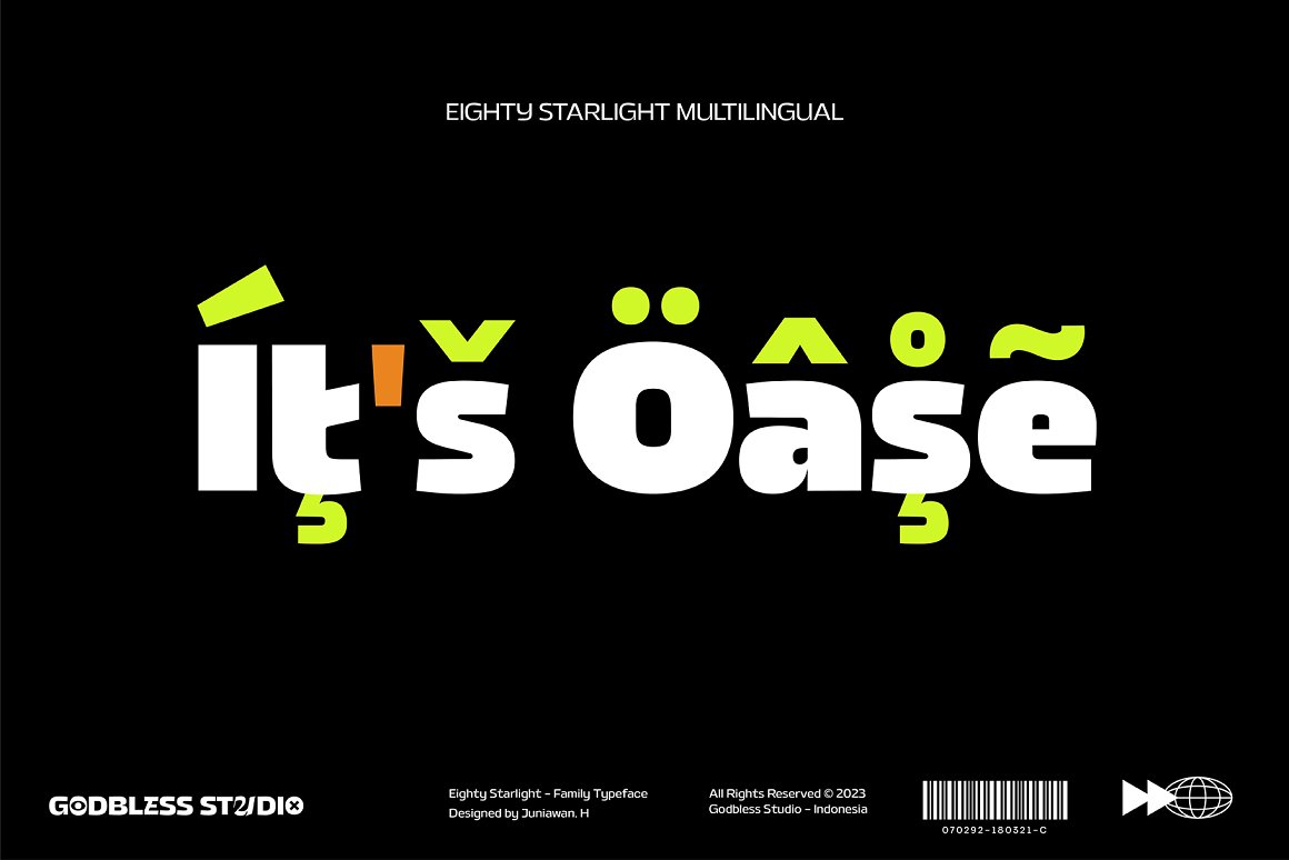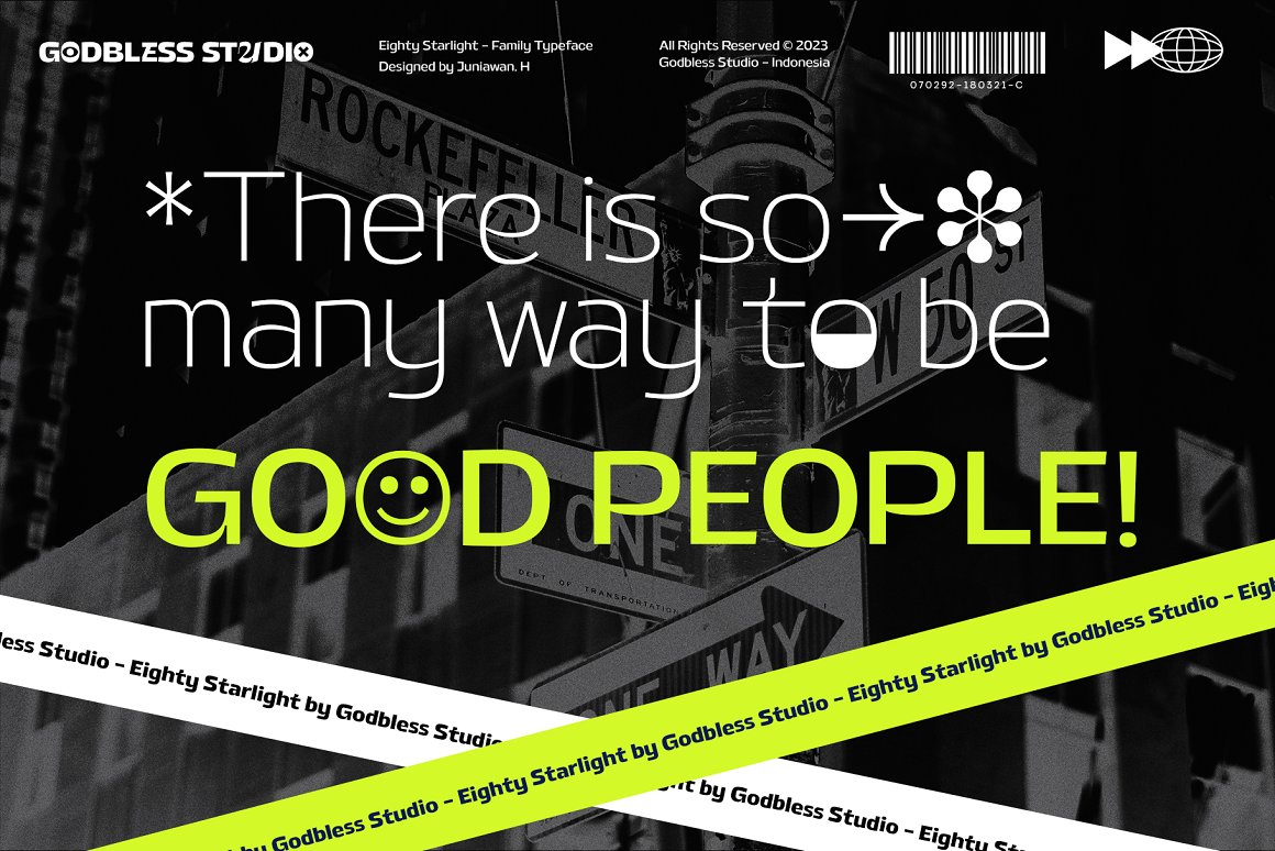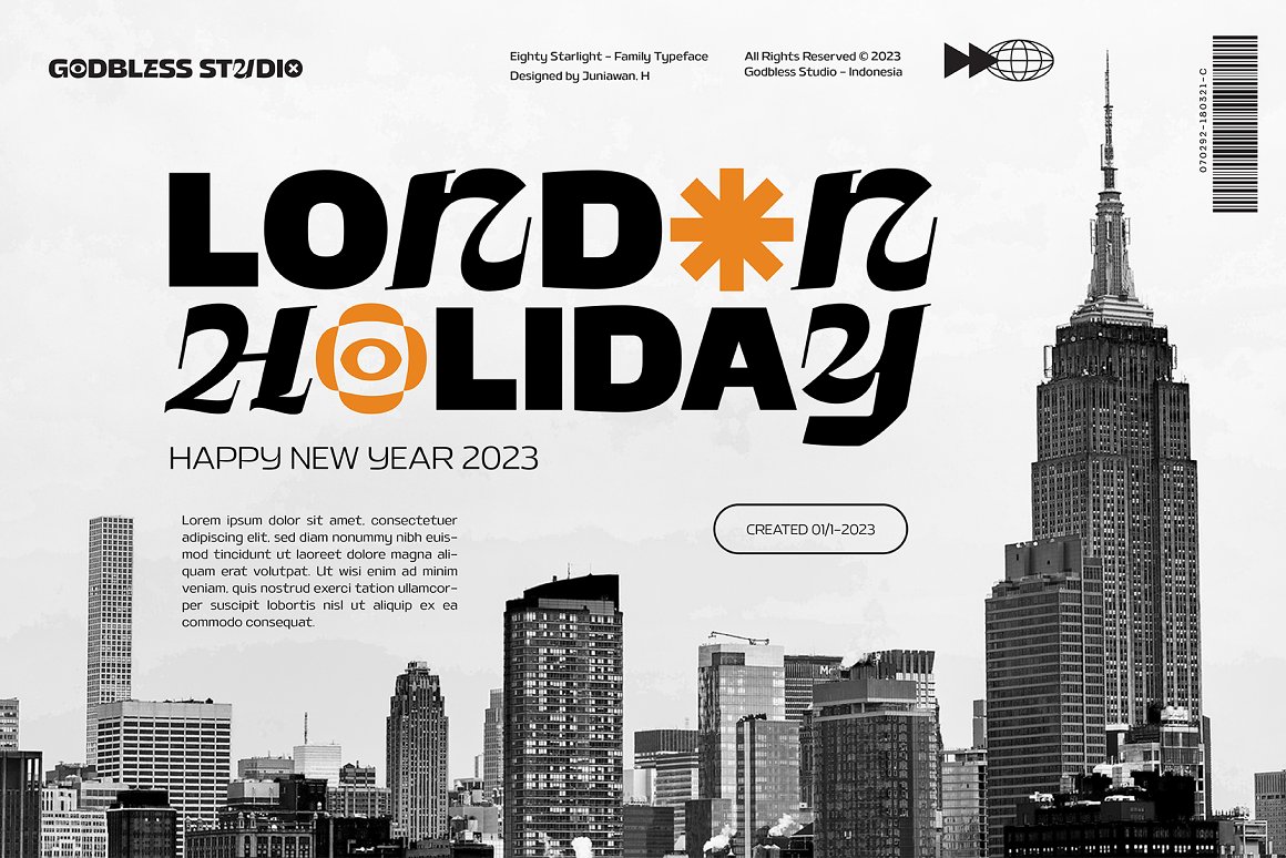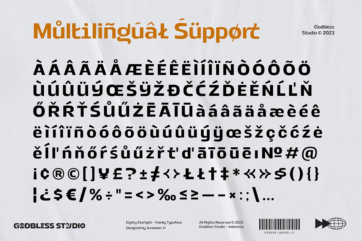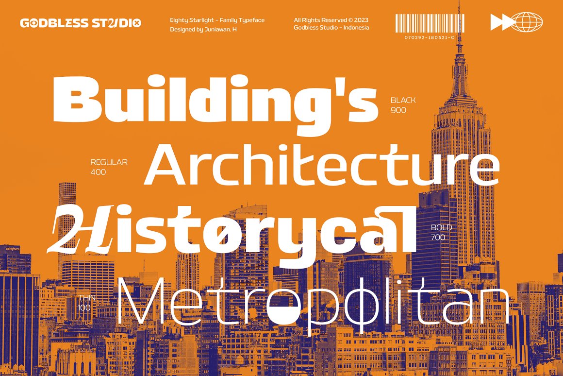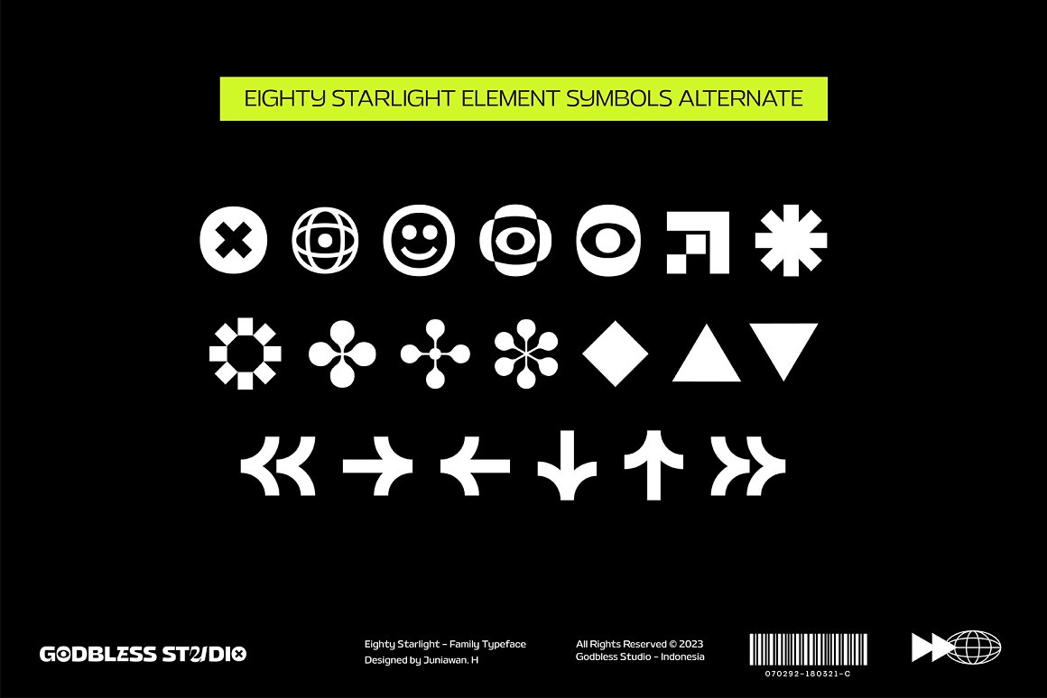 Sneak a peak Eighty Starlight, a font with a futuristic and experimental concept created with a strong and charismatic character. following the current trend design style. Eighty Starlight is made experimentally following a futuristic style recipe with alternate characters made with inktrap and display that makes this font more stylish and varied. Eighty Starlight is a variable font that has 18 Font, 9 weights with 2 Variable from thin to black & Italic. also includes alternates that are more varied with variables. Eighty Starlight is a versatile font system, designed primarily for display uses with a need of visual impact.
