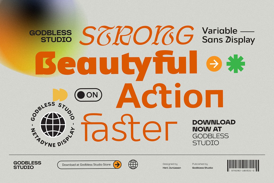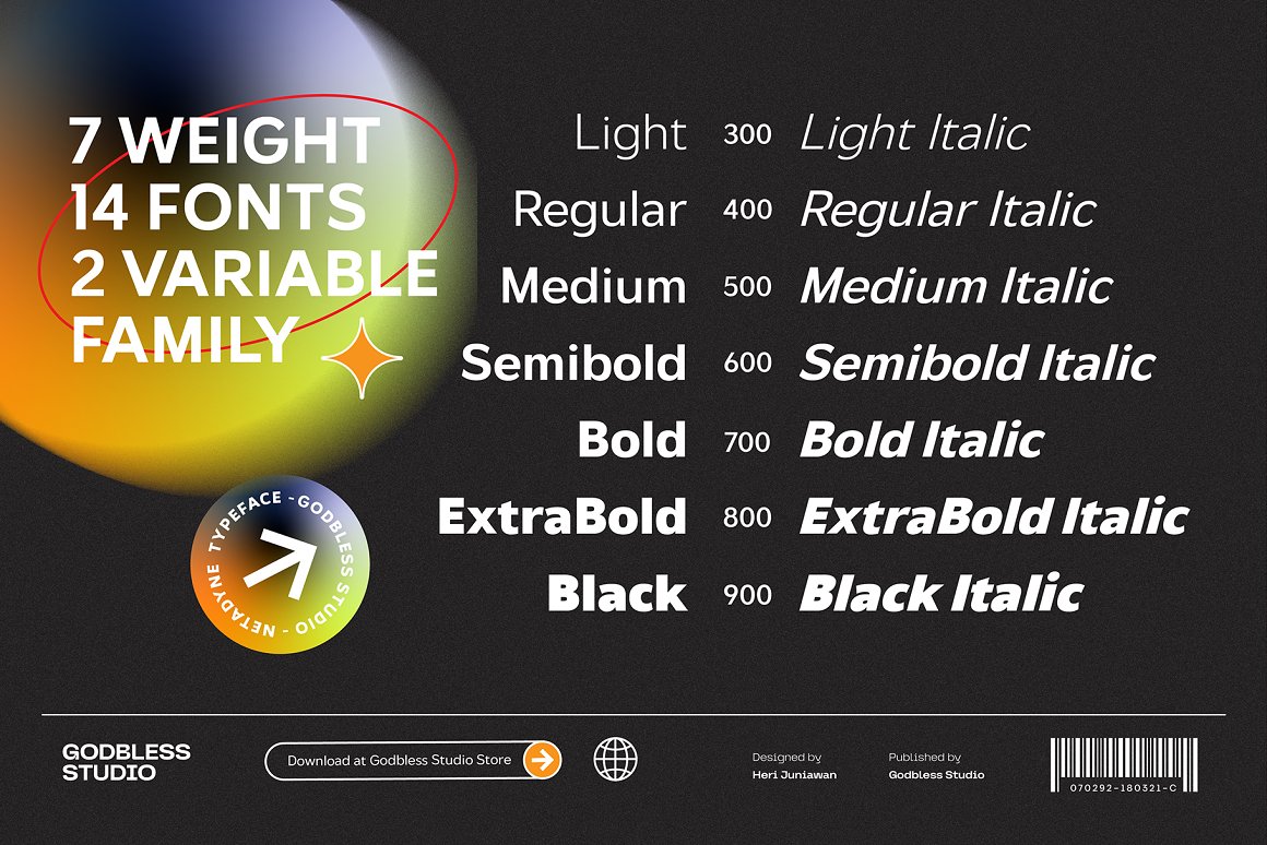 Netadyne was created experimentally following a futuristic style recipe with characters made to keep up with today’s developments and also combined with various unique alternate variations to produce a font with a very charismatic and sturdy concept. Netadyne is a variable font that has 7 weights with 14 fonts from light to black and also includes italic. Netadyne is a versatile font system, designed primarily for display uses with a need of visual impact.