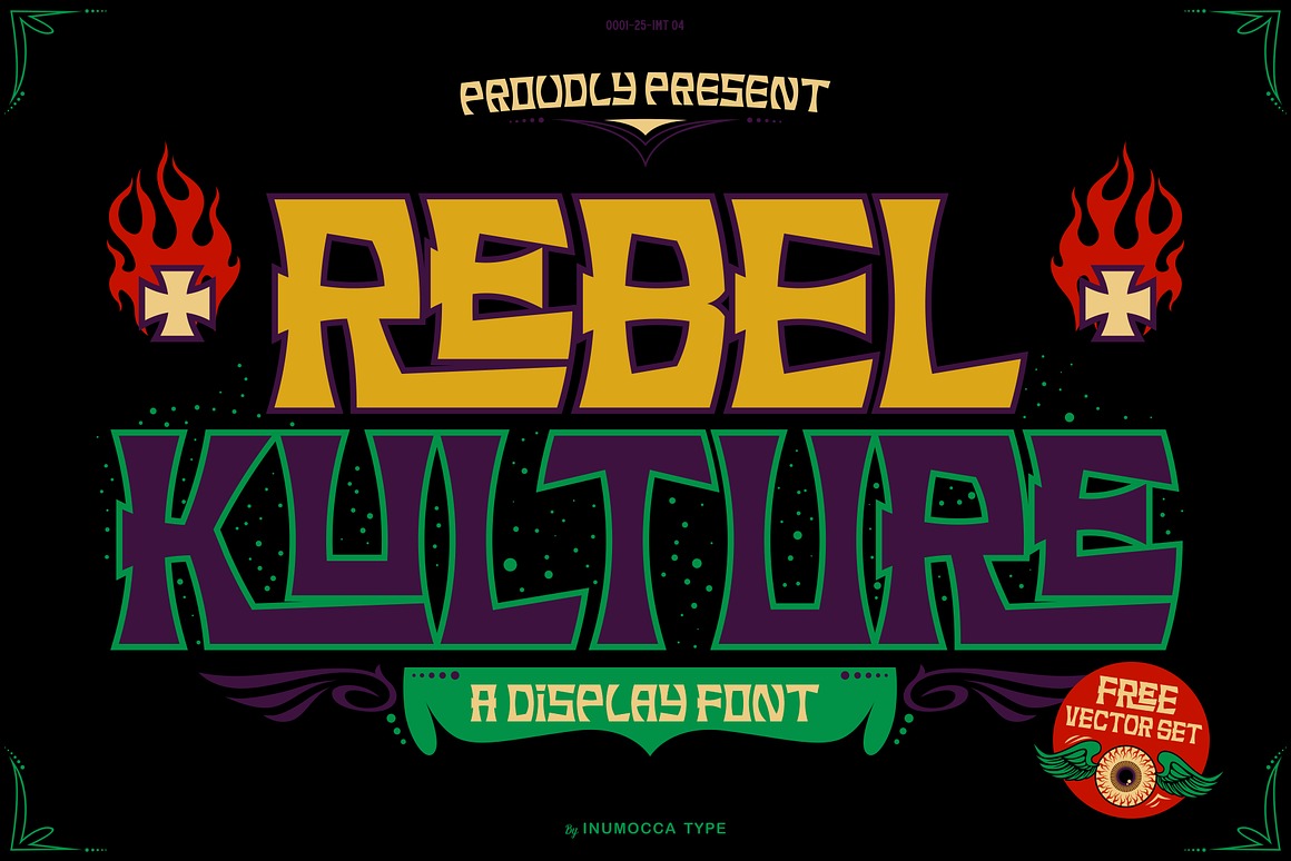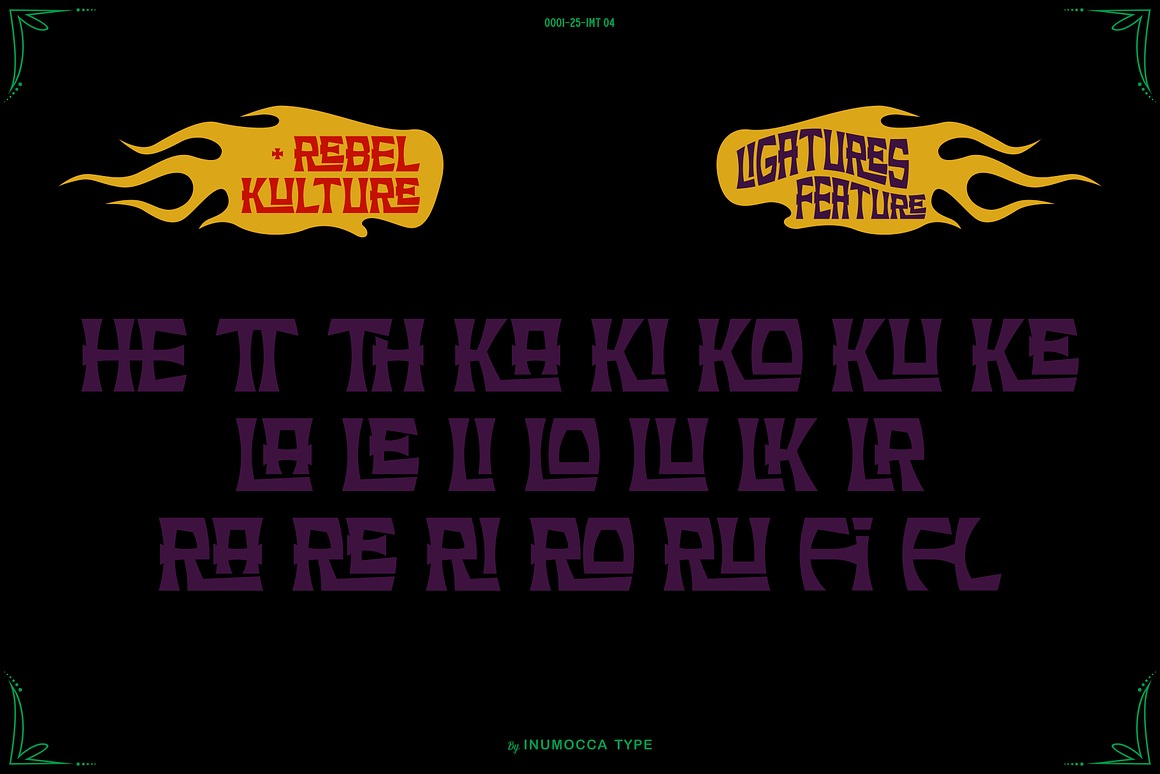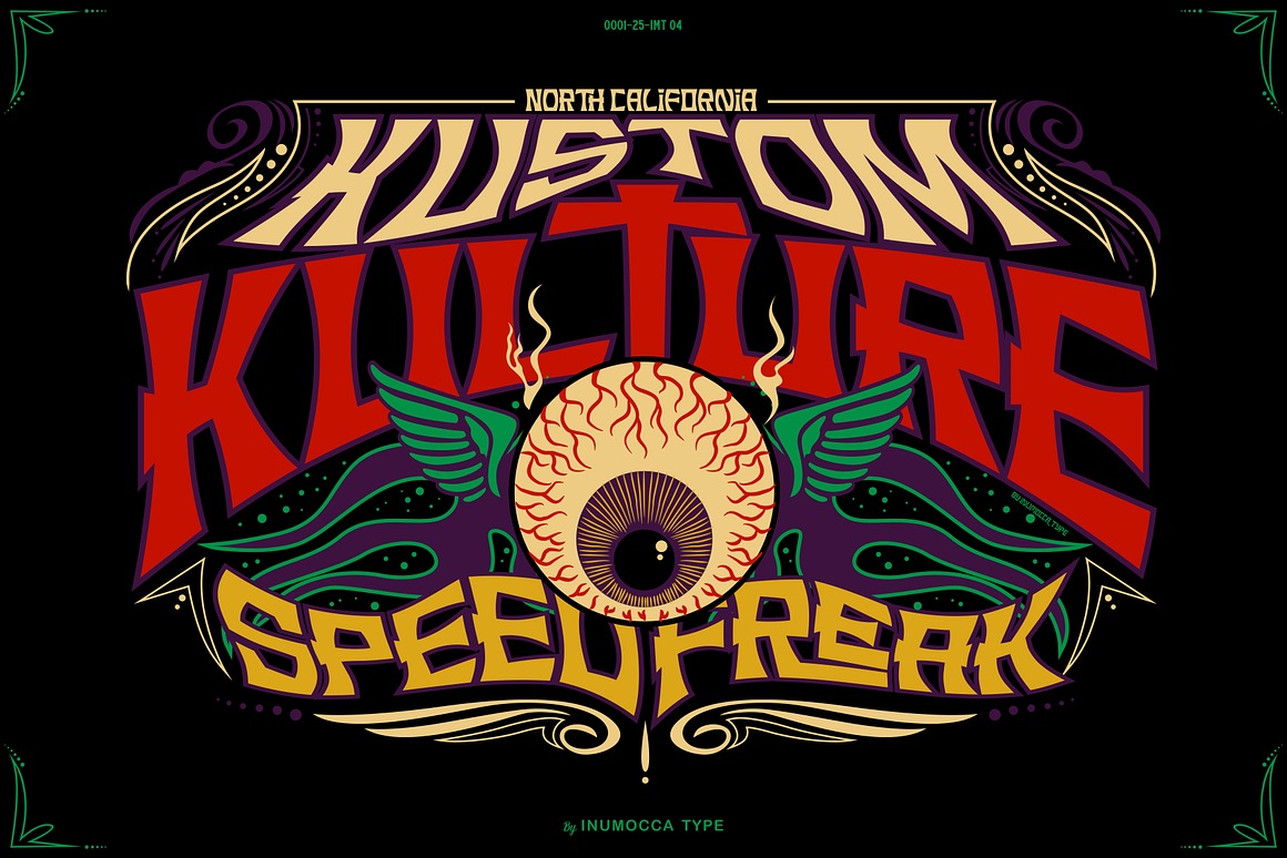 Rebel Kulture is A Display Font, inspired by Kustom Kulture art and Cultural movement that emerged era 60s in California Focuses on Unique Modification and Customization of vehicle especially cars and motorbikes and the lifestyle . i present it in shape and characteristic for make Profesional Your Logos, Branding, Headline, Badges, Body of text, packaging design, poster for event, lettering, you can adding Flames, Stripes and other patterns, because visual appeal is essential.
