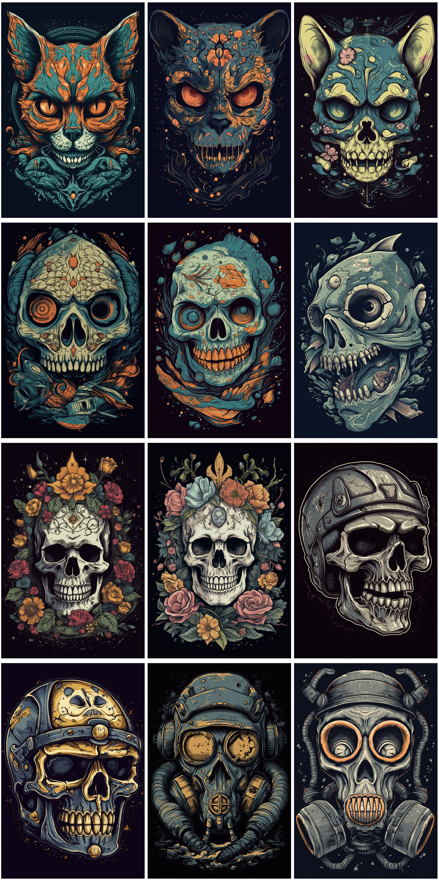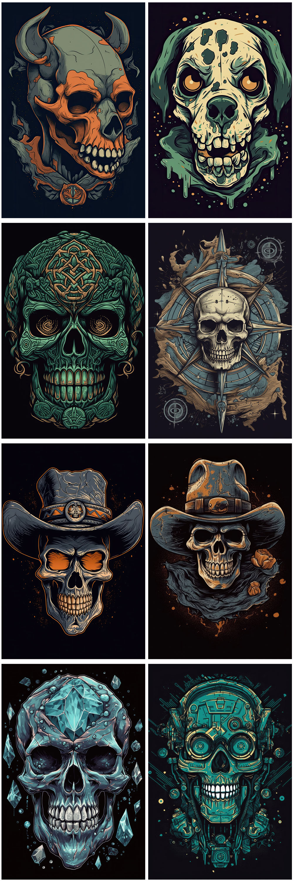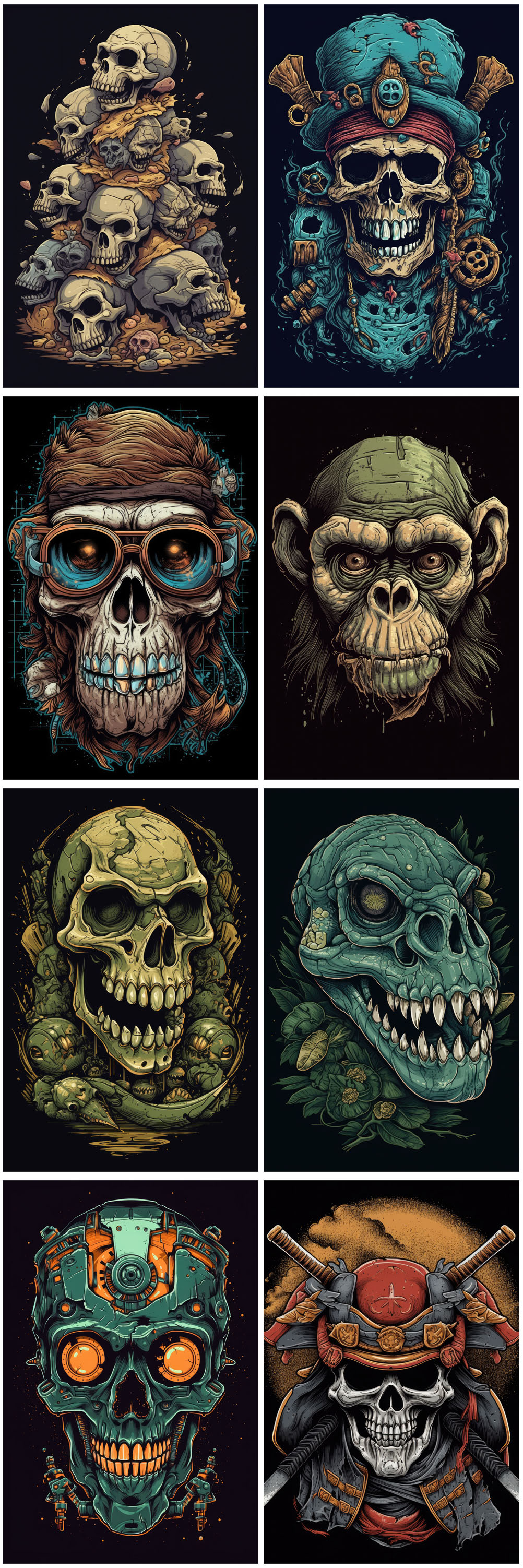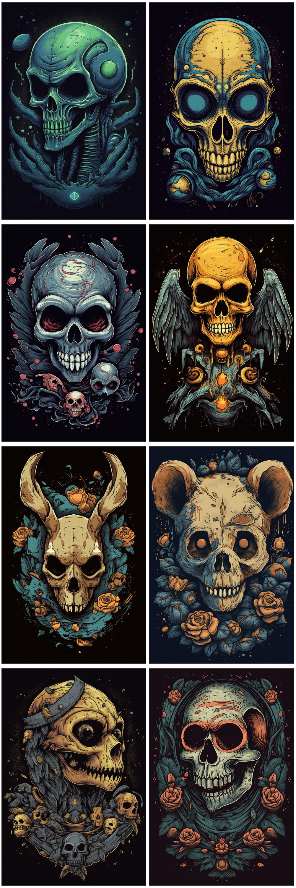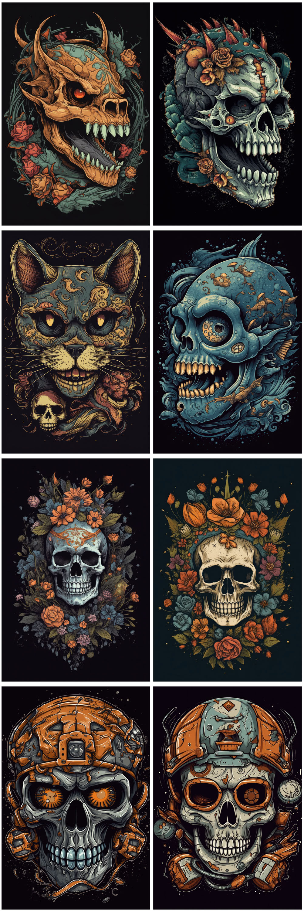 - 200 various skull illustrations – Ai generated digital illustrations for your new T-shirt, card, poster or sticker designs!