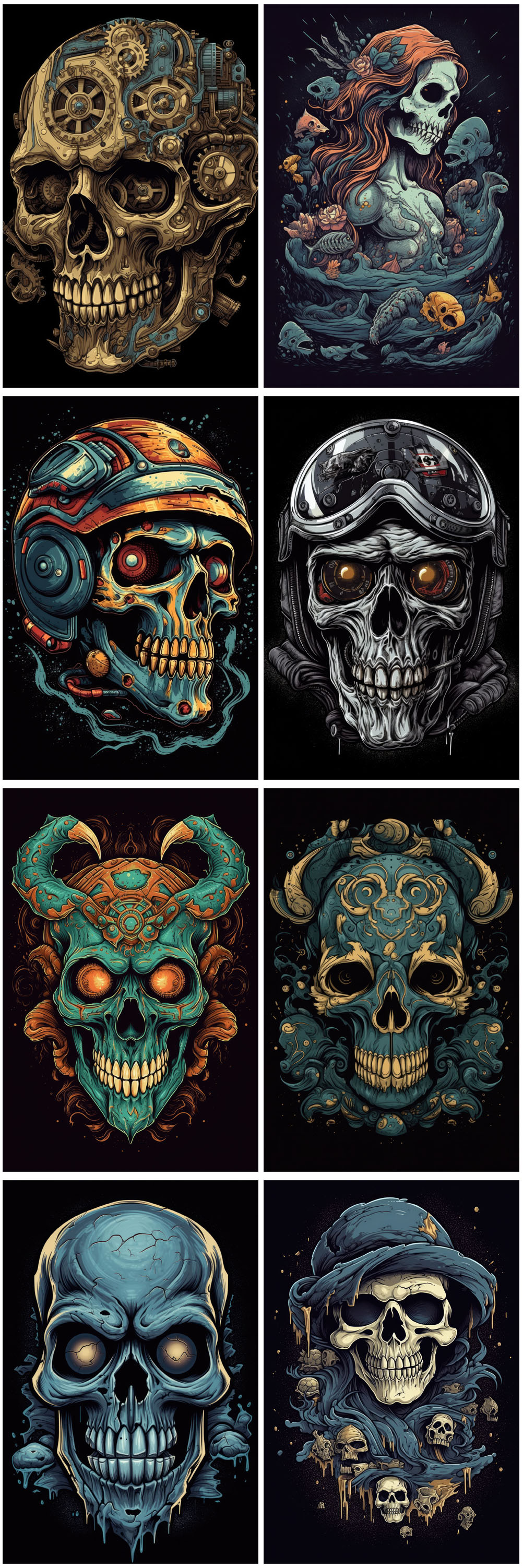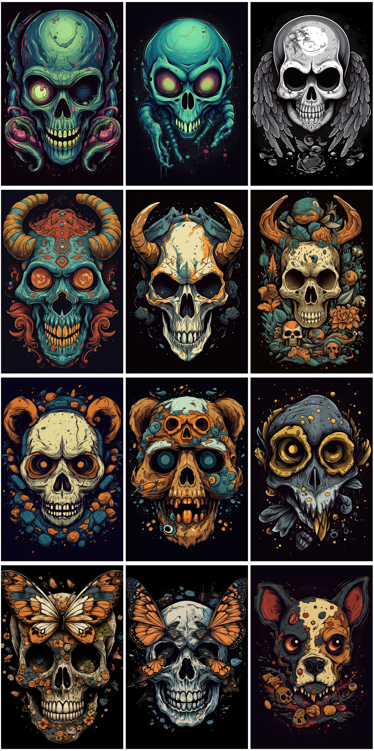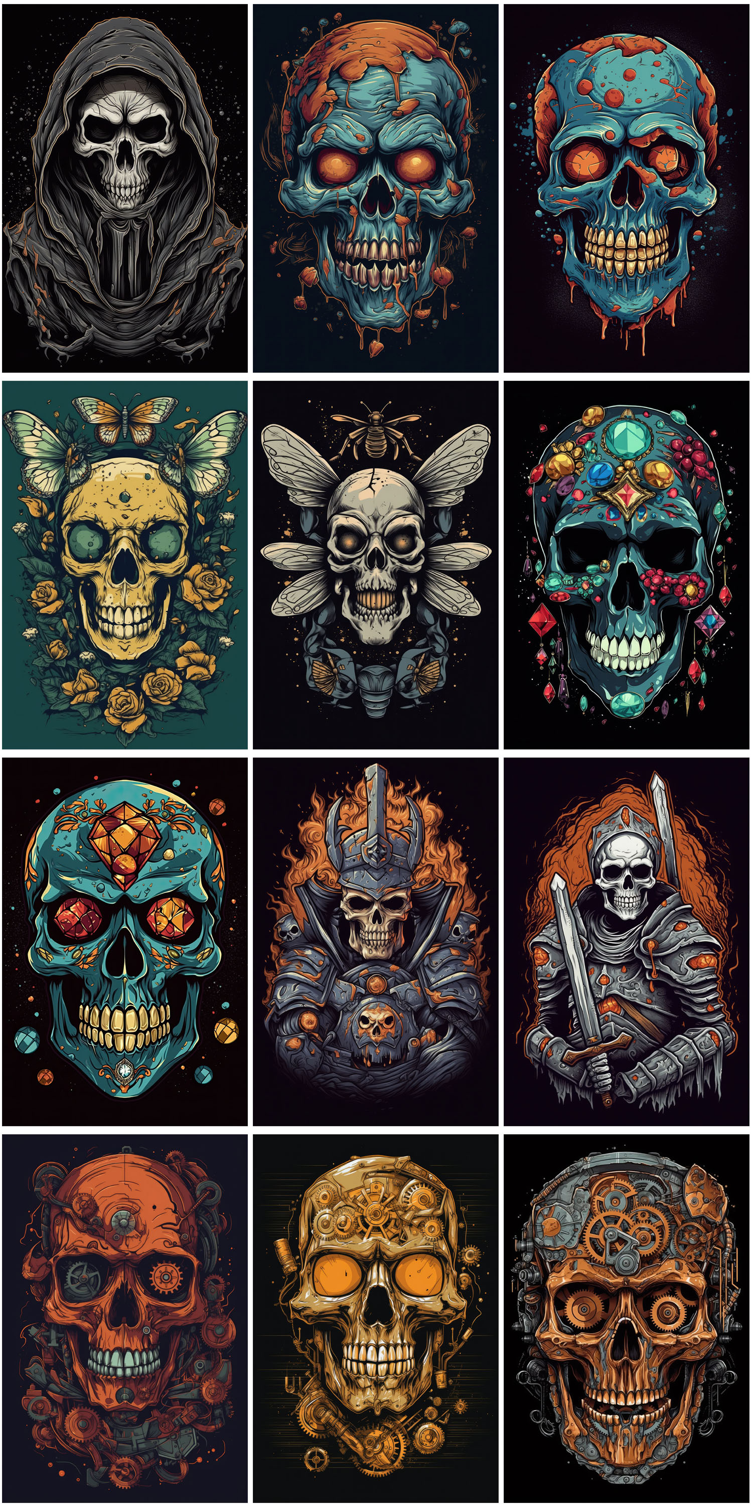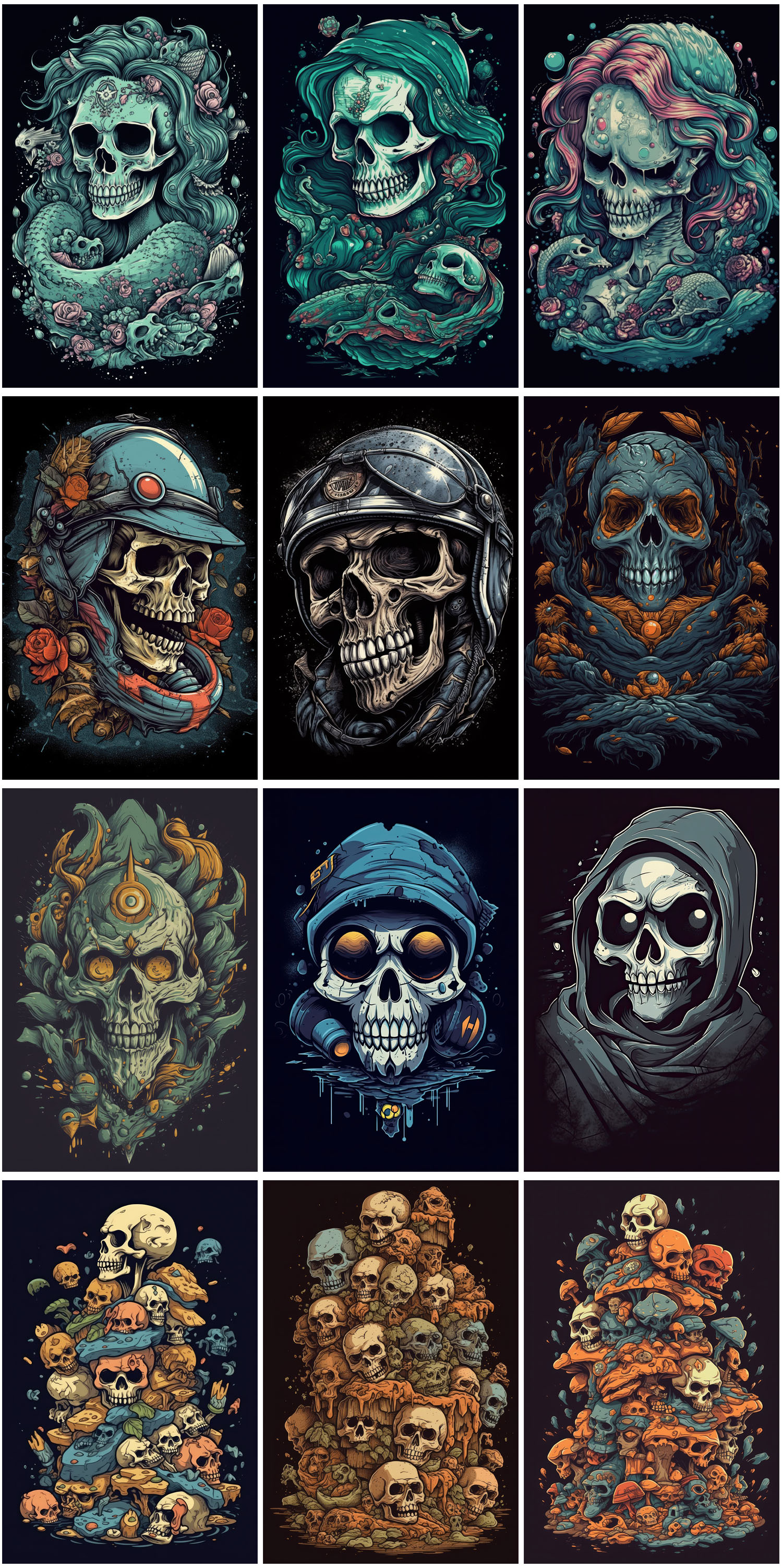 - 200 various skull illustrations – Ai generated digital illustrations for your new T-shirt, card, poster or sticker designs!