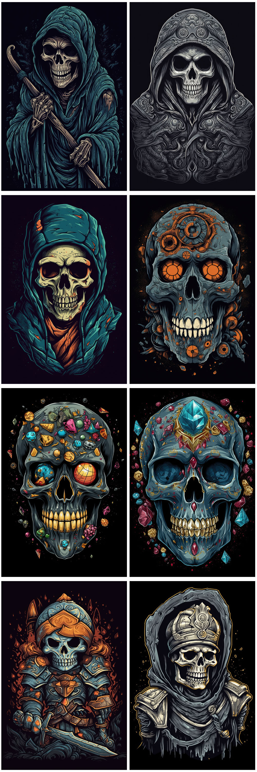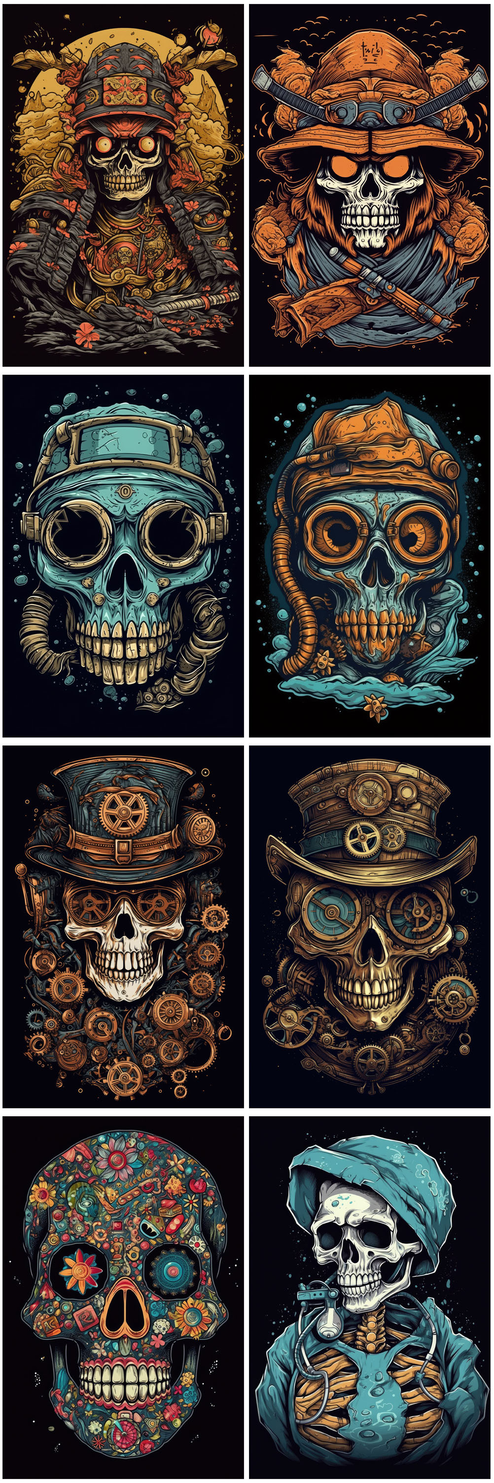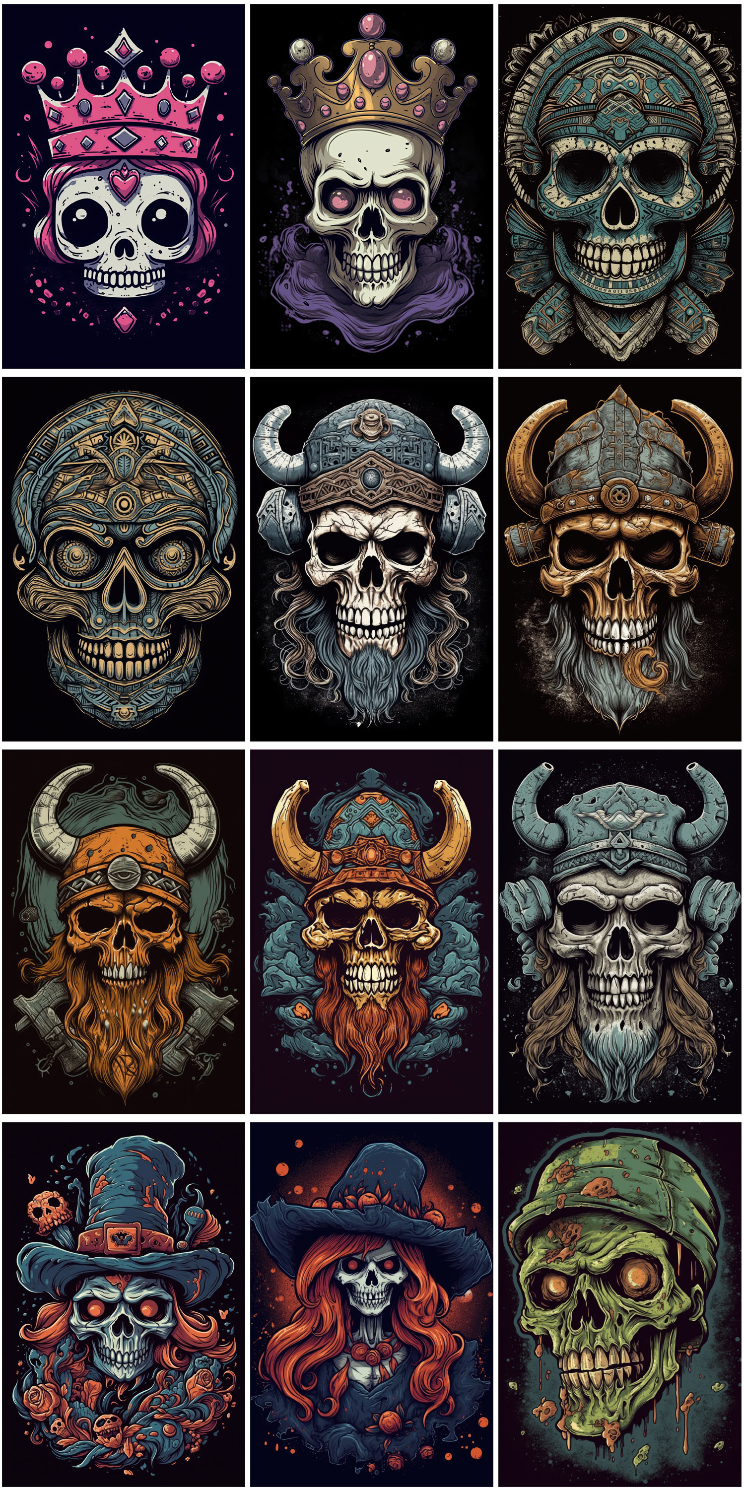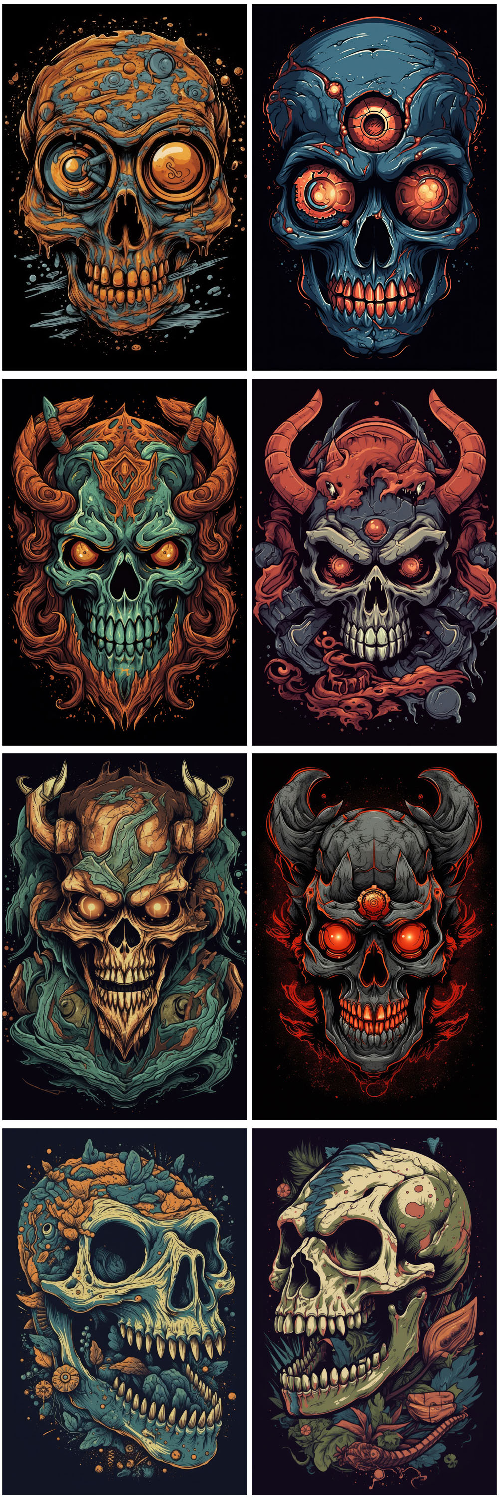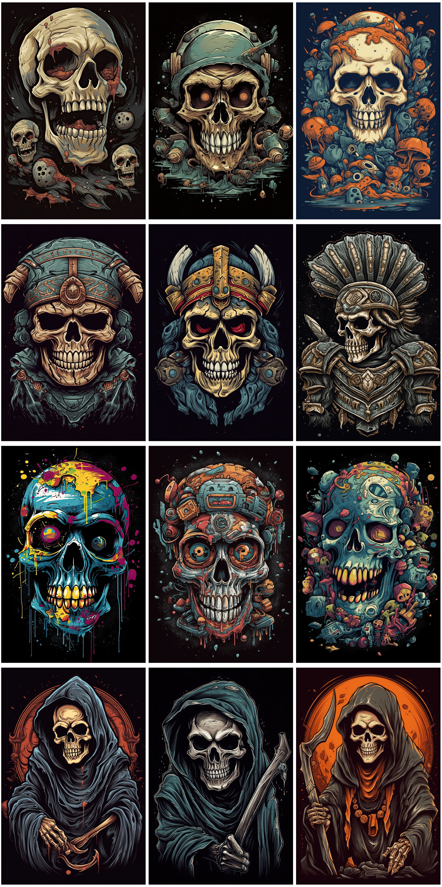 - 200 various skull illustrations – Ai generated digital illustrations for your new T-shirt, card, poster or sticker designs!