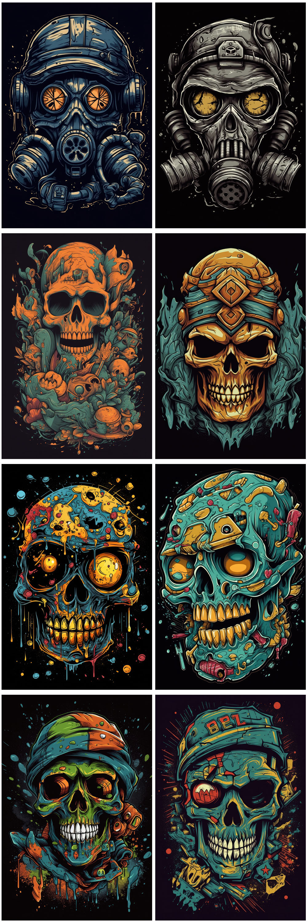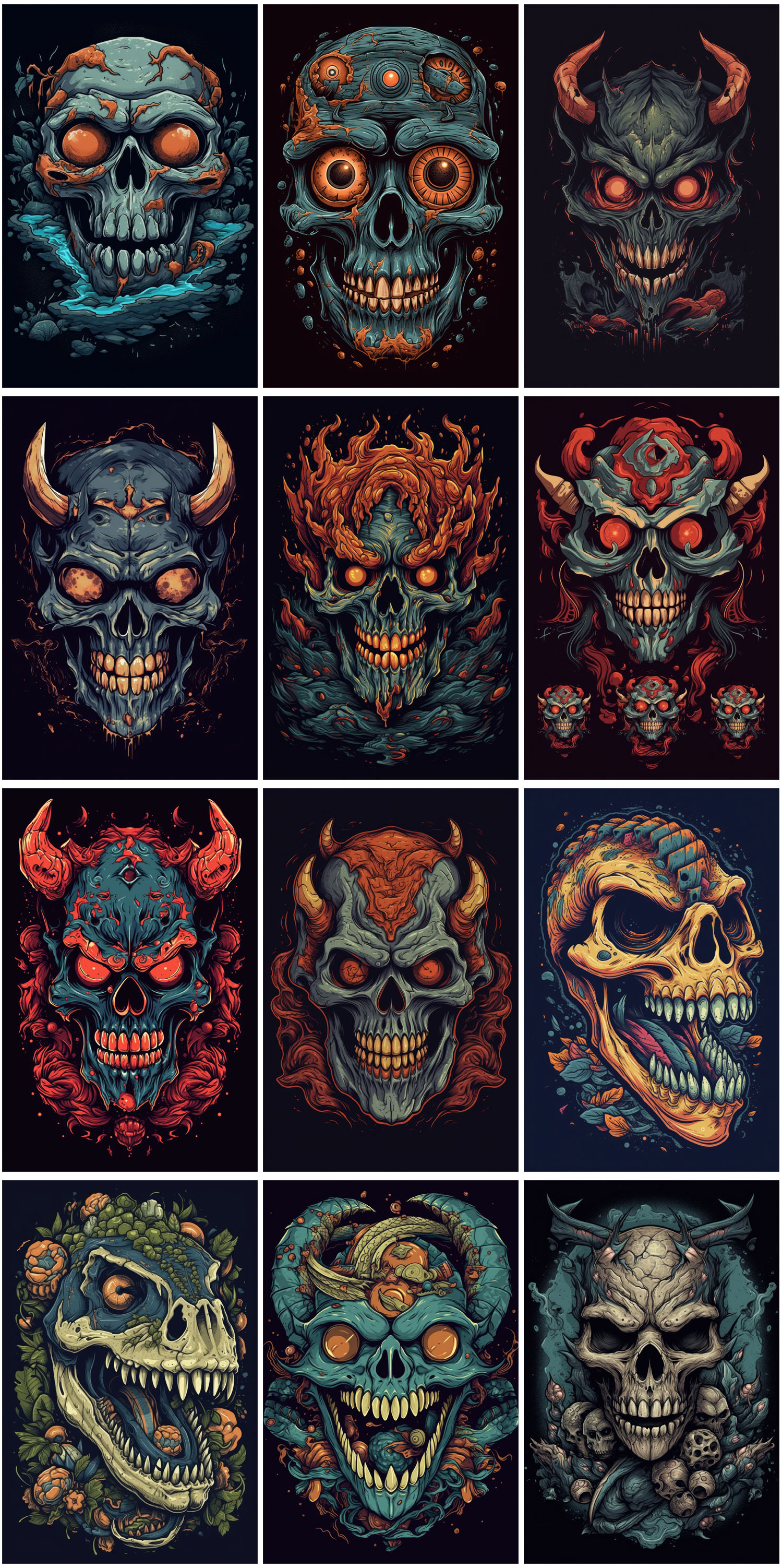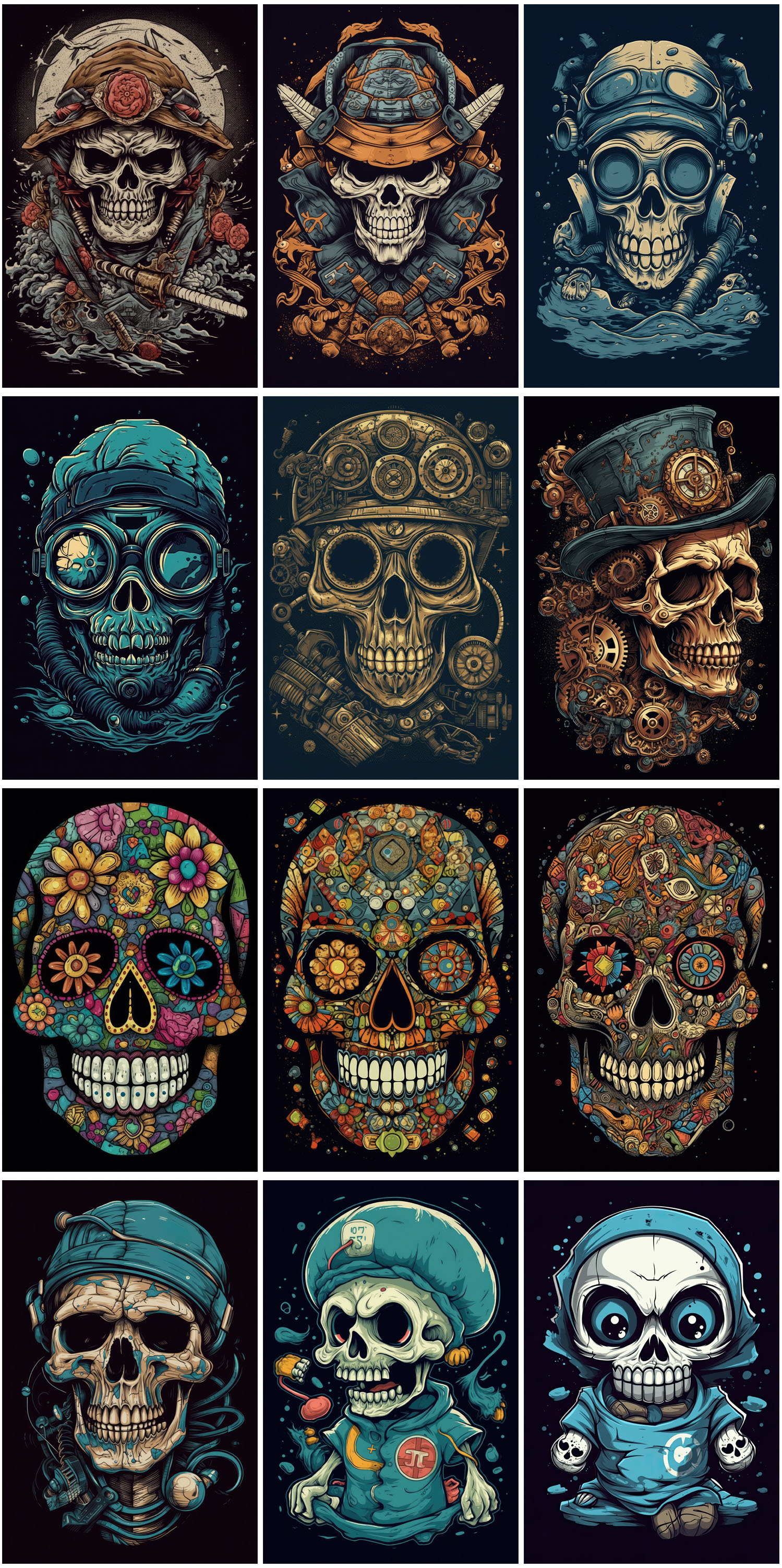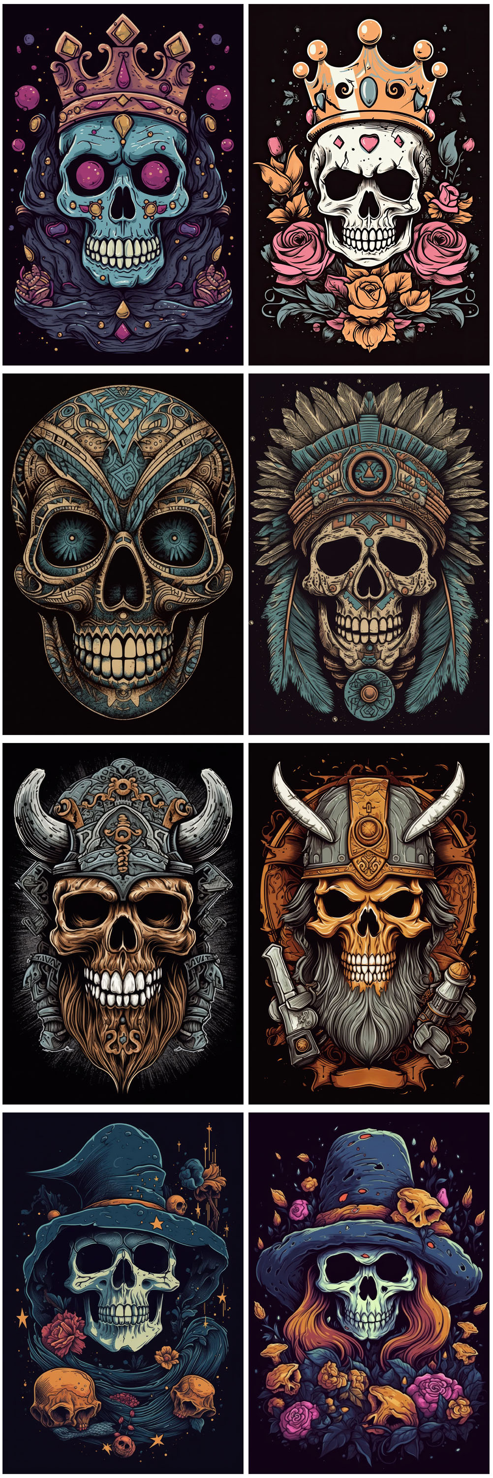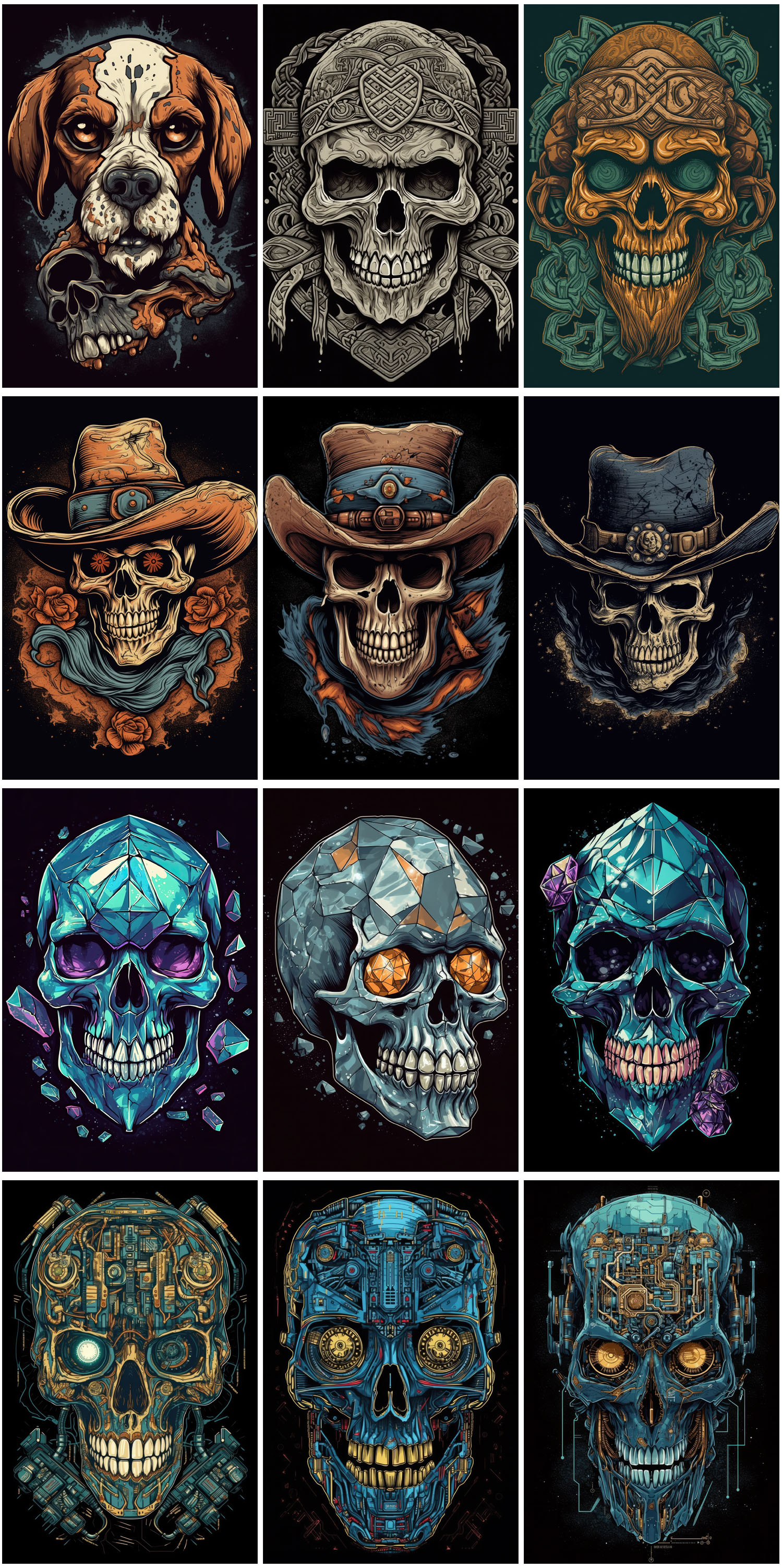 - 200 various skull illustrations – Ai generated digital illustrations for your new T-shirt, card, poster or sticker designs!