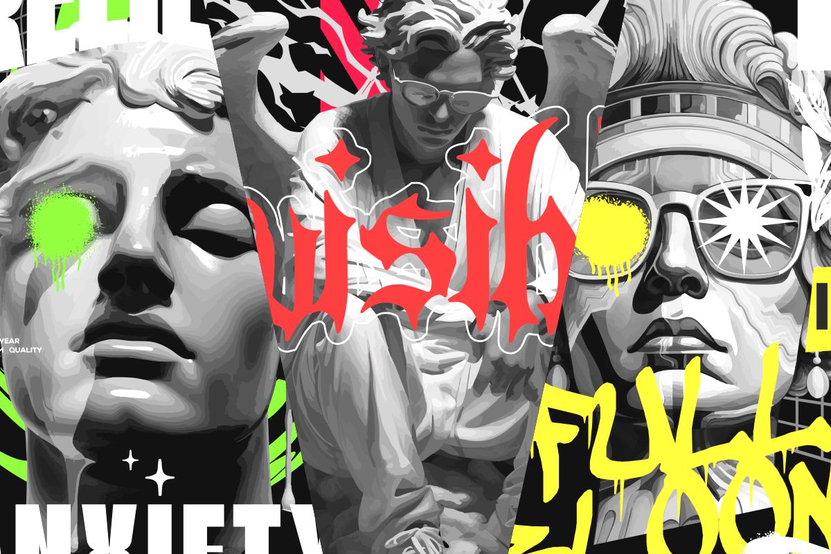 All these unique, urban, futuristic, cyberpunk, brutalism, graffiti & y2k graphics from Universtock are ready for print or online use! MAIN USAGE: flyers, posters, greeting cards, branding, packaging, phone cases, bags and totes, wall art, fabrics, t-shirts, website backgrounds. Actually any place you love! Enjoy 😉