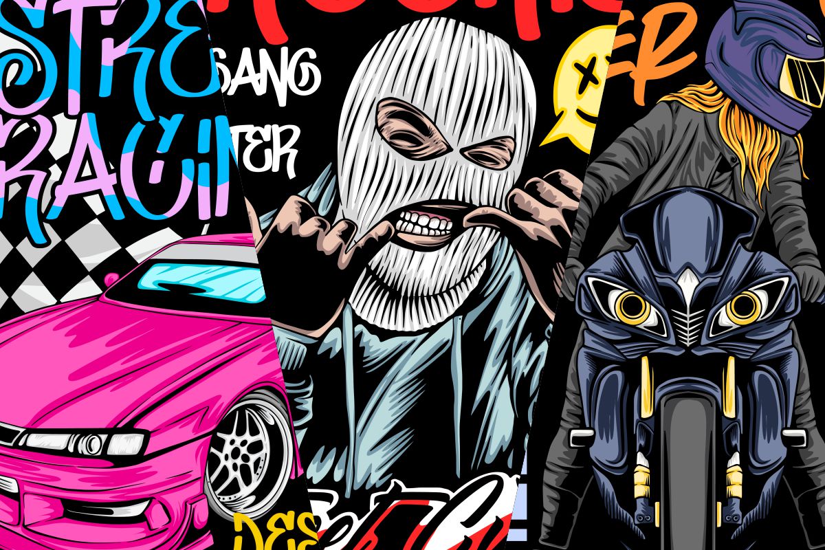 If you need something new in your vector graphics library or some cool street style illustrations for your new project we have a unique & BIG T-shirt or poster graphics bundle for you 🙂 With 200+ unique style designs or illustrations you can create creative t-shirt designs, posters, stickers, invitations or other print or web designs. Start your very own t-shirt company right now with 200+ ready to go t-shirt designs! This retro or street style graphic bundle includes 200+ convenient and ready-made t-shirt designs with all of their original source files.