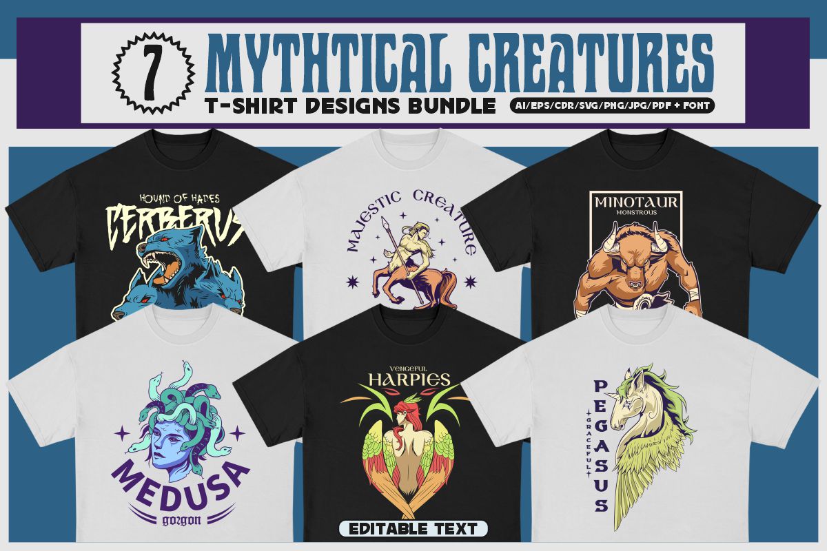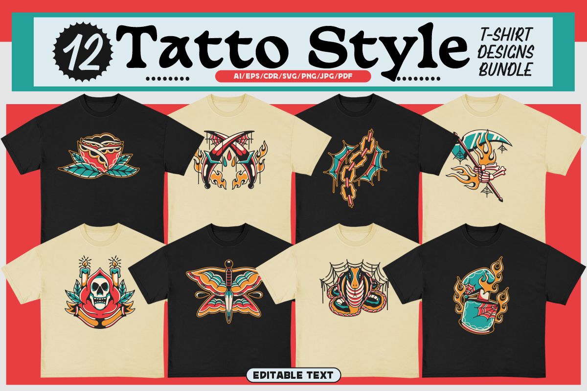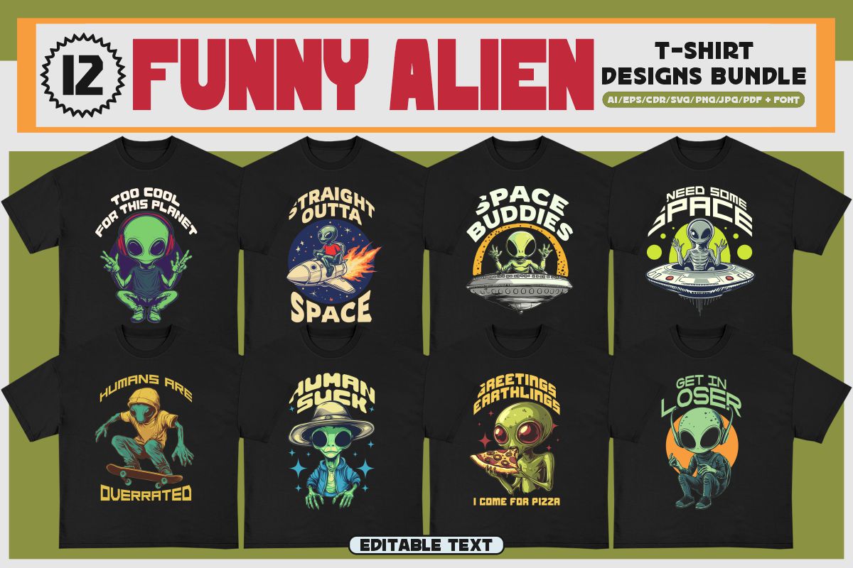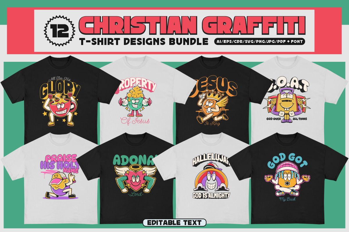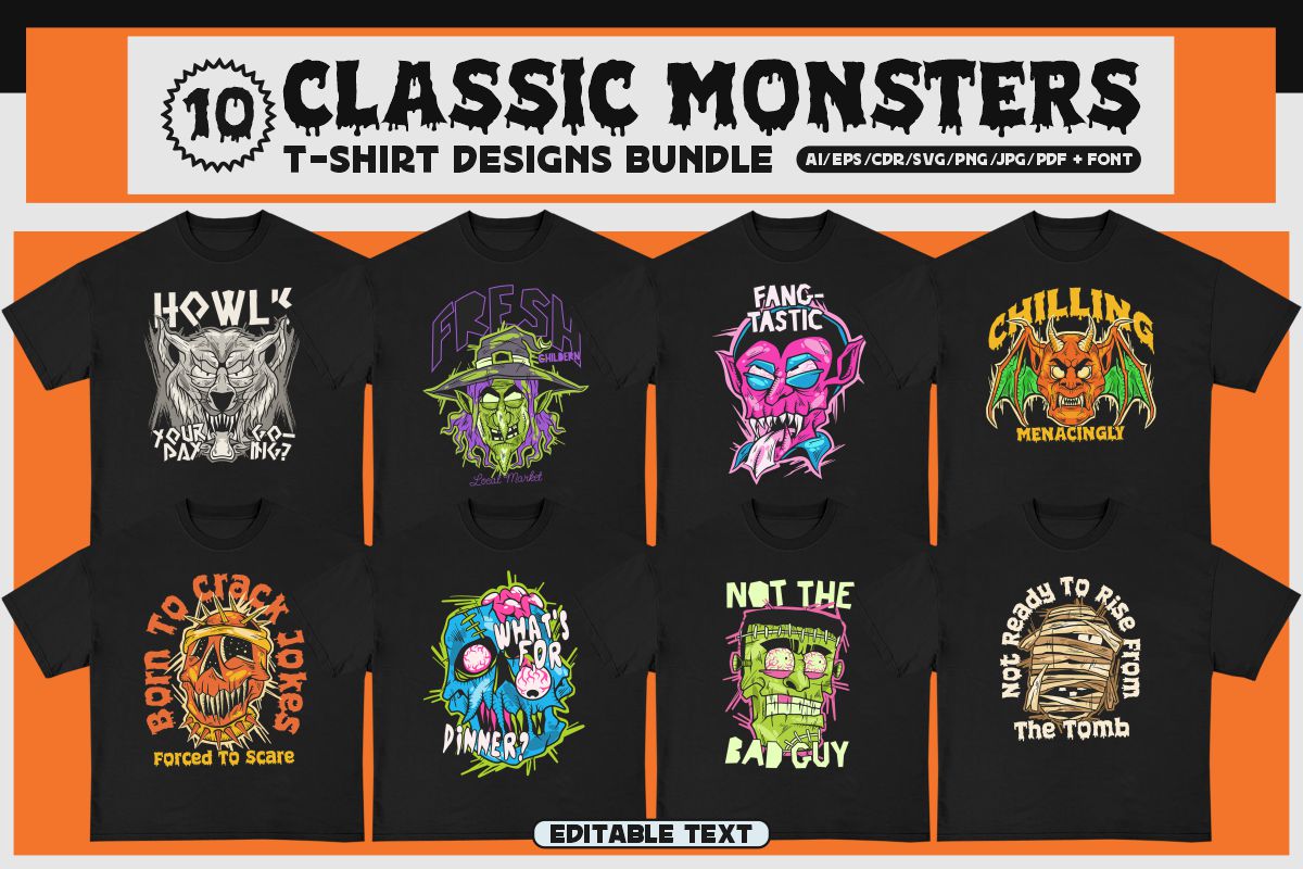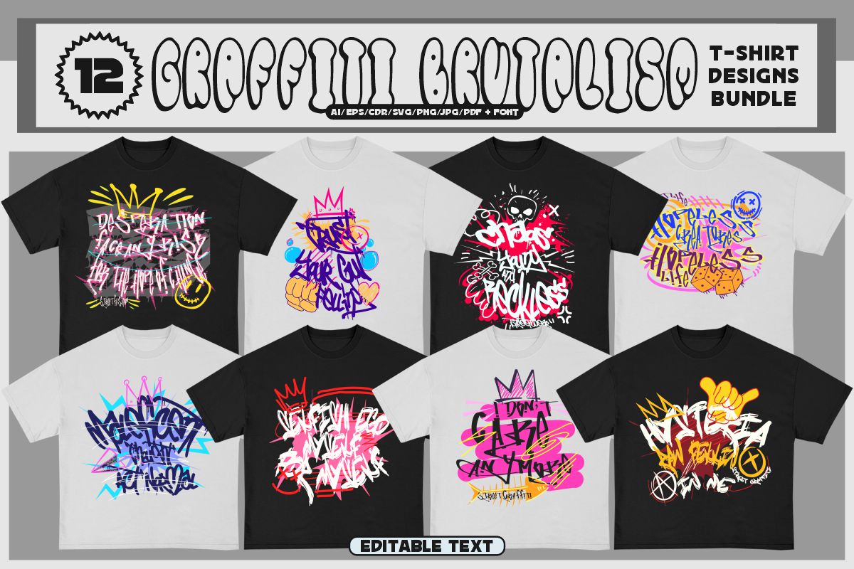 If you need something new in your PNG & vector graphics library or some cool illustrations for your new project we have a unique & BIG T-shirt or poster graphics bundle for you 🙂 With 230 unique style designs or illustrations you can create creative t-shirt designs, posters, stickers, invitations or other print or web designs. Start your very own t-shirt company right now with 230 ready to go t-shirt designs! This urban, cute, funny, horror & graffiti style graphic bundle includes 230 ready-made t-shirt designs with editable texts!