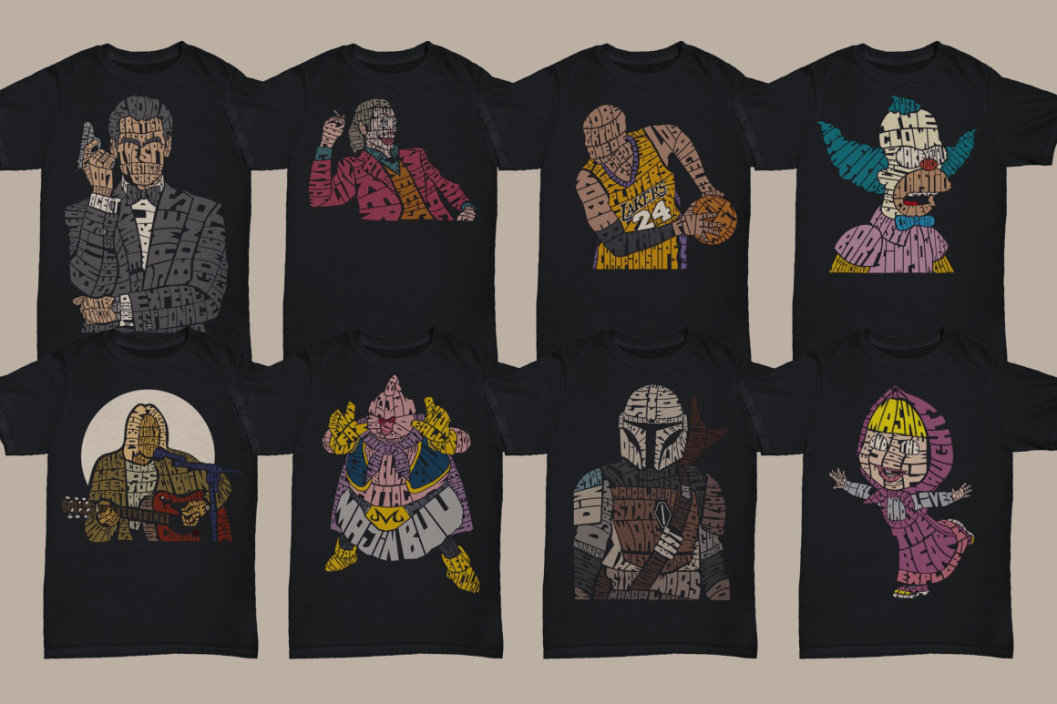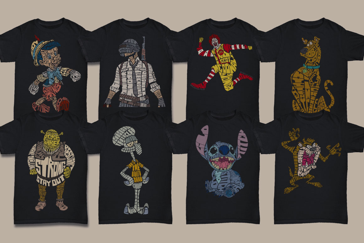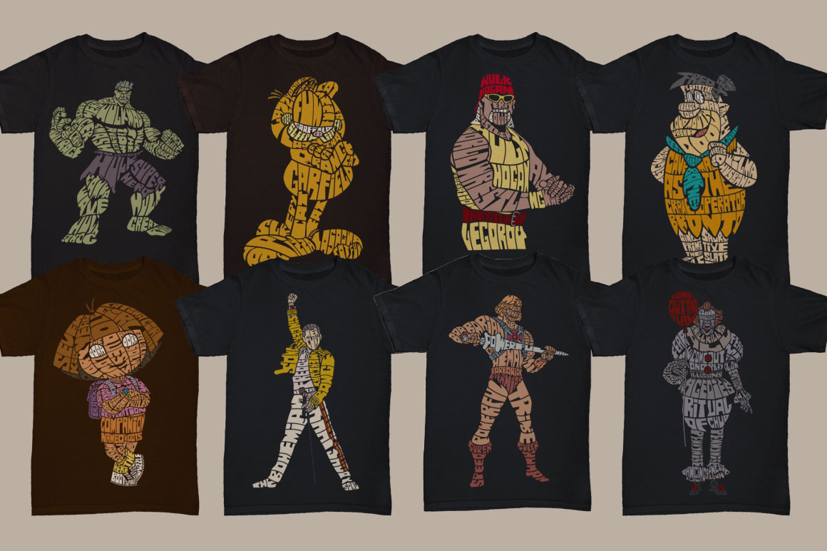 60 unique typography & cartoon – pop culture style vector illustrations in Ai, Eps, Cdr, Svg & bitmap formats PSS, Png