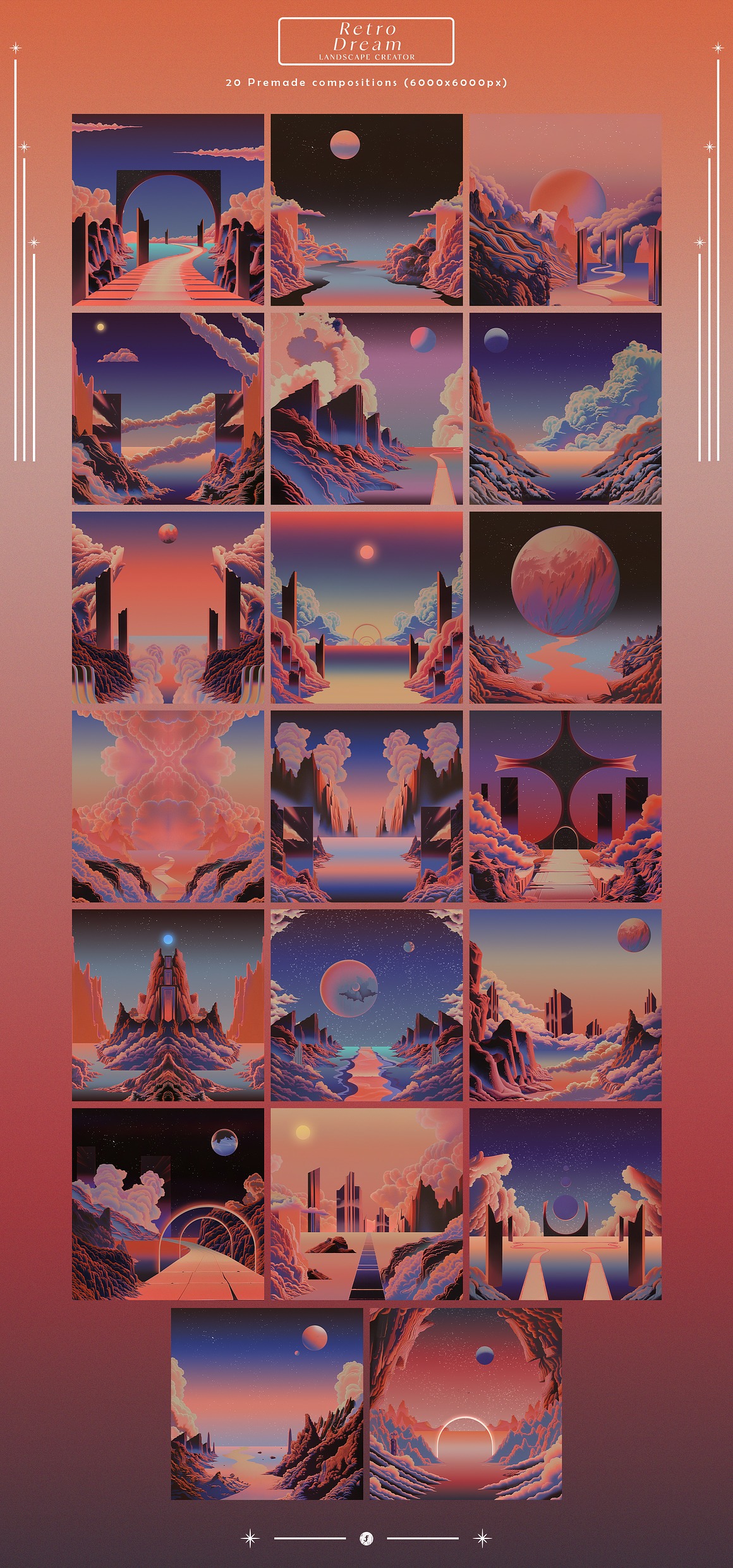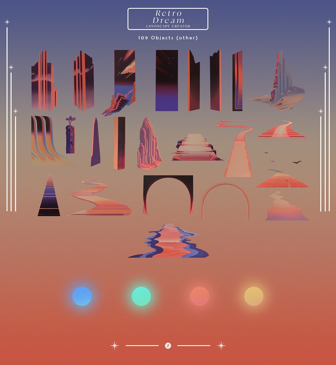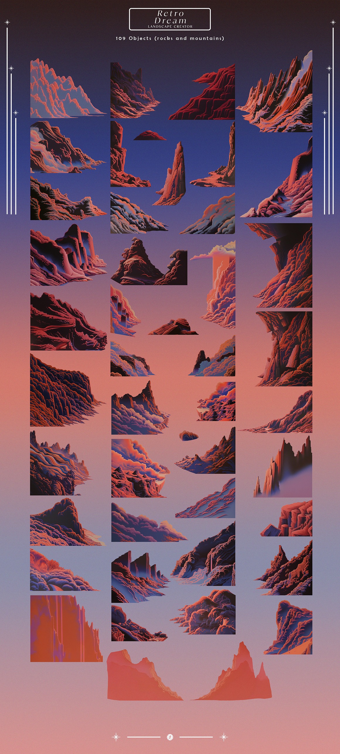 Endless Possibilities With the “Retro Dream Landscape Creator,” you can effortlessly design stunning artwork, promotional materials, album covers, or even immersive digital experiences. The high-resolution elements ensure that your final products look sharp and vibrant, whether in print or on-screen.