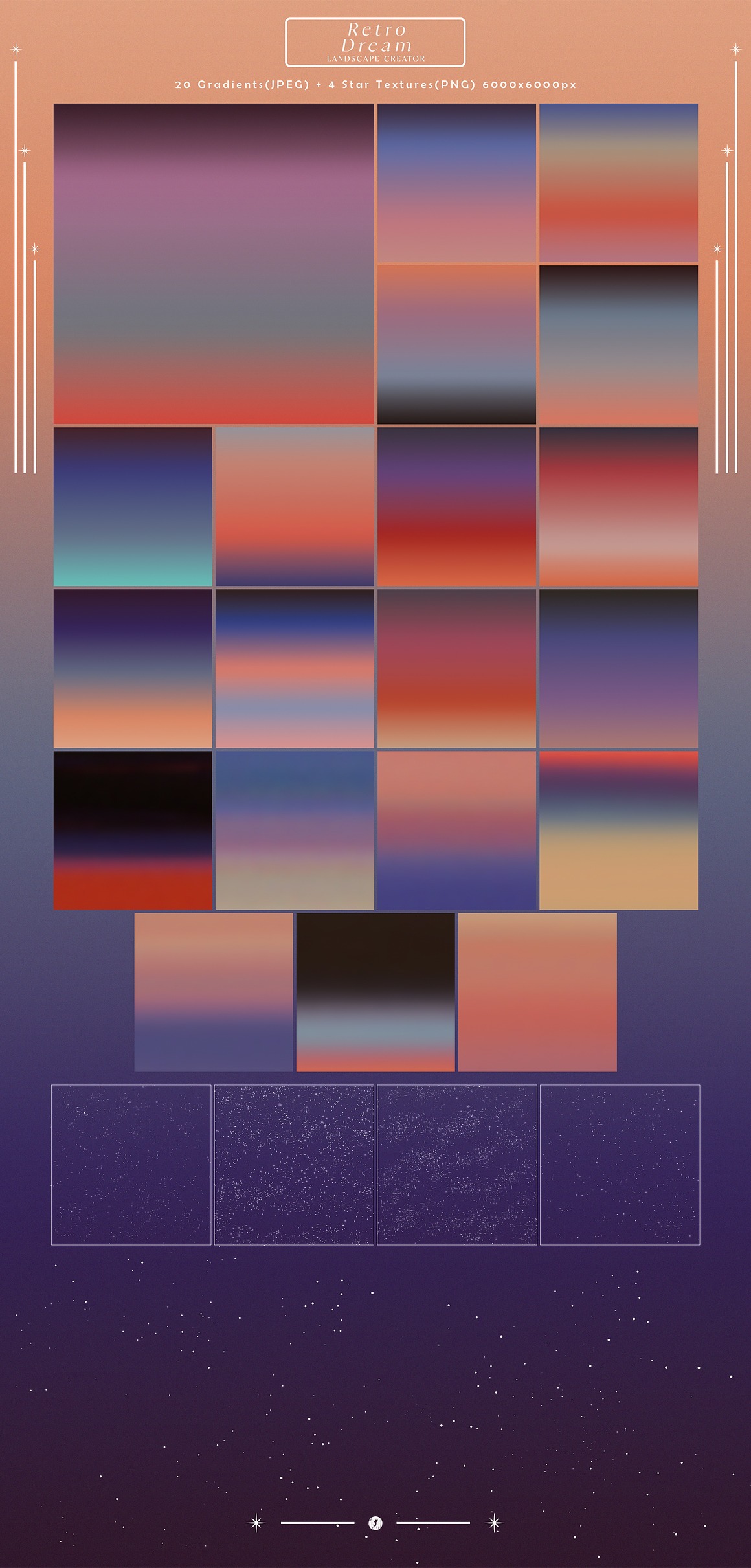 20 Retro Gradient Backgrounds (6000x6000px): These high-resolution gradients offer a vibrant base to build your dreamscape. The stunning colors and smooth transitions bring a retro flair while providing ample space for your creativity.