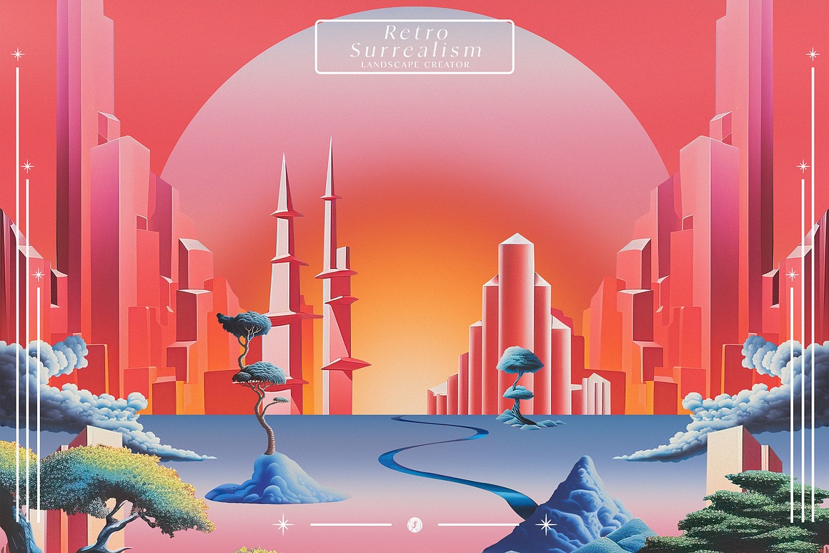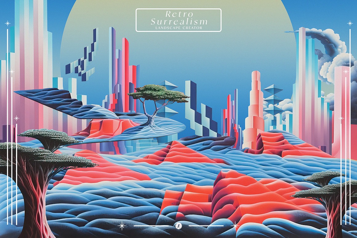 Introducing the “3 Retro & Surrealism Landscape Creators” – a captivating collection that invites you to embark on a journey into the realm of imagination and visual exploration. This curated assortment of graphics is your gateway to crafting mesmerizing landscapes and compositions that blend the boundaries of reality and the surreal.