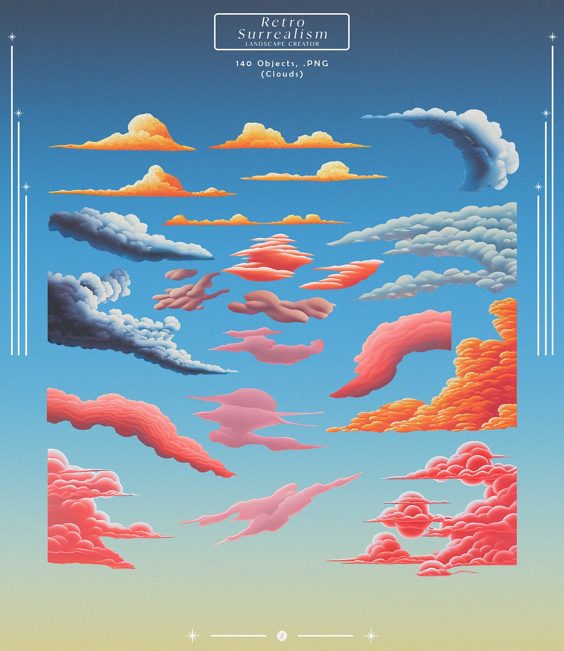Embrace the beauty of a dreamlike world with the “Retro Dream Landscape Creator” — a meticulously crafted collection of high-quality graphics designed to transport you to surreal retro-inspired landscapes. This extensive toolkit is ideal for artists, designers, and creators looking to add a nostalgic yet imaginative twist to their projects.