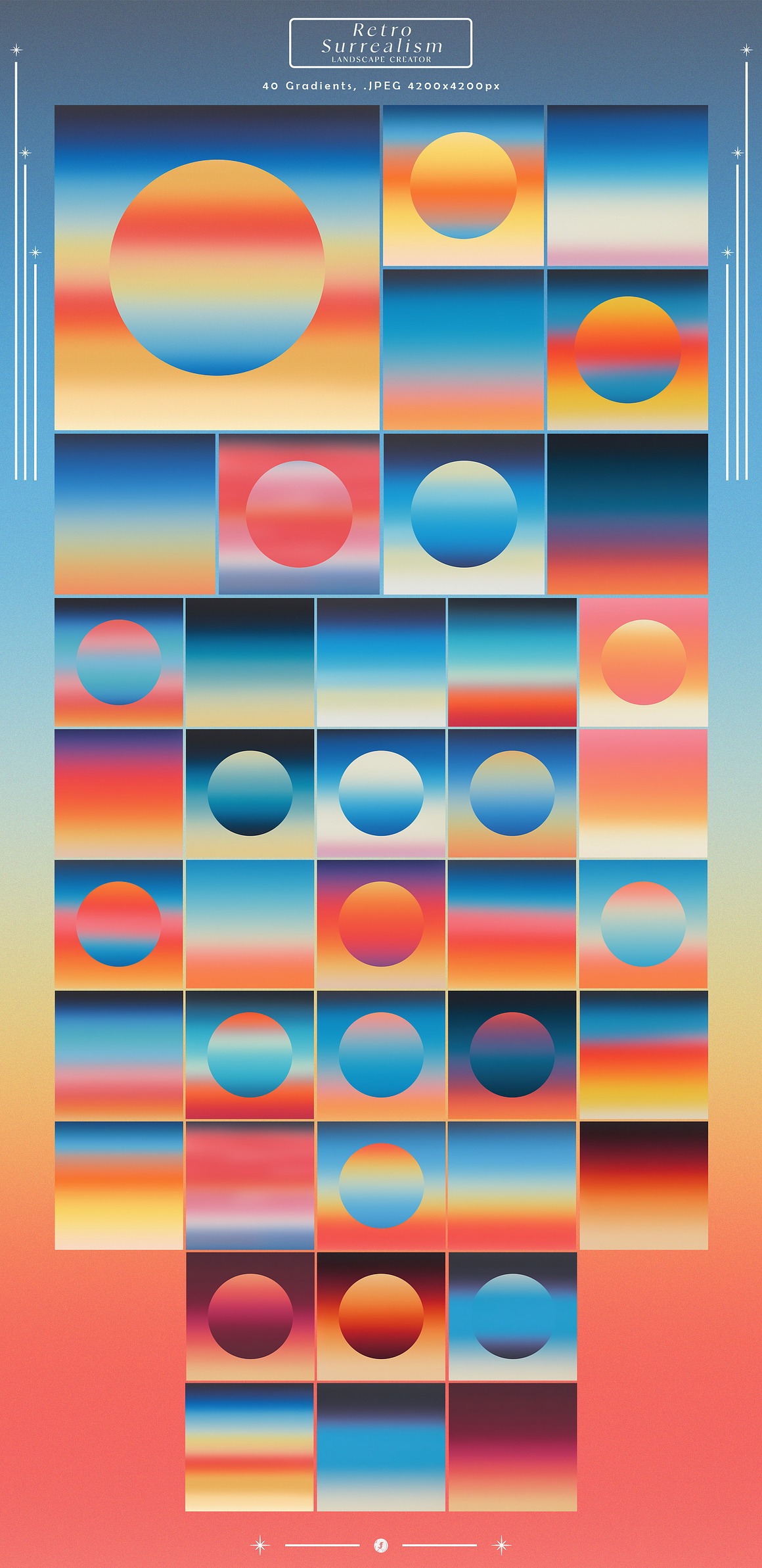 🌆 40 Retro Gradients Backgrounds: Transport your audience to an era of nostalgia with a curated palette of 40 retro gradients backgrounds. These color schemes are meticulously crafted to evoke a sense of vintage charm, adding a layer of authenticity to your surreal landscapes.