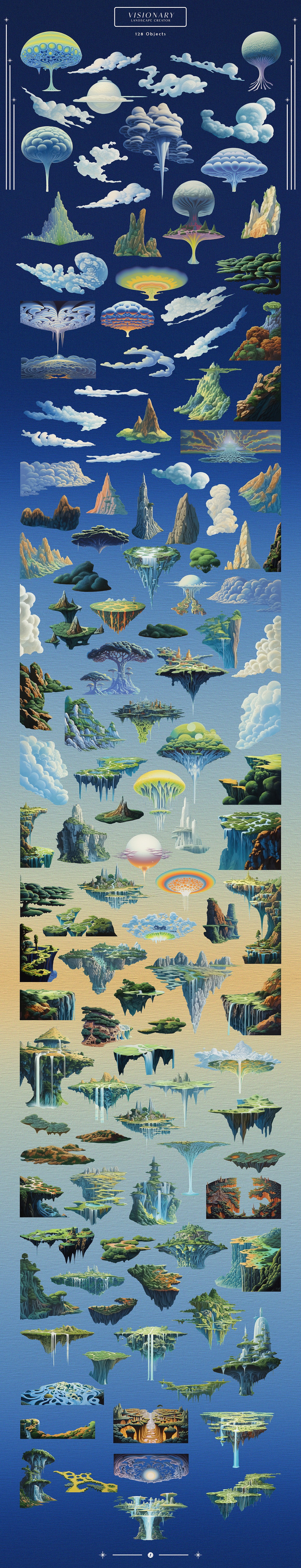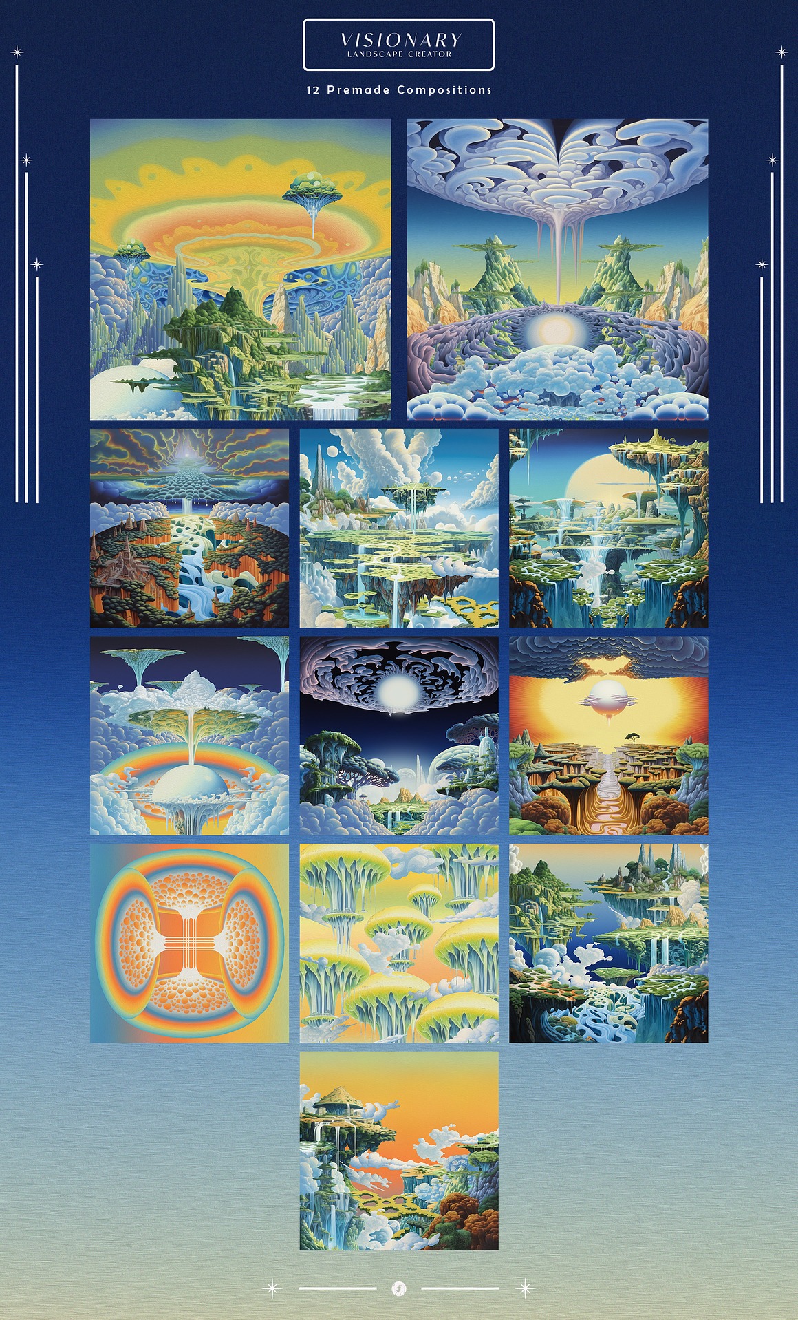 🖼️ 12 Premade Compositions: Short on time but big on inspiration? The Visionary Landscape Creator includes 12 premade compositions that serve as artistic foundations. These compositions, carefully crafted with an oil painting aesthetic, offer a head start for your creative endeavors. Add your personal touch to transform them into unique masterpieces.