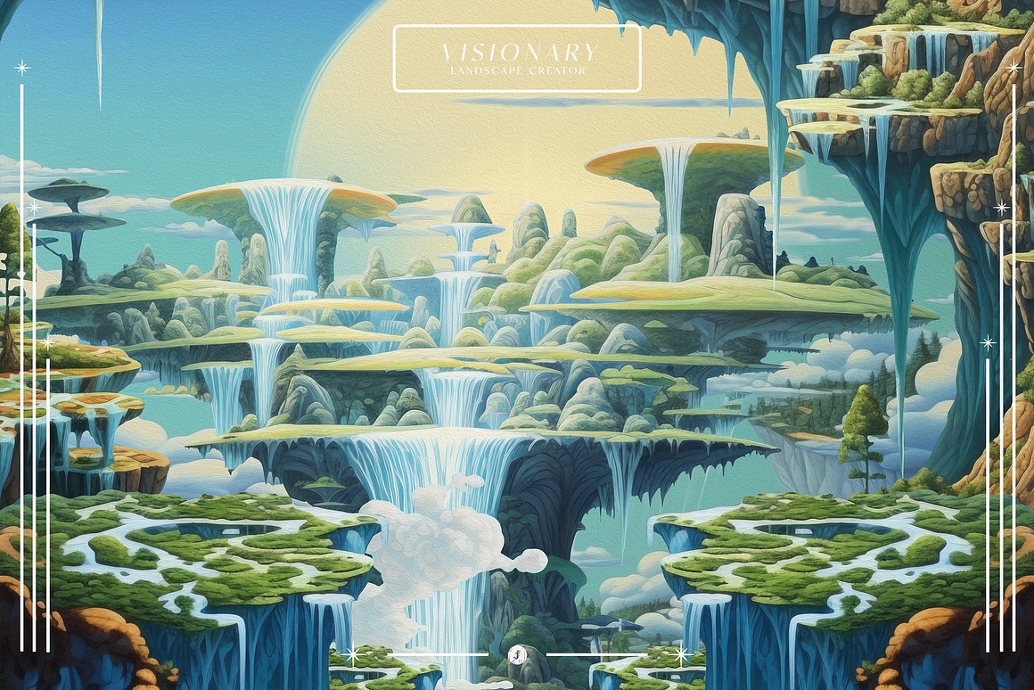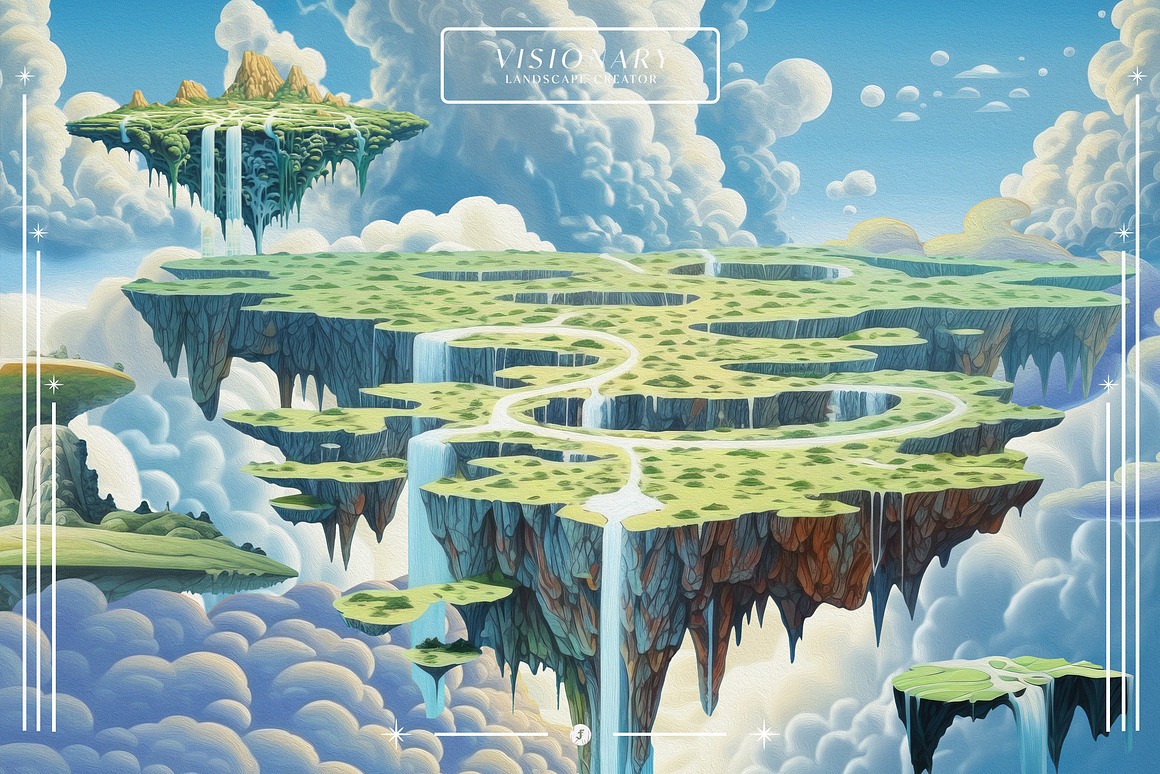 Introducing the “Visionary Landscape Creator” – where the ethereal meets the canvas in a mesmerizing dance of surreal beauty. Immerse yourself in a world where flying waterfalls cascade like liquid dreams, islands float with enchanting weightlessness, and transcendental graphic objects come to life with the rich and timeless allure of oil painting.