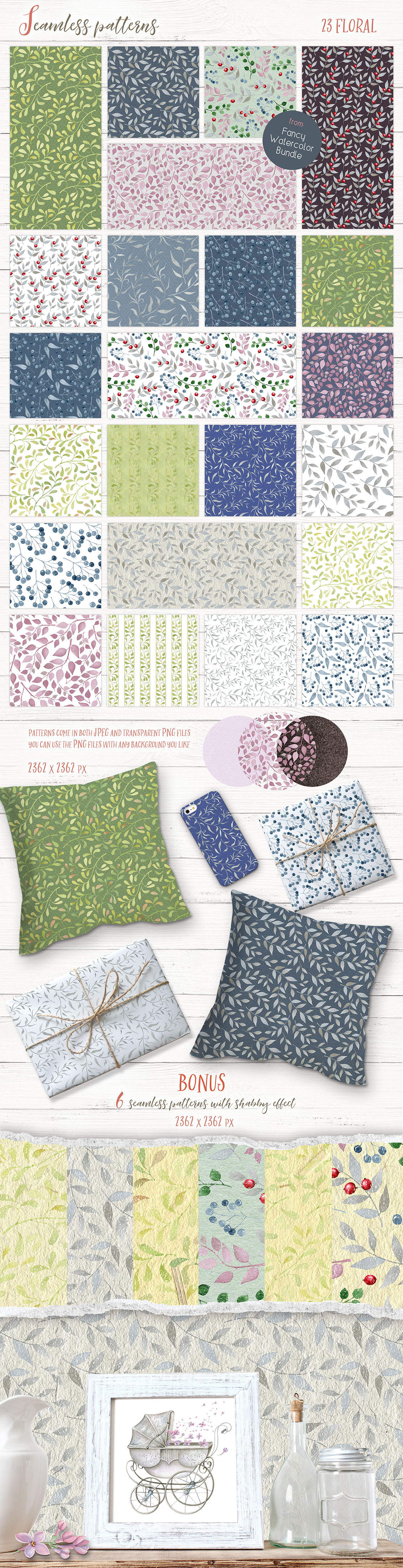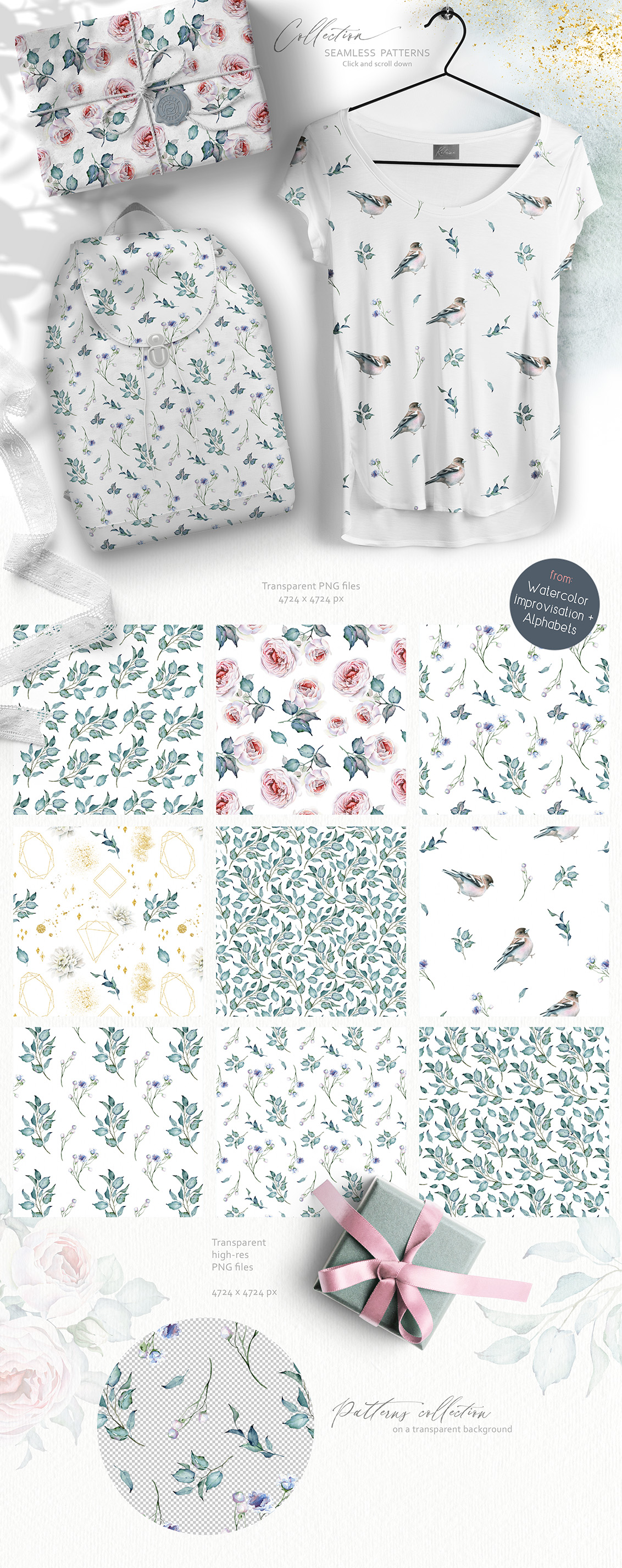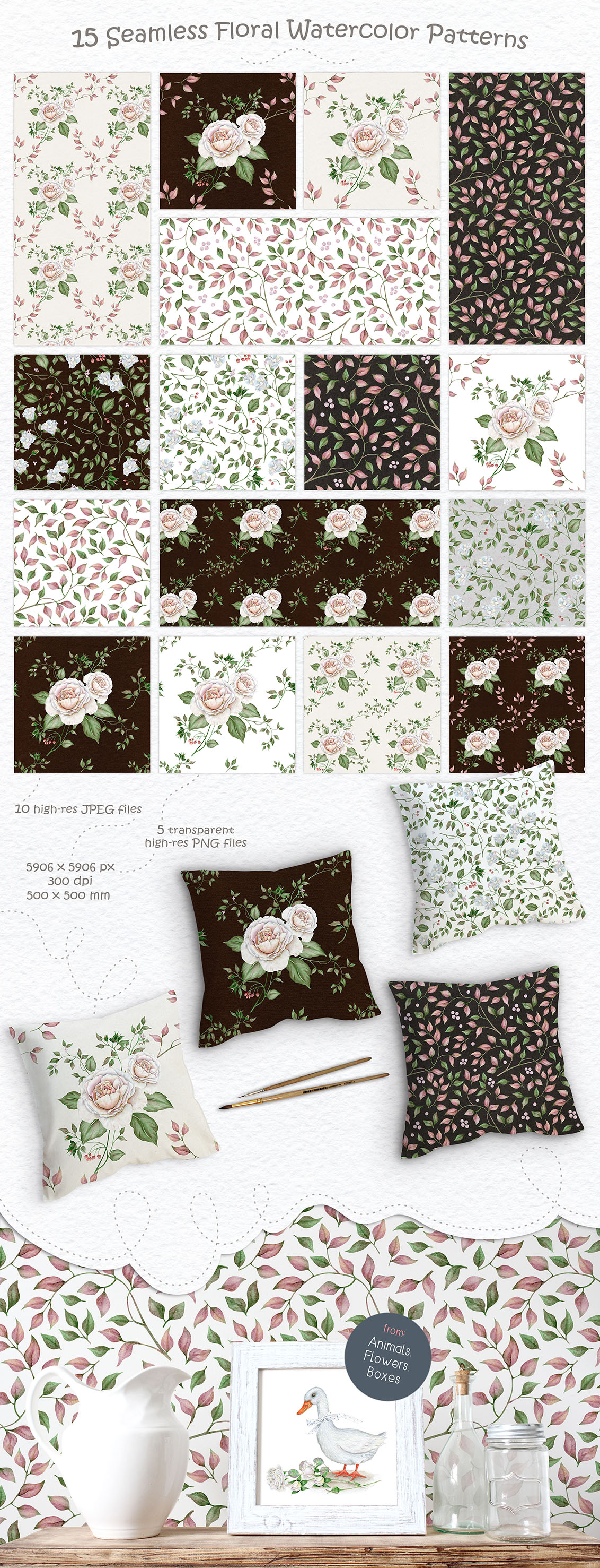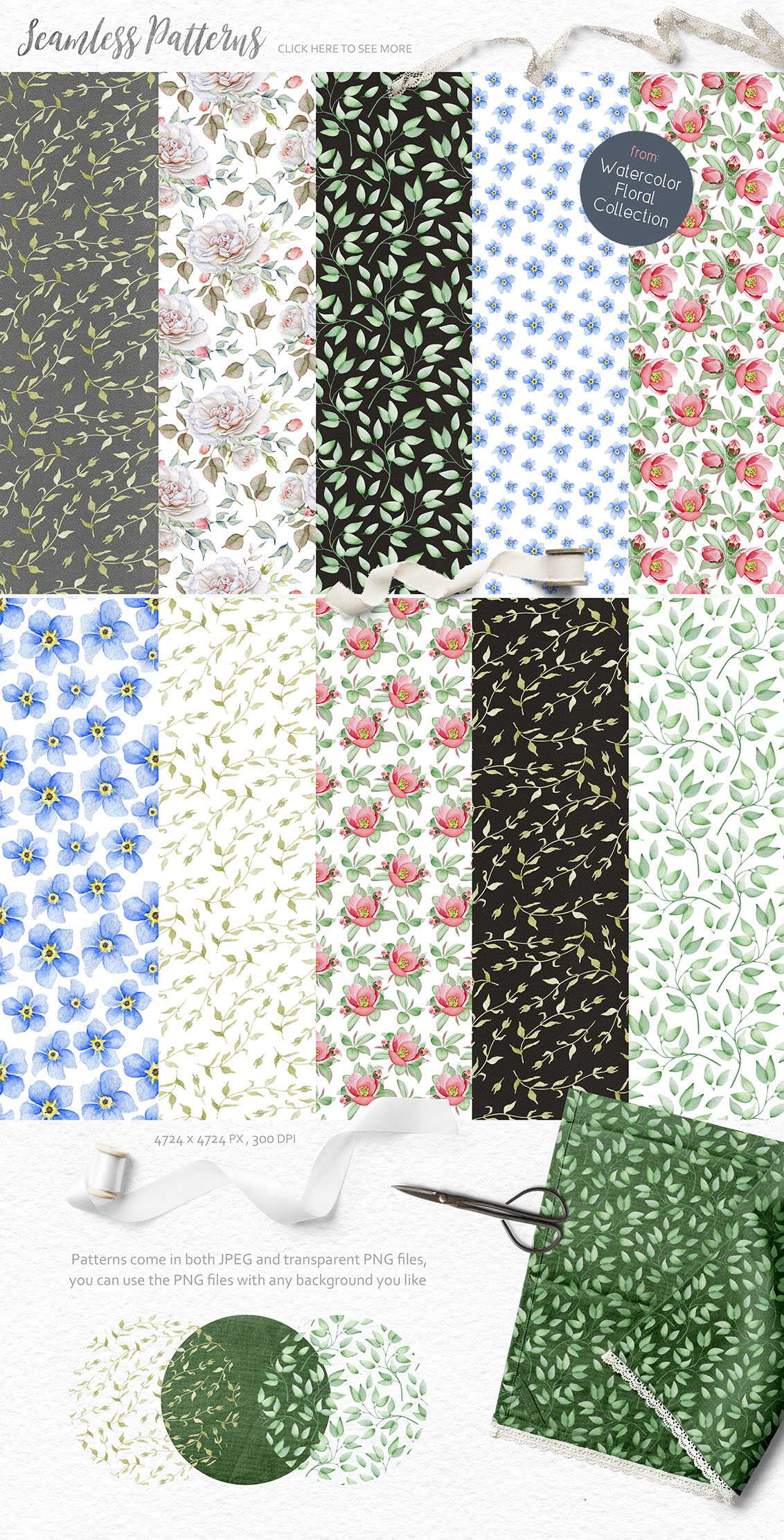 - 17 Watercolor Floral Collection seamless patterns, 4724 x 4724 px (7 PNG, 10 JPEG)