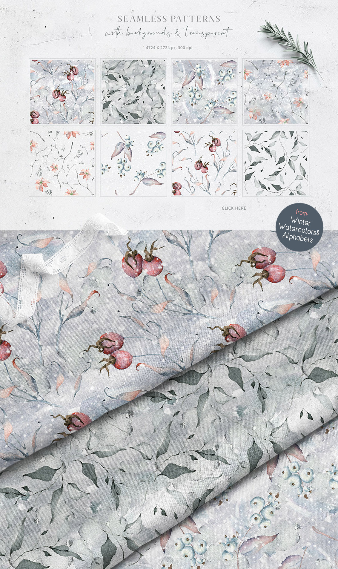 - 8 Winter Watercolors&Alphabets seamless patterns, 4724 x 4724 px (4 PNG, 4 JPEG)