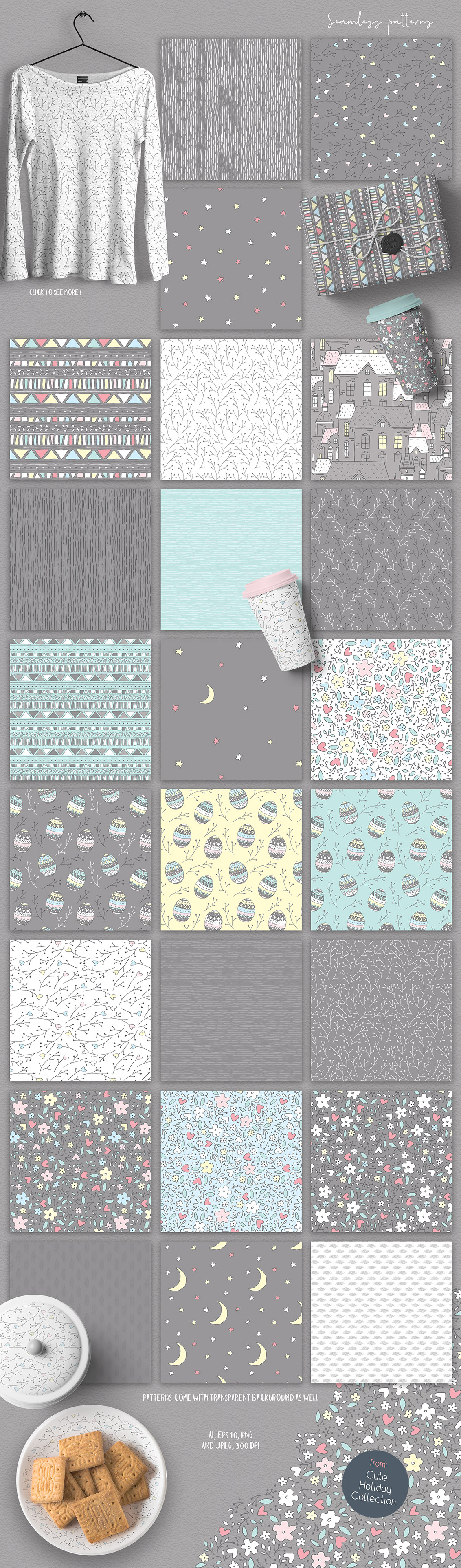 - 50 Cute Holiday Collection (BUNNIES) seamless patterns, the size of the patterns ranges from 1984 to 2067 px (21 PNG, 29 JPEG, 1 Ai, 1 Eps 10)