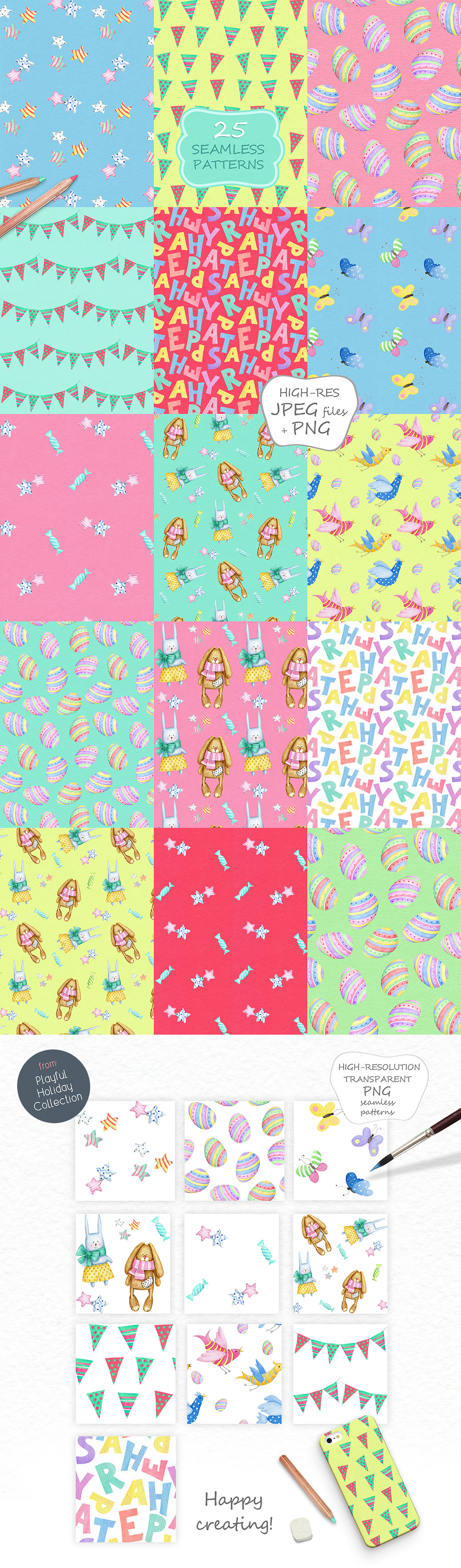 - 25 Playful Holiday Collection (Happy set) seamless patterns, the size of the patterns ranges from 2126 to 2362 px (10 PNG, 15 JPEG)