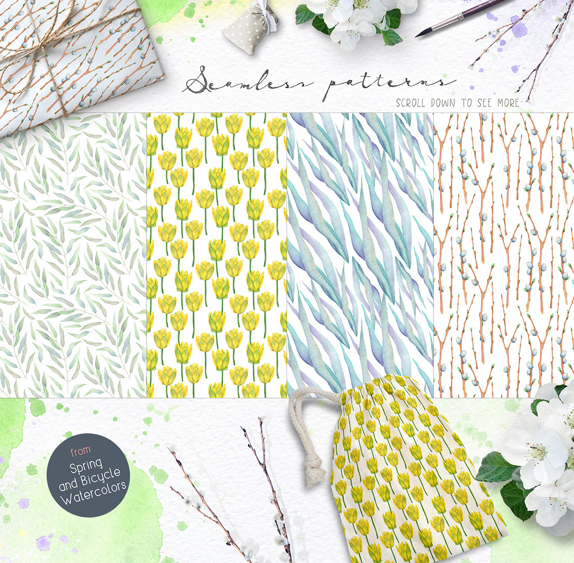 - 4 Spring and Bicycle Watercolors seamless patterns, 4724 x 4724 px (4 PNG)