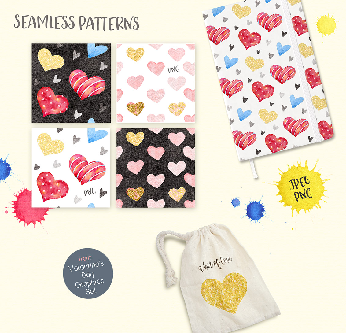 - 4 Valentine’s Day Graphics Set seamless patterns, 2362 x 2362 px, 2408 x 2408 px (2 PNG, 2 JPEG)