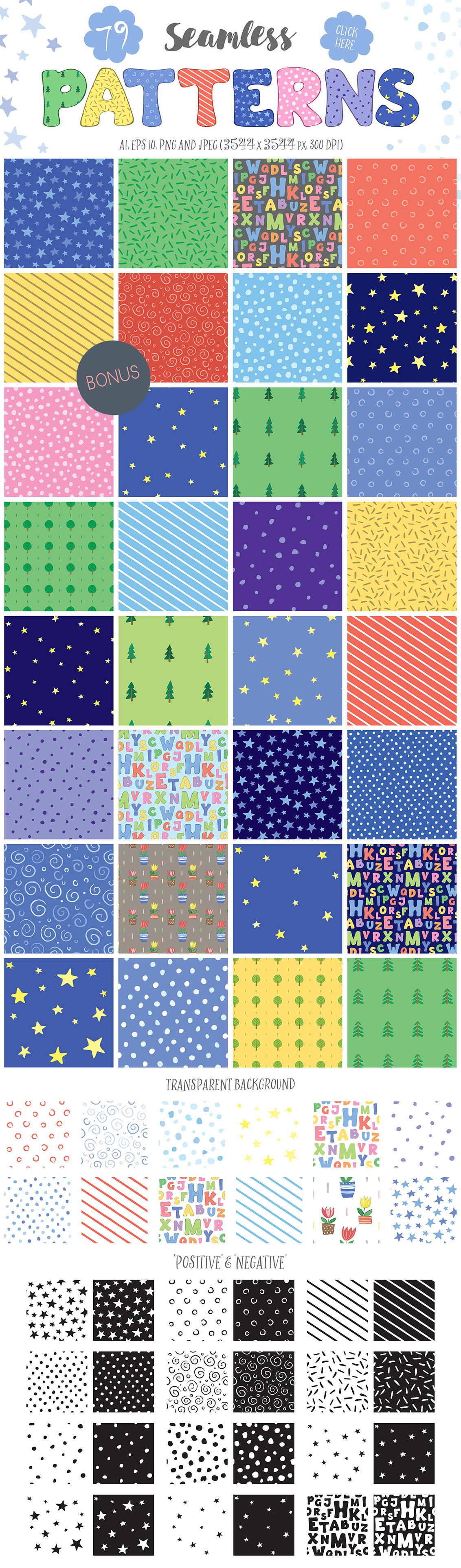 - 79 BONUS_1: seamless patterns, 3544 x 3544 px (43 PNG, 36 JPEG, 3 Ai, 3 Eps 10).