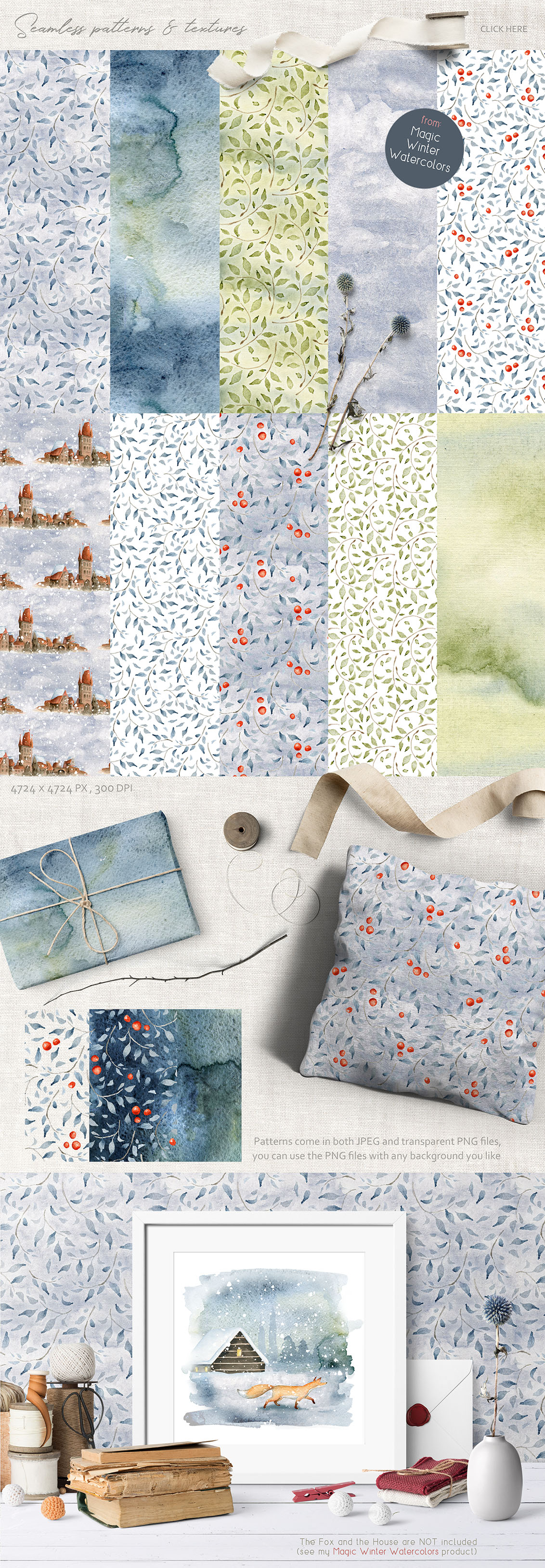 - 15 Magic Winter Watercolors seamless patterns, 4724 x 4724 px (4 PNG, 11 JPEG)