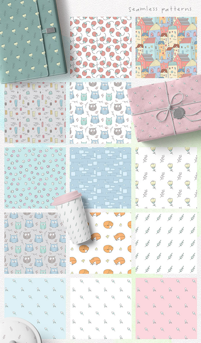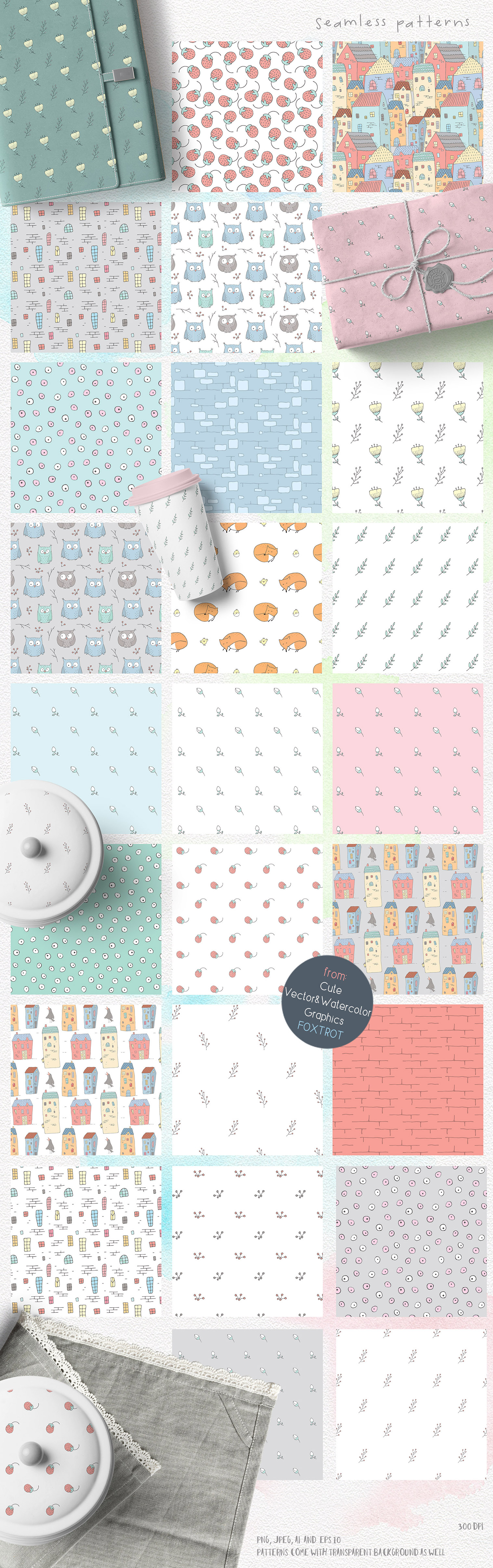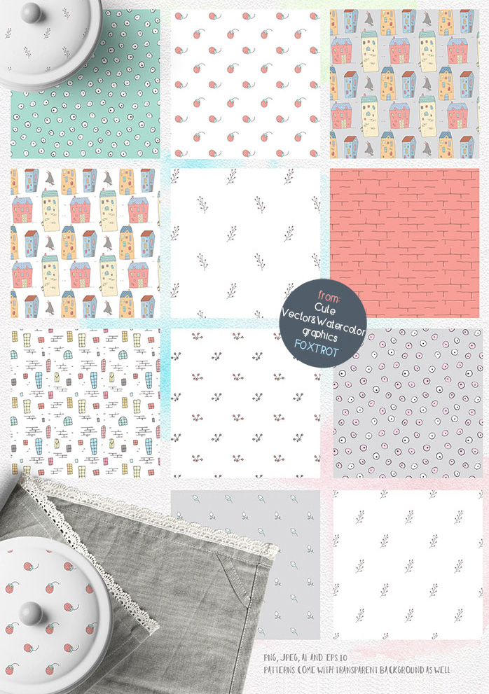 - 59 Cute Vector&Watercolor graphics FOXTROT seamless patterns, the size of the patterns ranges from 1772 to 2362 px (21 PNG, 38 JPEG, 1 Ai, 1 Eps 10)