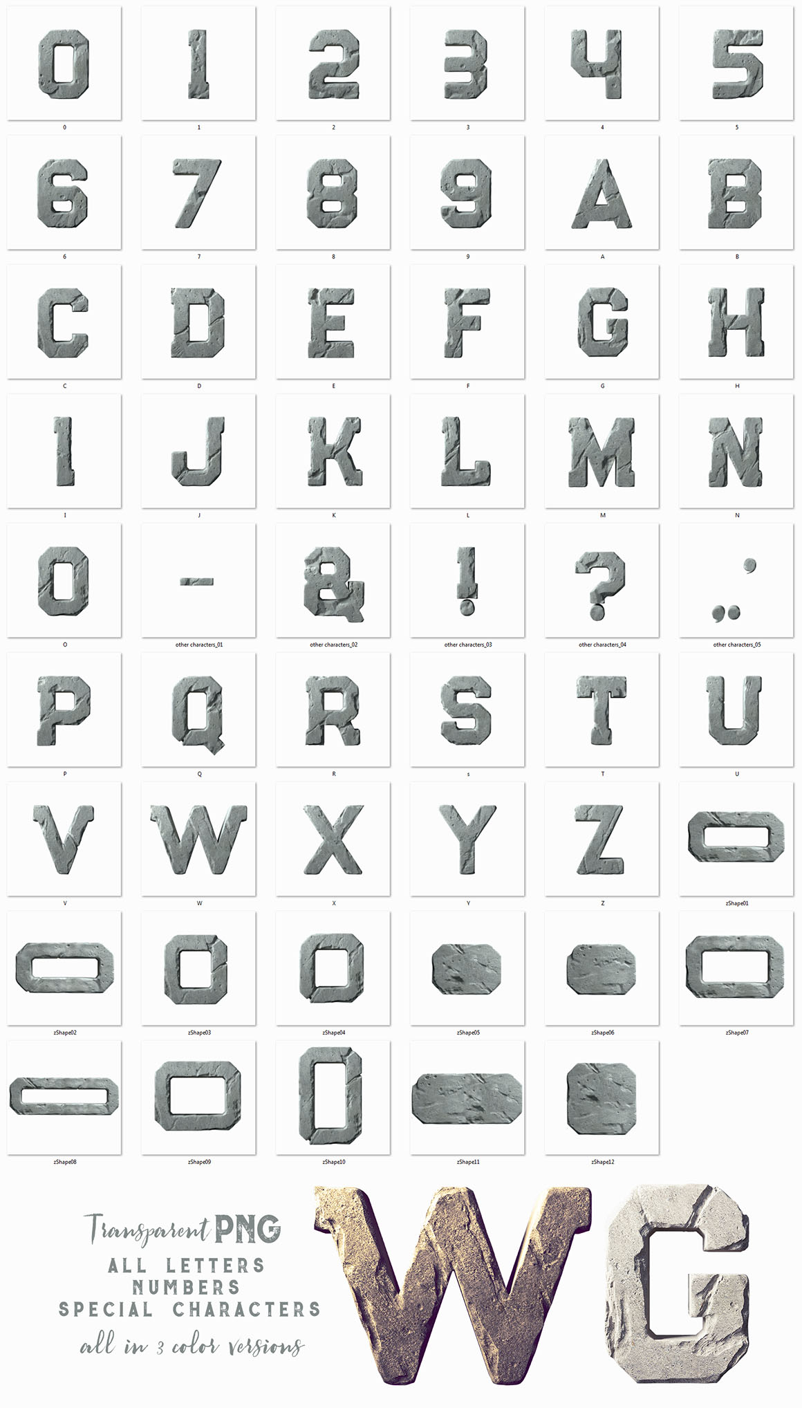 Hi-res 3D grunge stone letter renders (3000×3000 – but letter size is around 1500×2000). Great for your headers, posters, advertisments – any web or print projects. You’ll find here also layered PSD file with 10 effets (shadows, effects…) – just replace letter in smart object and you’ll see letter in all 10 effects.