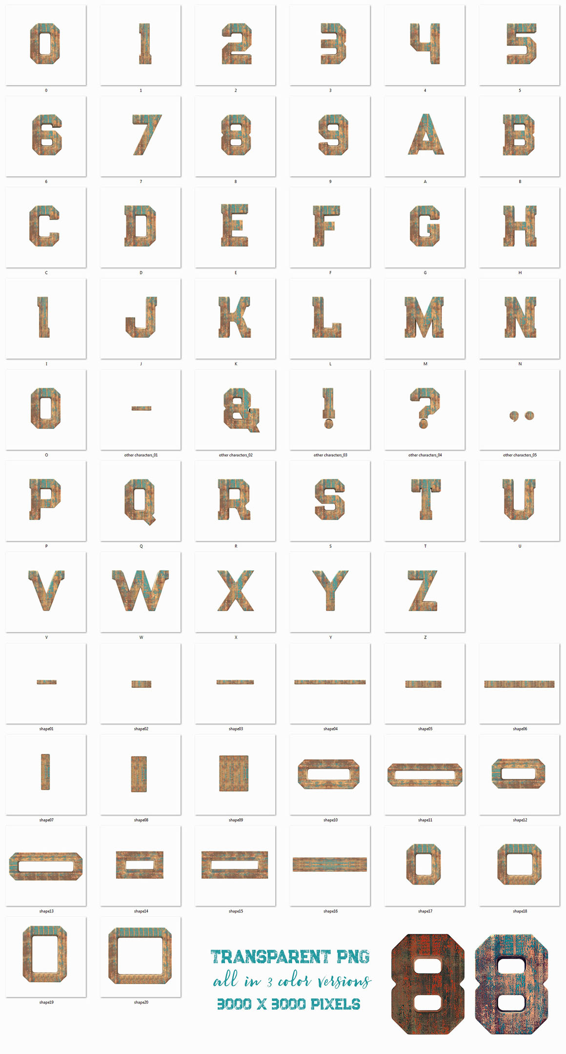 - Transparent PNG: lettering + 20 shapes (3000×3000 – but letter size is around 1500×2000)