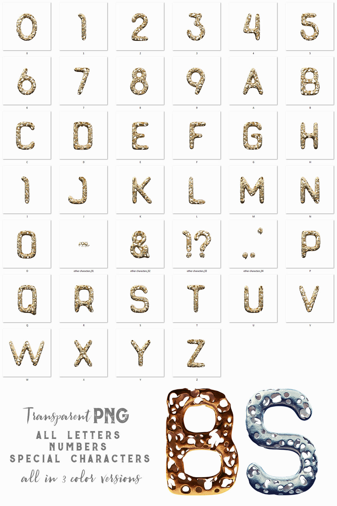 4. Full Of Holes – Golden 3D Lettering from MIIM Design Hi-res 3D golden or metalic lettering renders with holes (3000×3000 – but letter size is around 1500×2000). Great for your headers, posters, advertisments – any web or print projects. You’ll find here also layered PSD file with 10 effets (shadows, effects…) – just replace letter in smart object and you’ll see letter in all 10 effects.