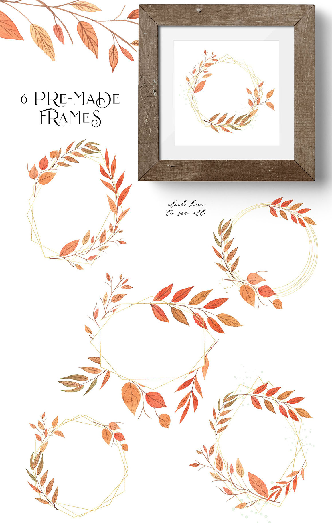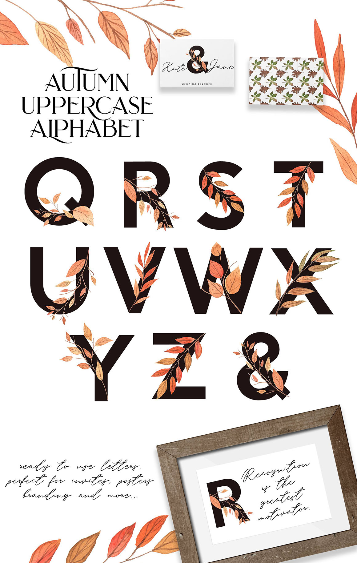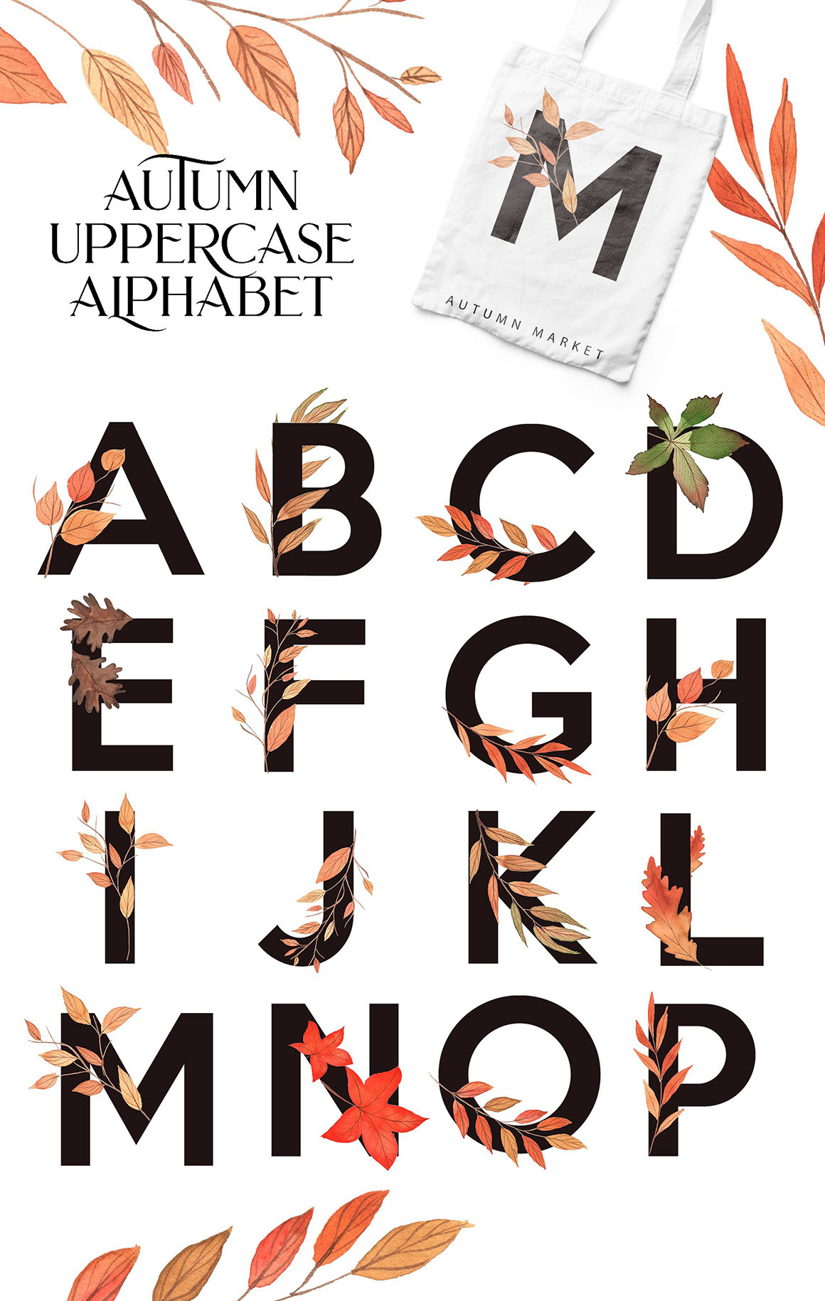 Autumn Orange MOOD design set filled with DIY elements, stylish autumn uppercase letter, seamless pattern and pre-made frames. This collection contains many ready-made graphics: frames, DIY elements, alphabet and more. Be sure to click on the image to see all elements. These elements are ideal for the creation of the corporate identity of your flowers shop or your small store. Or if you suddenly need to decorate your room or create a wedding invitation. Add this beautiful flowers and frames to create a postcard.