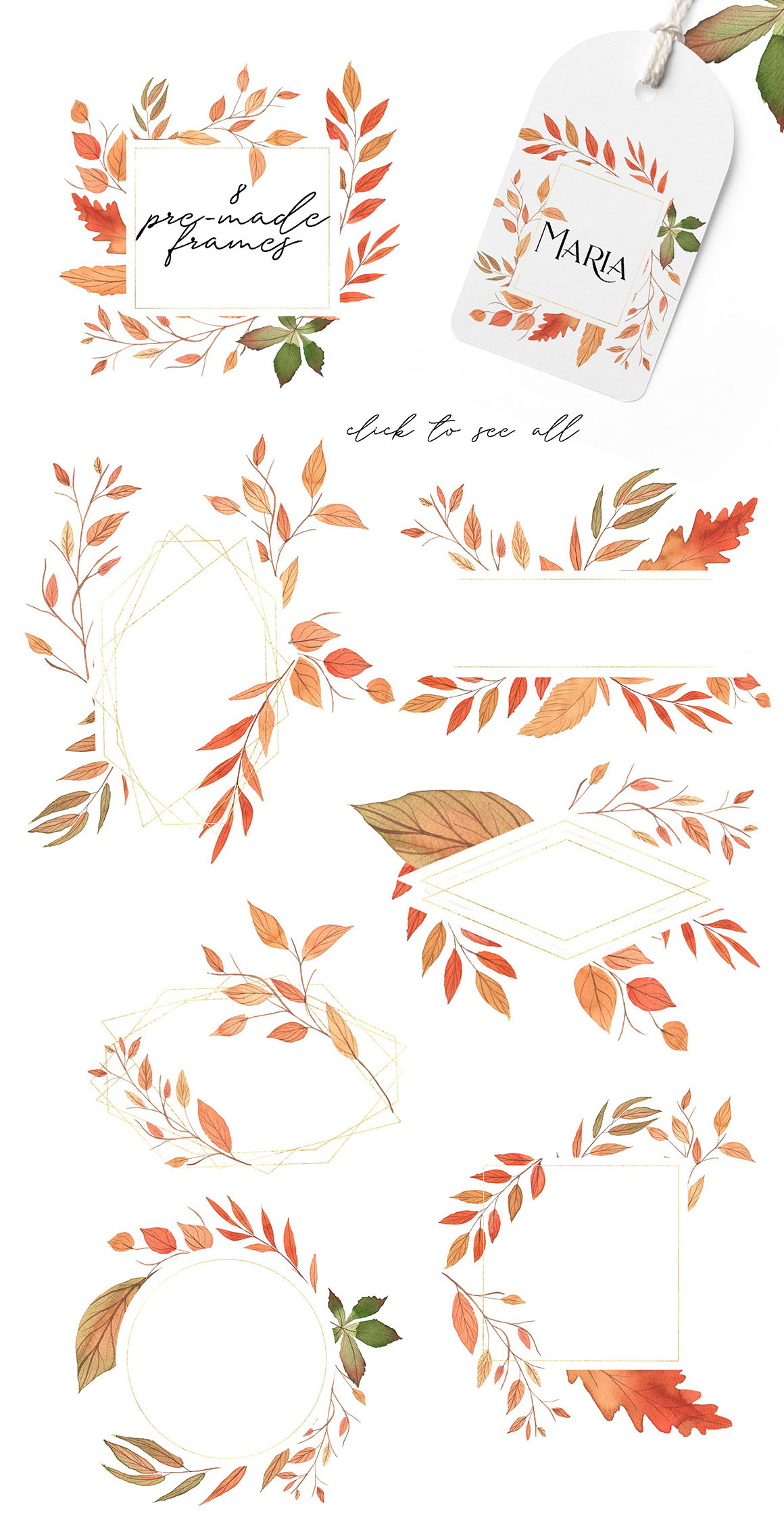 - watercolor, leaves, frames, florals, wreath, DIY elements, alphabets, seamless patterns