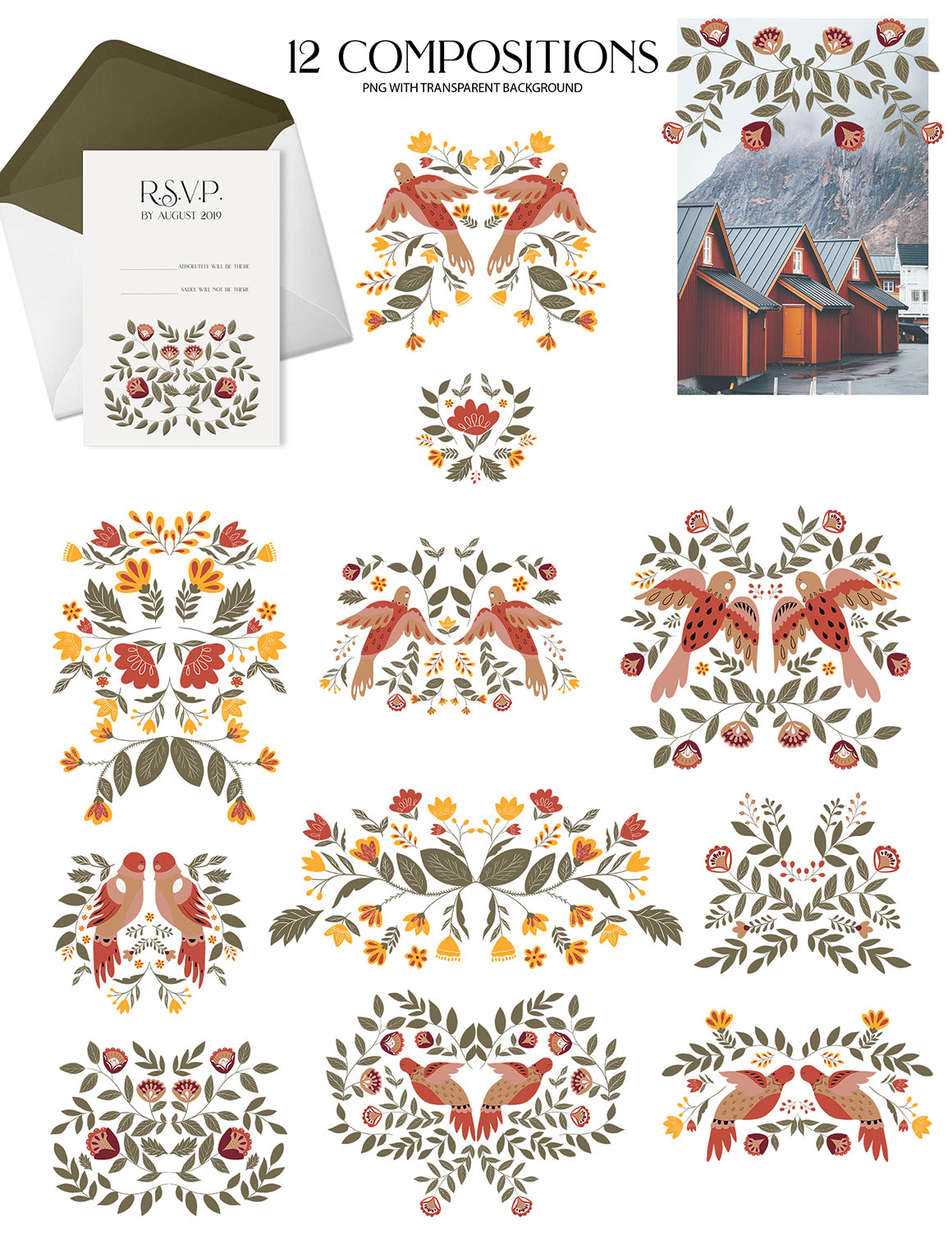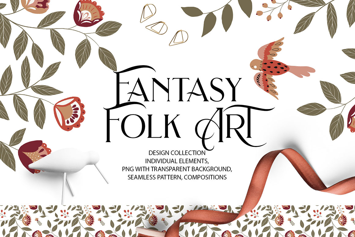 Fantasy Folk Art design set filled with individual design elements, , seamless pattern and ready to use compositions. Be sure to click on the image to see all elements. This product was created to help you make your digital images even more beautiful and unique. This pack can be used to create anything as you wish, logos invitation cards, make scrapbooking, wedding cards, birthday cards, home decor, packaging holiday gifts, party decorations, print on fabrics and so much more.