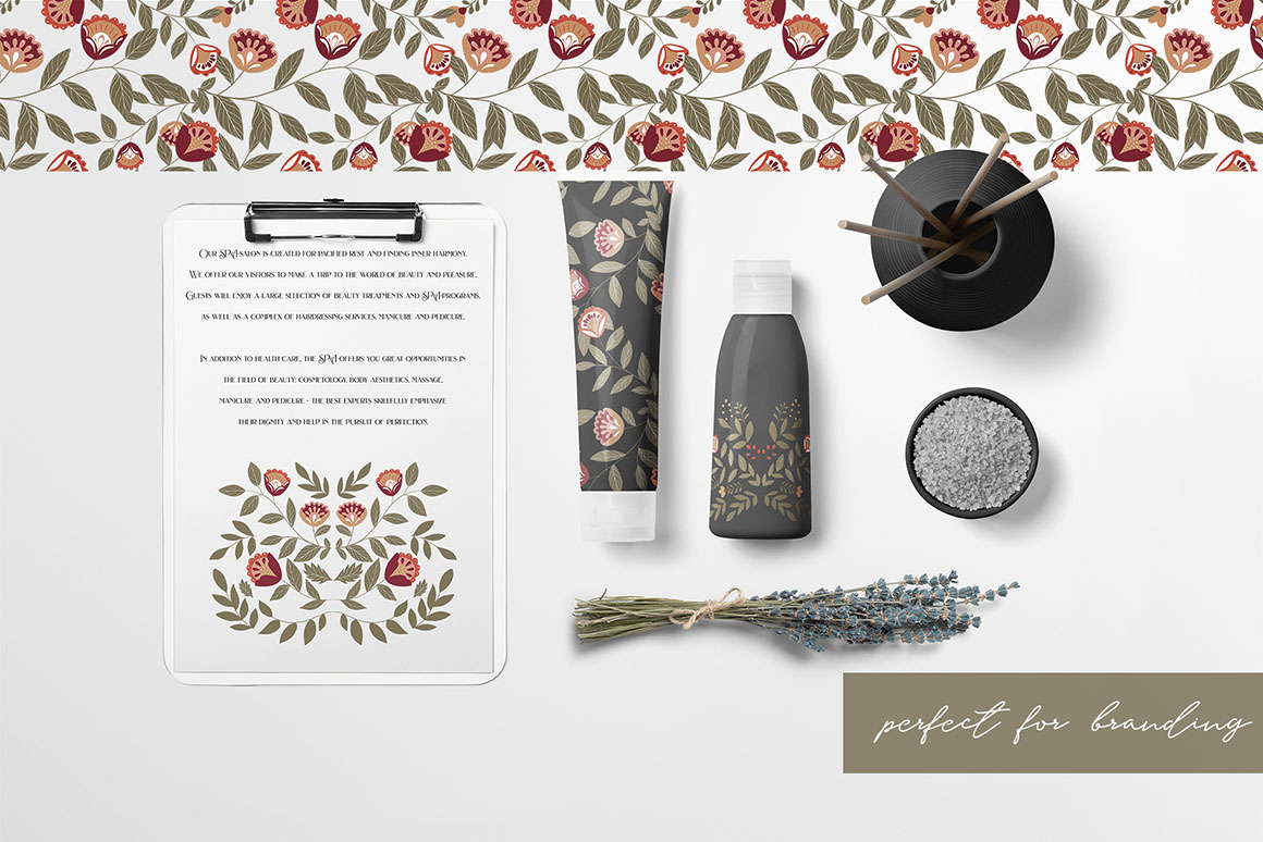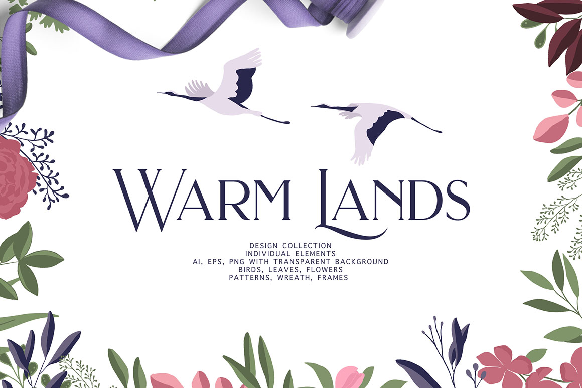 Warm Lands design set filled with individual design elements, , seamless pattern and pre-made frames. Be sure to click on the image to see all elements. These elements are ideal for the creation of the corporate identity of your flowers shop or your small store. Or if you suddenly need to decorate your room or create a wedding invitation. Add this beautiful flowers and frames to create a postcard.