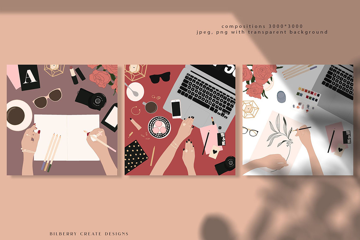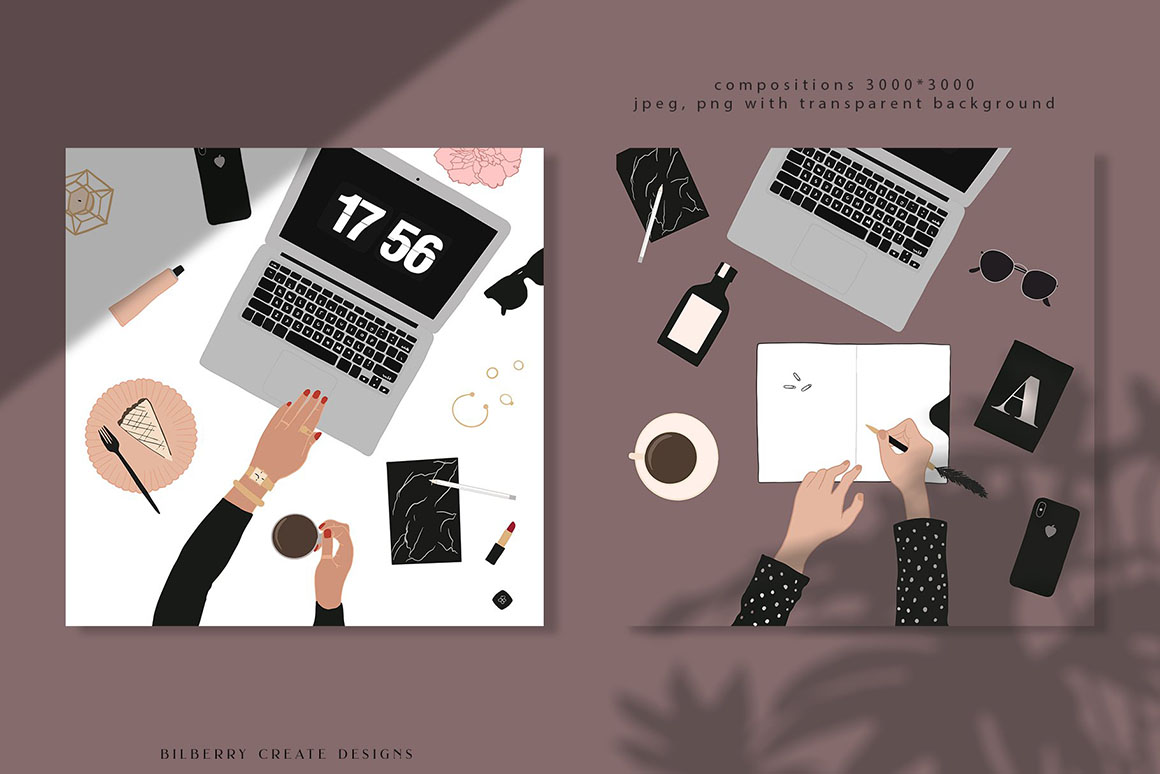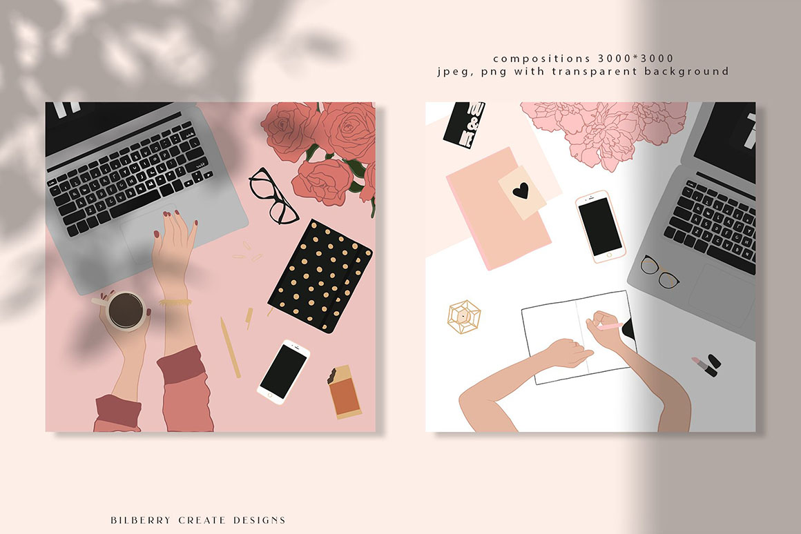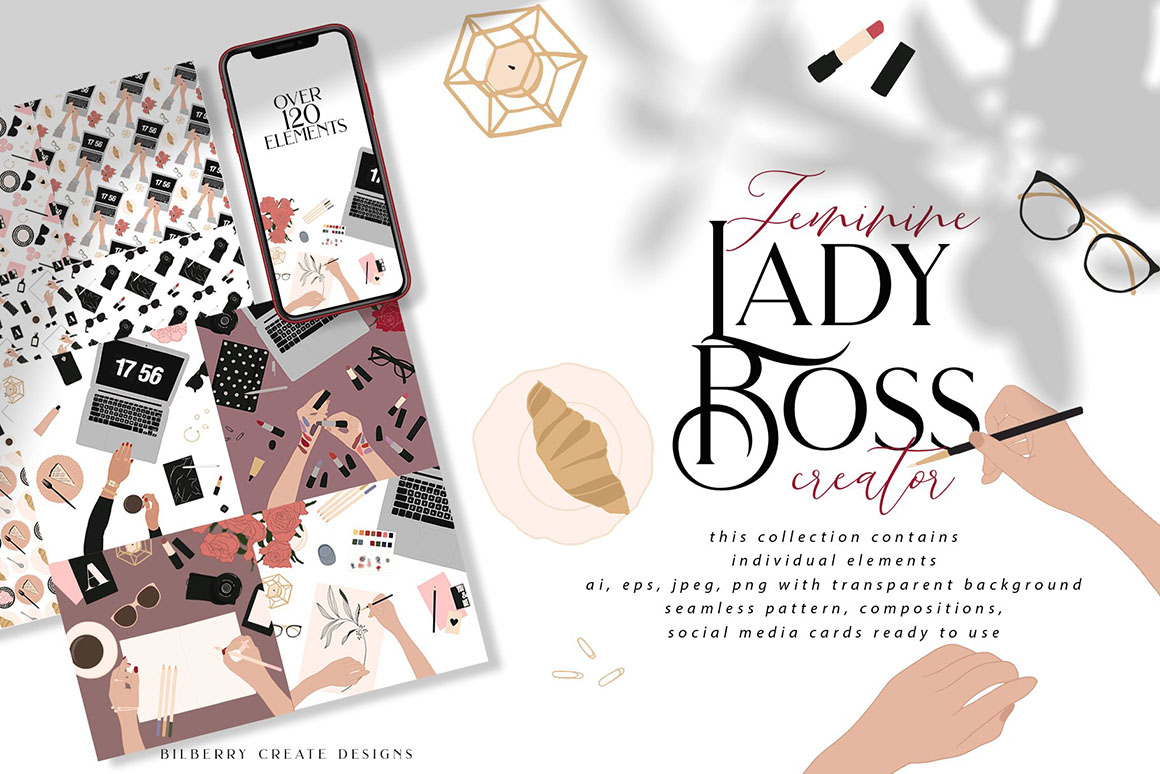 Feminine Lady Boss creator Illustration is a kit for creative bloggers and girl bosses. I am thrilled to introduce my brand new product – Feminine Lady Boss creator. The collection has more than 120 elements, it is perfectly suitable for custom design for your customers or DIY your own stuff just for fun! Feminine Lady Boss creator design set filled with individual design elements, seamless pattern, compositions, social media cards ready to use:)