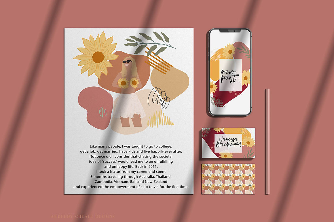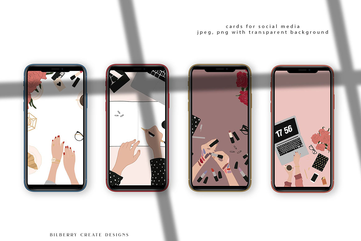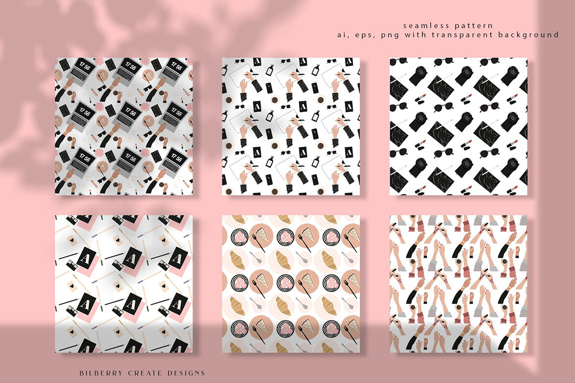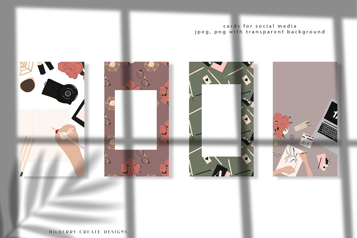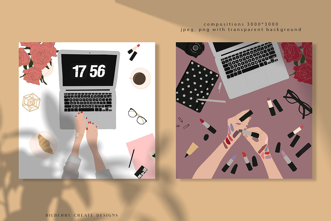 Feminine Lady Boss creator Illustration is a kit for creative bloggers and girl bosses. I am thrilled to introduce my brand new product – Feminine Lady Boss creator. The collection has more than 120 elements, it is perfectly suitable for custom design for your customers or DIY your own stuff just for fun! Feminine Lady Boss creator design set filled with individual design elements, seamless pattern, compositions, social media cards ready to use:)