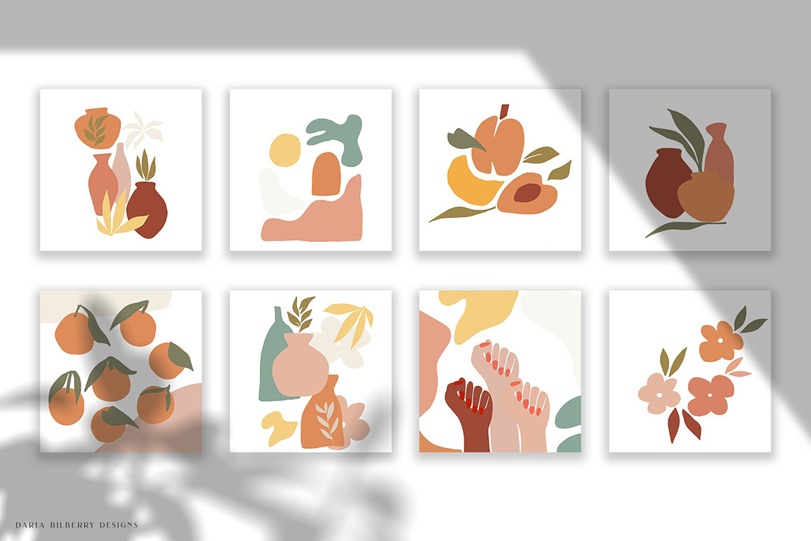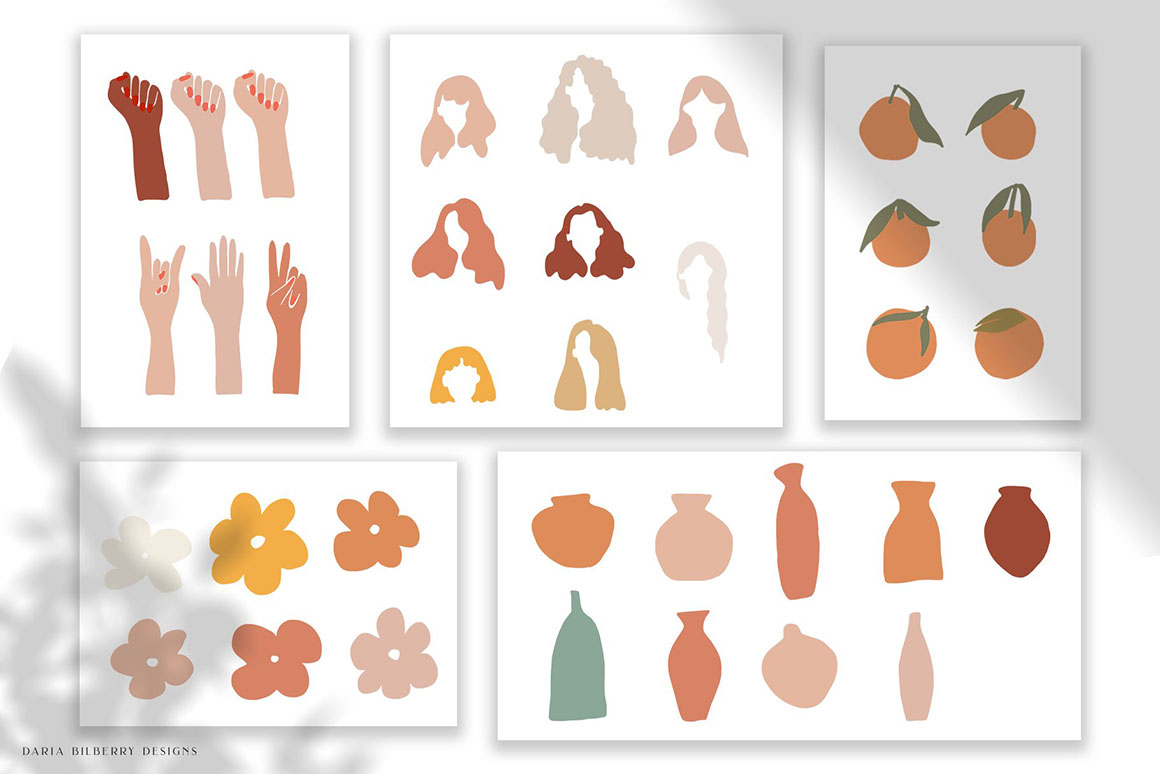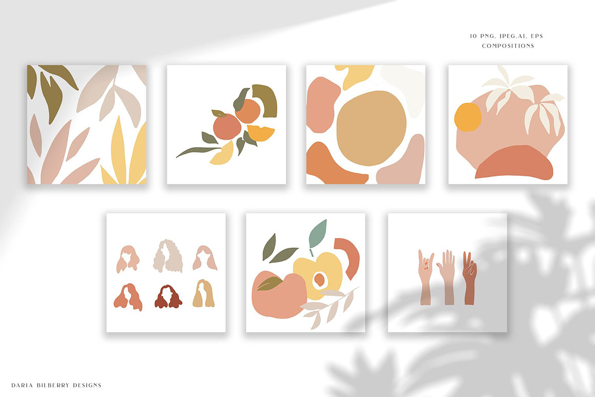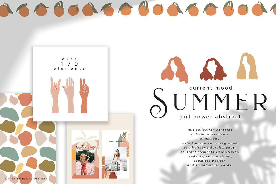 current mood SUMMER Illustration is a great technique for creating really modern, minimalistic illustrations that can be used for a wide variety of applications. current mood SUMMER design set (over 170 elements) filled with individual design elements, girl hairstyle, girl hands, vases, fruits, leaves, social media cards, seamless pattern, compositions, abstract splashes and more.