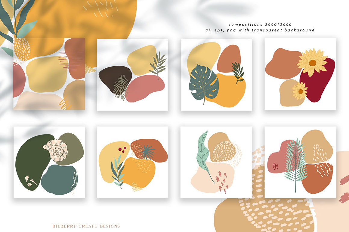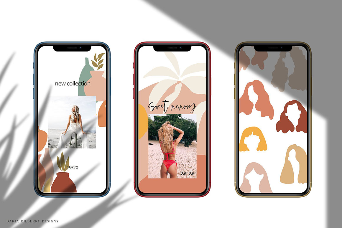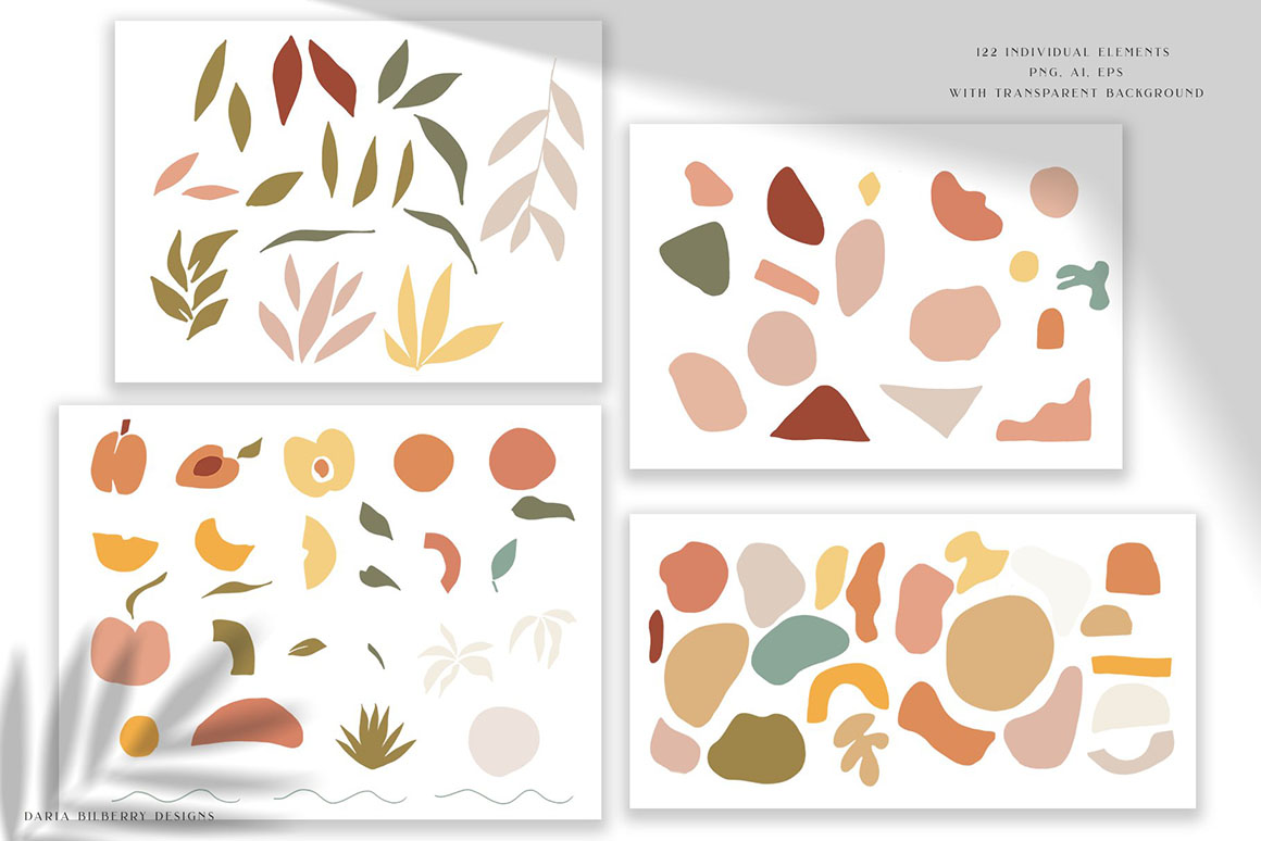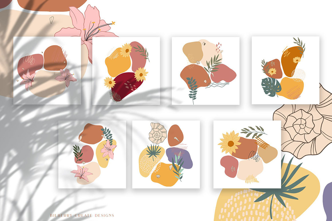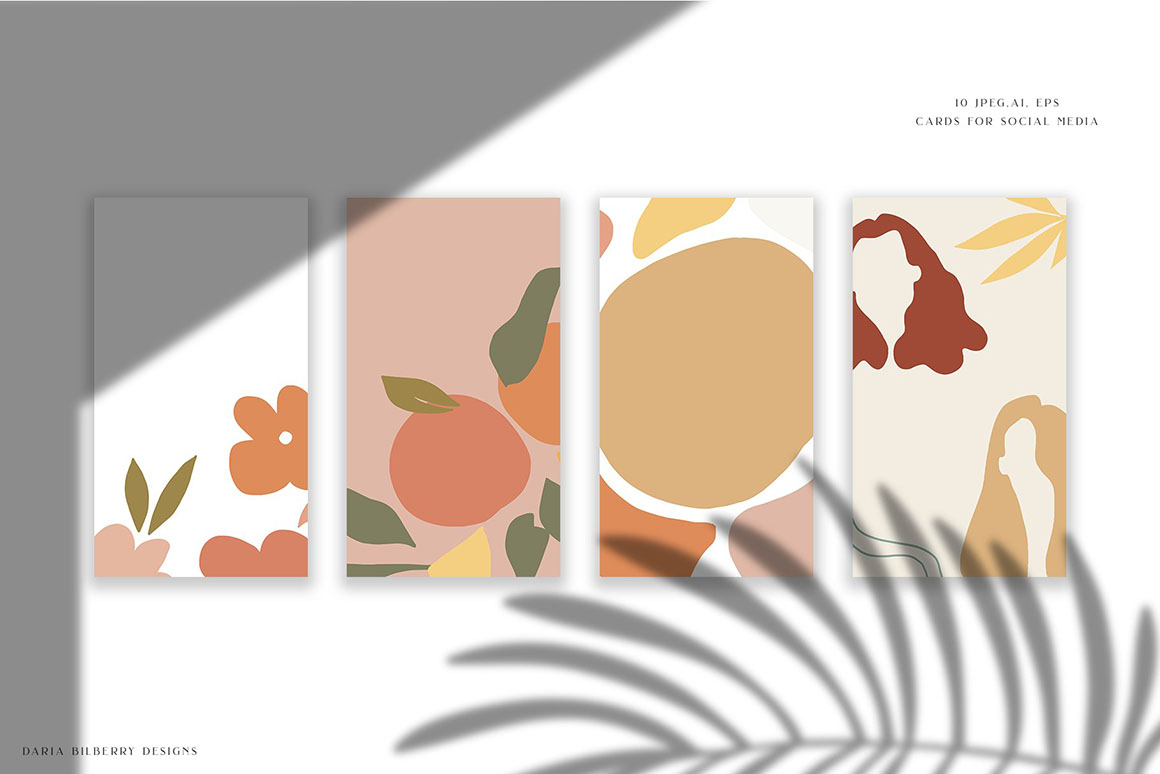 current mood SUMMER Illustration is a great technique for creating really modern, minimalistic illustrations that can be used for a wide variety of applications. current mood SUMMER design set (over 170 elements) filled with individual design elements, girl hairstyle, girl hands, vases, fruits, leaves, social media cards, seamless pattern, compositions, abstract splashes and more.