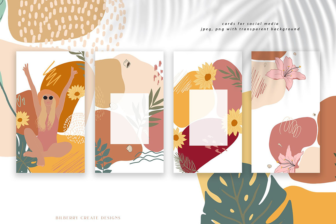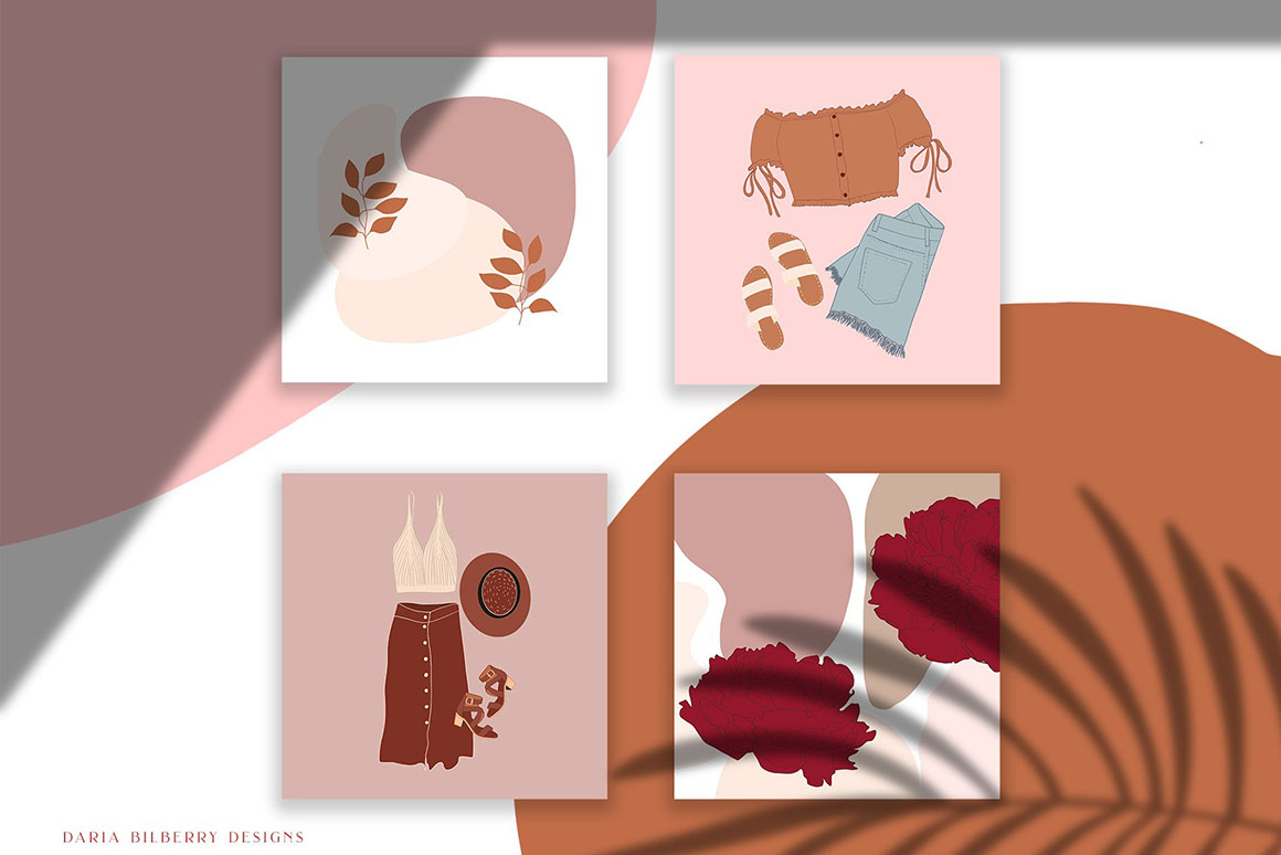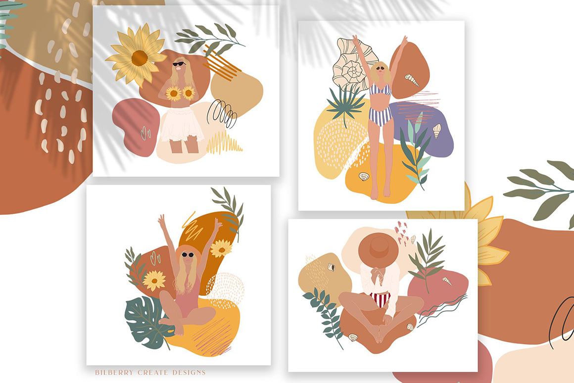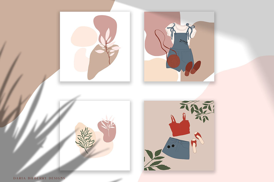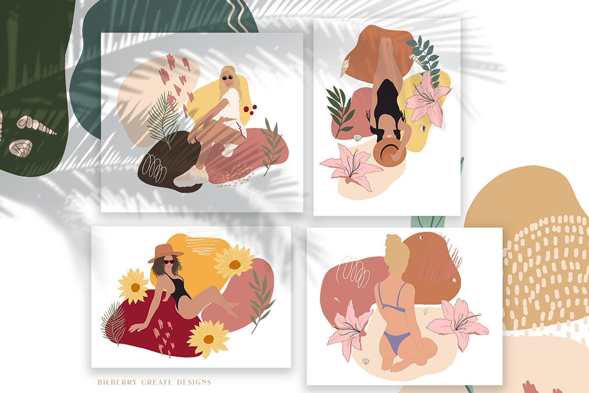 - 4 modern, minimalistic, summer & feminine style illustration sets