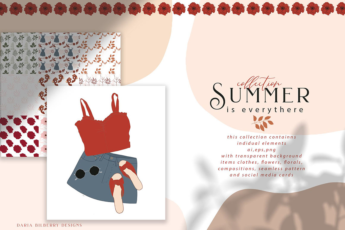SUMMER is everythere Illustration is a great technique for creating really modern, illustrations that can be used for a wide variety of applications. SUMMER is everythere design set filled with individual design elements, items clothes, flowers, florals, compositions, social media cards, seamless pattern, abstract splashes and more.