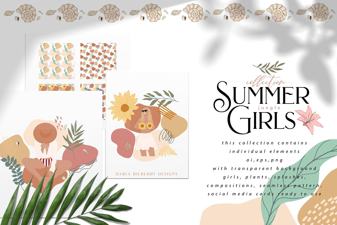I am thrilled to introduce my brand new product Summer jungle Girls. The collection has more than 150 elements, it is perfectly suitable for custom design for your customers or DIY your own stuff just for fun! Summer jungle Girls design set filled with individual design elements, summer girls, plants, splashes, seamless pattern, compositions, social media cards ready to use:)